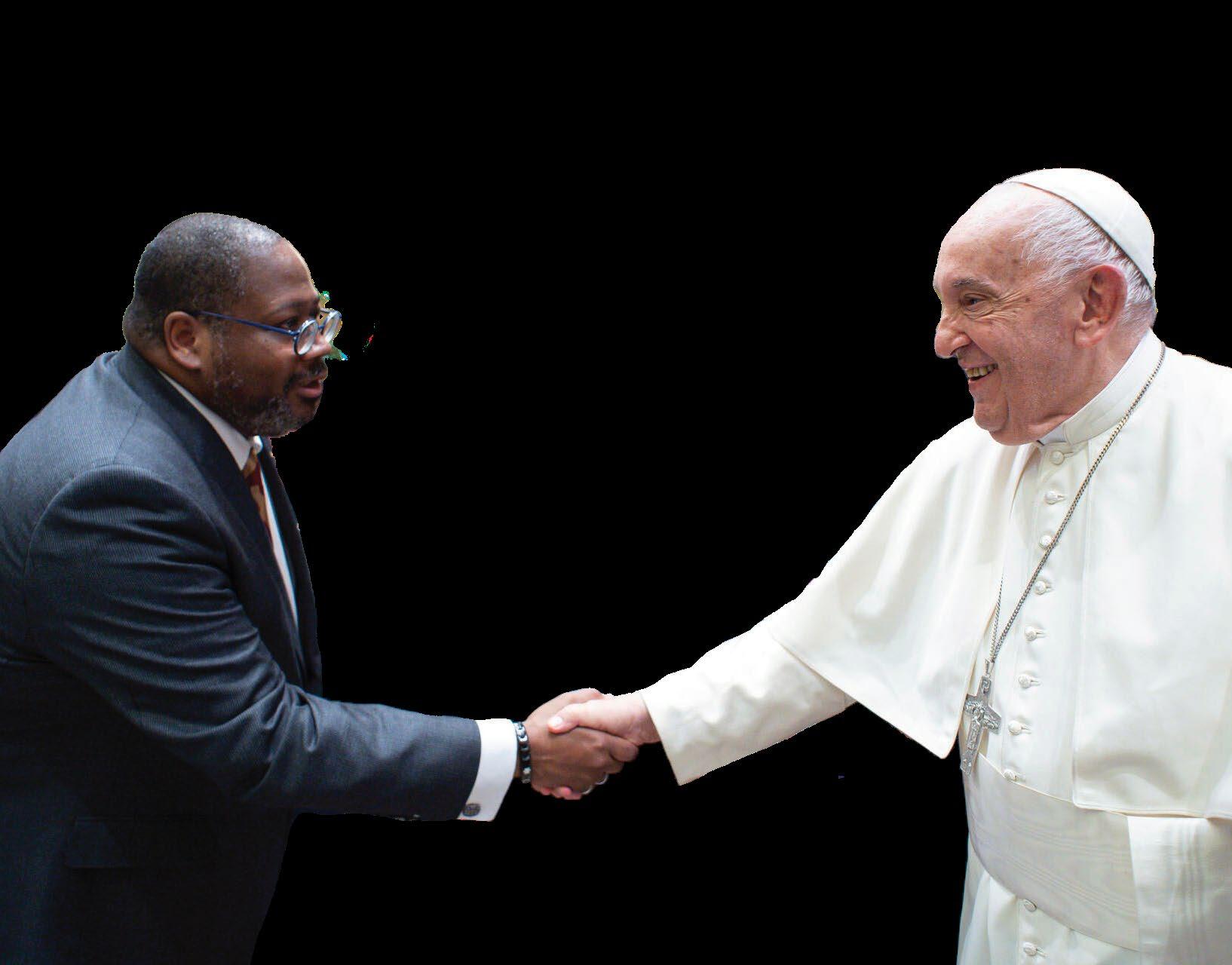 Loyola President Xavier Cole shakes hands with Pope Francis. Courtesy of Cole