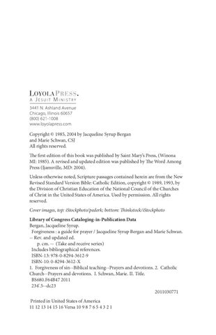 Copyright © 1985, 2004 by Jacqueline Syrup Bergan and Marie Schwan, CSJ All rights reserved. The first edition of this book was published by Saint Mary’s Press, (Winona MI: 1985). A revised and updated edition was published by The Word Among Press (Ijamsville, MD: 2004). Unless otherwise noted, Scripture passages contained herein are from the New Revised Standard Version Bible: Catholic Edition, copyright © 1989, 1993, by the Division of Christian Education of the National Council of the Churches of Christ in the United States of America. Used by permission. All rights reserved. Cover images, top: iStockphoto/pederk; bottom: Thinkstock/iStockphoto Library of Congress Cataloging-in-Publication Data Bergan, Jacqueline Syrup. Forgiveness : a guide for prayer / Jacqueline Syrup Bergan and Marie Schwan. -- Rev. and updated ed. p. cm. -- (Take and receive series) Includes bibliographical references. ISBN-13: 978-0-8294-3612-9 ISBN-10: 0-8294-3612-X 1. Forgiveness of sin--Biblical teaching--Prayers and devotions. 2. Catholic Church--Prayers and devotions. I. Schwan, Marie. II. Title. BS680.F64B47 2011 234'.5--dc23 2011030771 Printed in United States of America 11 12 13 14 15 16 Versa 10 9 8 7 6 5 4 3 2 1
