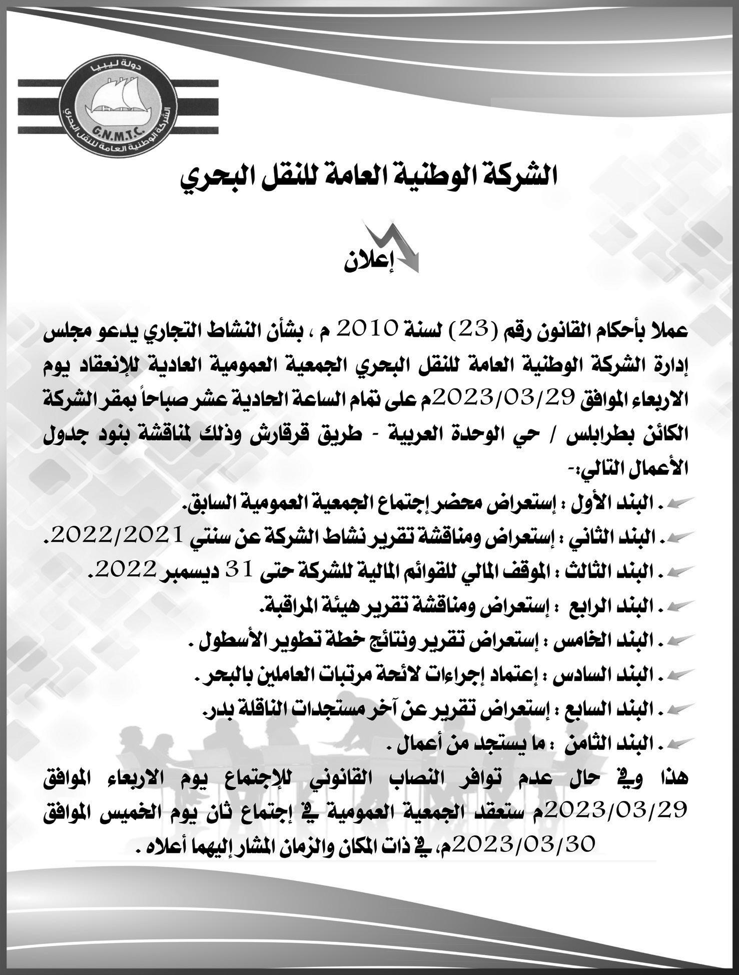 ) 1205 ( ددعلا م 2023 نابعش 13 قفاوملا ـه 1444 نابعش 21 5 ةيمومعلا ةيعملجا عامتجا ديدلجا ليلجا ةكرشل ةيمومعلا ةيعملجا عامتجا ديدلجا ليلجا ةكرشل عامتجا داقعنا نع ةينقتلل ديدلجا ليلجا ةكرش نلعت دقعنلماو م2023 ةنسل يداعلا لولاا ةيمومعلا ةيعملجا م2023 /سرام/14 قفاولما ءاثلاثلا موي للها نذأب ةضباقلا ةكرشلا رقبم احابص ةرشاعلا ةعاسلا ماتم ىلع .سلبارط ةنيدبم تلااصتلال م2020 ، م2019 ( تاونسلا نع ةرادلإا سلجم ريراقت ةشقانمو ضارعتسا -: لولأا دنبلا .)م2022 ، م2021، م2020 ، م2019 ( تاونسلا نع ةبقارلما ةئيه ريراقت ةشقانمو ضارعتسا -: يناثلا دنبلا .)م2022 ، م2021، م 2019 ، م2018( تاونسلا نع يجرالخا عجارلما ريراقت ةشقانمو ضارعتسا -: ثلاثلا دنبلا .)م2020، .)م2020 ، م2019 ، م2018( ةيلالما تاونسلل ةيلالما مئاوقلا ىلع ةقداصلما -: عبارلا دنبلا .) م2020 ، م 2019 ، م 2018 ( ةيلالما تاونسلل حابرلأا عيزوت حرتقم -: سمالخا دنبلا تاونسلل ةيماتلخا تاباسلحاو ةيمومعلا تاينازيلما ةعجارلم يجراخ عجارم ينيعت -: سداسلا دنبلا .)م2023 ، م2022، م2021( ةيلالما . ةبقارلما ةئيهو ةرادلإا سلجم ليكشت ةداعإ -: عباسلا دنبلا نأشب مهاوعد صوصخب ةكرشلا لامع تابلاطم نأشب ةكرشلا ةرادإ سلجم ةركذم -: نماثلا دنبلا .ةيدلايم2021 ةنس يلإ ةيدلايم 2014 ةنس نم ةيلام تاقورف في مهتيقحأ .لامعأ نم دجتسي ام - عساتلا دنبلا نلاــــــــــــــعإ ةمهاسلما تنمسلإل ةيلهلأا ةكرشلا ةمهاسلما تنمسلإل ةيلهلأا ةكرشلا ةــمــهاــســلما تــنــمــسلإــل ةــيــلــهلأا ةــكرــشــلــل ةــيــموــمــعــلا ةــيــعــمــلجا داــقــعــنلإ ةوـــــعد ةيمومعلا ةيعملجا ةمهاسلما تنمسلإل ةيلهلأا ةكرشلا ةرادإ سلجم وعدي موي ةيدلايم 2023 ةنسل لولأا يداعلا اهعامتجا في داقعنلإل ةكرشلل رشع ةيدالحا ةعاسلا دنع يدلايم 2023 03.21 قفاولما ءاثلاثلا -:ةيلاتلا دونبلا ةشقانلم كلذو ،سلبارط ةنيدبم ) رحبلا باب ( قدنفب احابص اذه ةحصل انوناق ررقلما باصنلا لامتكا مدع ةلاح في هنأب املع نيددحلما ةعاسلاو ناكلما سفن في يلاتلا مويلا في عامتجلاا نوكيس عامتجلاا .دونبلا هذه ةشقانلم نلاعلاا اذه في ةكرشلا ةرادإ سلجم
