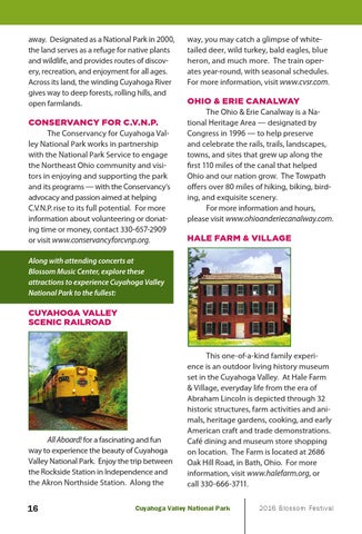 CONSERVANCY FOR C.V.N.P. The Conservancy for Cuyahoga Valley National Park works in partnership with the National Park Service to engage the Northeast Ohio community and visitors in enjoying and supporting the park and its programs — with the Conservancy’s advocacy and passion aimed at helping C.V.N.P. rise to its full potential. For more information about volunteering or donating time or money, contact 330-657-2909 or visit www.conservancyforcvnp.org.