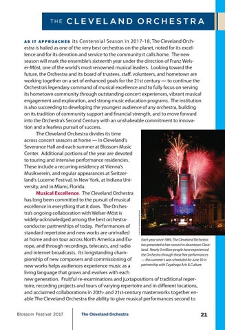 its Centennial Season in 2017-18, The Cleveland Orchestra is hailed as one of the very best orchestras on the planet, noted for its excellence and for its devotion and service to the community it calls home. The new season will mark the ensemble’s sixteenth year under the direction of Franz Welser-Möst, one of the world’s most renowned musical leaders. Looking toward the future, the Orchestra and its board of trustees, staff, volunteers, and hometown are working together on a set of enhanced goals for the 21st century — to continue the Orchestra’s legendary command of musical excellence and to fully focus on serving its hometown community through outstanding concert experiences, vibrant musical engagement and exploration, and strong music education programs. The institution is also succeeding to developing the youngest audience of any orchestra, building on its tradition of community support and financial strength, and to move forward into the Orchestra’s Second Century with an unshakeable commitment to innovation and a fearless pursuit of success. The Cleveland Orchestra divides its time across concert seasons at home — in Cleveland’s Severance Hall and each summer at Blossom Music Center. Additional portions of the year are devoted to touring and intensive performance residencies. These include a recurring residency at Vienna’s Musikverein, and regular appearances at Switzerland’s Lucerne Festival, in New york, at Indiana university, and in Miami, Florida. Musical Excellence. The Cleveland Orchestra has long been committed to the pursuit of musical excellence in everything that it does. The Orchestra’s ongoing collaboration with Welser-Möst is widely-acknowledged among the best orchestraconductor partnerships of today. Performances of standard repertoire and new works are unrivalled Each year since 1989, The Cleveland Orchestra at home and on tour across North America and Euhas presented a free concert in downtown Cleverope, and through recordings, telecasts, and radio land. Nearly 3 million people have experienced and internet broadcasts. Its longstanding chamthe Orchestra through these free performances pionship of new composers and commissioning of — this summer’s was scheduled for June 30 in partnership with Cuyahoga Arts & Culture. new works helps audiences experience music as a living language that grows and evolves with each new generation. Fruitful re-examinations and juxtapositions of traditional repertoire, recording projects and tours of varying repertoire and in different locations, and acclaimed collaborations in 20th- and 21st-century masterworks together enable The Cleveland Orchestra the ability to give musical performances second to photo by RogeR MastRoianni