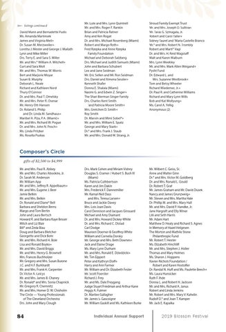 Composer’s Circle gifts of $2,500 to $4,999 Mr. and Mrs. Paul R. Abbey Mr. and Mrs. Charles Abookire, Jr. Dr. Sarah M. Anderson Mr. William App Mr. and Mrs. Jeffrey R. Appelbaum+ Mr. and Mrs. Eugene J. Beer Jamie Belkin Mr. and Mrs. Belkin Dr. Ronald and Diane* Bell Barbara and Sheldon Berns Margo and Tom Bertin John and Laura Bertsch Howard R. and Barbara Kaye Besser Mitch and Liz Blair Bill* and Zeda Blau Doug and Barbara Bletcher Georgette and Dick Bohr Mr. and Mrs. Richard H. Bole Lisa and Ronald Boyko+ Mr. and Mrs. David Briggs Mr. and Mrs. Henry G. Brownell Mrs. Frances Buchholzer Mr. Gregory and Mrs. Susan Bulone J.C. and H.F. Burkhardt Mr. and Mrs. Frank H. Carpenter Dr. Victor A. Ceicys Mr. and Mrs. James B. Chaney Dr. Ronald* and Mrs. Sonia Chapnick Mr. Gregory R. Chemnitz Mr. and Mrs. Homer D. W. Chisholm The Circle — Young Professionals of The Cleveland Orchestra Drs. John and Mary Clough