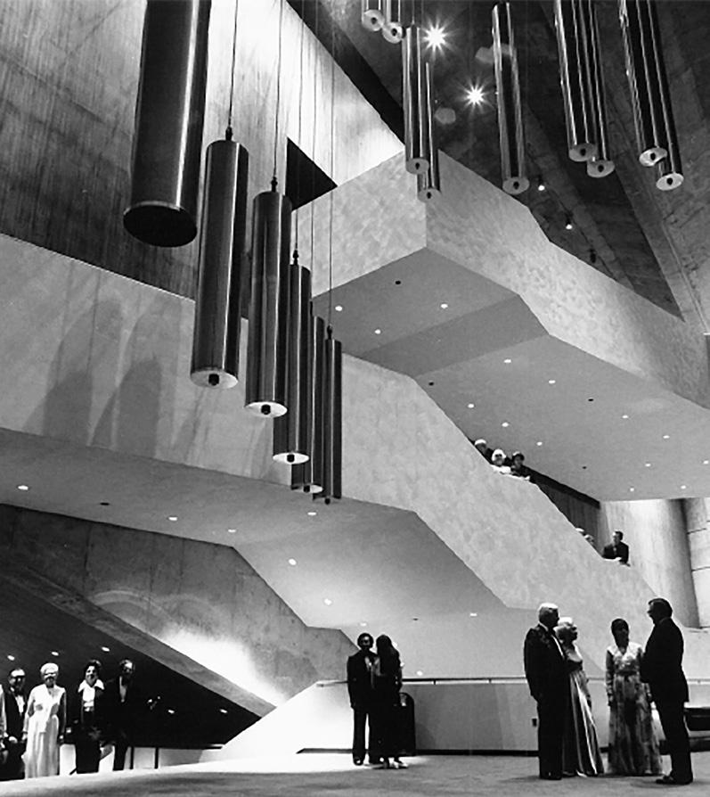 Located in Goodrich Lobby and weighing in excess of 40 tons are the 27 chrome Witzman Counterweights which balance