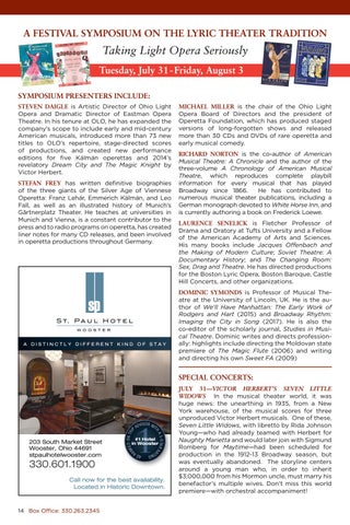 Taking Light Opera Seriously Tuesday, July 31 - Friday, August 3 SYMPOSIUM PRESENTERS INCLUDE: STEVEN DAIGLE is Artistic Director of Ohio Light Opera and Dramatic Director of Eastman Opera Theatre. In his tenure at OLO, he has expanded the company’s scope to include early and mid-century American musicals, introduced more than 73 new titles to OLO’s repertoire, stage-directed scores of productions, and created new performance editions for five Kálmán operettas and 2014’s revelatory Dream City and The Magic Knight by Victor Herbert. STEFAN FREY has written definitive biographies of the three giants of the Silver Age of Viennese Operetta: Franz Lehár, Emmerich Kálmán, and Leo Fall, as well as an illustrated history of Munich’s Gärtnerplatz Theater. He teaches at universities in Munich and Vienna, is a constant contributor to the press and to radio programs on operetta, has created liner notes for many CD releases, and been involved in operetta productions throughout Germany.