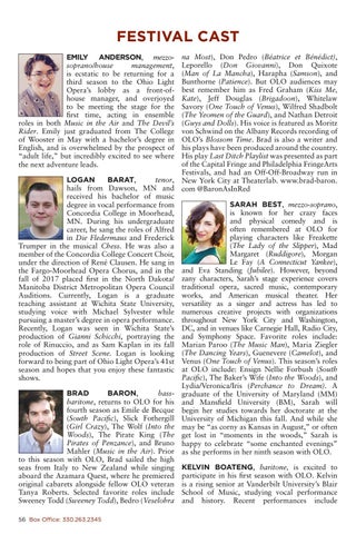 na Most), Don Pedro (Béatrice et Bénédict), Leporello (Don Giovanni), Don Quixote (Man of La Mancha), Harapha (Samson), and Bunthorne (Patience). But OLO audiences may best remember him as Fred Graham (Kiss Me, Kate), Jeff Douglas (Brigadoon), Whitelaw Savory (One Touch of Venus), Wilfred Shadbolt (The Yeomen of the Guard), and Nathan Detroit (Guys and Dolls). His voice is featured as Moritz von Schwind on the Albany Records recording of OLO’s Blossom Time. Brad is also a writer and his plays have been produced around the country. His play Last Ditch Playlist was presented as part of the Capital Fringe and Philadelphia FringeArts Festivals, and had an Off-Off-Broadway run in LOGAN BARAT, tenor, New York City at Theaterlab. www.brad-baron. hails from Dawson, MN and com @BaronAsInRed received his bachelor of music SARAH BEST, mezzo-soprano, degree in vocal performance from is known for her crazy faces Concordia College in Moorhead, and physical comedy and is MN. During his undergraduate often remembered at OLO for career, he sang the roles of Alfred playing characters like Freakette in Die Fledermaus and Frederick (The Lady of the Slipper), Mad Trumper in the musical Chess. He was also a Margaret (Ruddigore), Morgan member of the Concordia College Concert Choir, Le Fay (A Connecticut Yankee), under the direction of René Clausen. He sang in the Fargo-Moorhead Opera Chorus, and in the and Eva Standing (Jubilee). However, beyond fall of 2017 placed first in the North Dakota/ zany characters, Sarah’s stage experience covers Manitoba District Metropolitan Opera Council traditional opera, sacred music, contemporary Auditions. Currently, Logan is a graduate works, and American musical theater. Her teaching assistant at Wichita State University, versatility as a singer and actress has led to studying voice with Michael Sylvester while numerous creative projects with organizations pursuing a master’s degree in opera performance. throughout New York City and Washington, Recently, Logan was seen in Wichita State’s DC, and in venues like Carnegie Hall, Radio City, production of Gianni Schicchi, portraying the and Symphony Space. Favorite roles include: role of Rinuccio, and as Sam Kaplan in its fall Marian Paroo (The Music Man), Maria Ziegler production of Street Scene. Logan is looking (The Dancing Years), Guenevere (Camelot), and forward to being part of Ohio Light Opera’s 41st Venus (One Touch of Venus). This season’s roles season and hopes that you enjoy these fantastic at OLO include: Ensign Nellie Forbush (South Pacific), The Baker’s Wife (Into the Woods), and shows. Lydia/Veronica/Iris (Perchance to Dream). A BRAD BARON, bass- graduate of the University of Maryland (MM) baritone, returns to OLO for his and Mansfield University (BM), Sarah will fourth season as Emile de Becque begin her studies towards her doctorate at the (South Pacific), Slick Fothergill University of Michigan this fall. And while she (Girl Crazy), The Wolf (Into the may be “as corny as Kansas in August,” or often Woods), The Pirate King (The get lost in “moments in the woods,” Sarah is Pirates of Penzance), and Bruno happy to celebrate “some enchanted evenings” Mahler (Music in the Air). Prior as she performs in her ninth season with OLO. to this season with OLO, Brad sailed the high seas from Italy to New Zealand while singing KELVIN BOATENG, baritone, is excited to aboard the Azamara Quest, where he premiered participate in his first season with OLO. Kelvin original cabarets alongside fellow OLO veteran is a rising senior at Vanderbilt University’s Blair Tanya Roberts. Selected favorite roles include School of Music, studying vocal performance Sweeney Todd (Sweeney Todd), Bedro (Veselohra and history. Recent performances include 56 Box Office: 330.263.2345