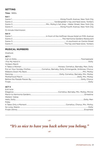 MUSICAL NUMBERS Overture ACT I Call on Dolly................................................................................................................................................Townspeople I Put My Hand In........................................................................................................................................................ Dolly Yonkers March It Takes a Woman................................................................................... Horace, Cornelius, Barnaby, Men, Dolly Put on Your Sunday Clothes......................... Cornelius, Barnaby, Dolly, Ermengarde, Ambrose, Chorus Ribbons Down My Back..............................................................................................................................Mrs. Molloy Dancing.........................................................................................................Dolly, Cornelius, Barnaby, Mrs. Molloy Motherhood March...........................................................................................................................Dolly, Mrs. Molloy Before the Parade Passes By................................................................................................................Dolly, Chorus Finale............................................................................................................................................................................. Dolly ACT II Entr’acte Elegance....................................................................................................Cornelius, Barnaby, Mrs. Molloy, Minnie March to Harmonia Gardens.........................................................................................................................Ernestina Waiters’ Galop Hello, Dolly.........................................................................................................................................................Dolly, Men Polka It Takes Only a Moment........................................................................................ Cornelius, Chorus, Mrs. Molloy So Long, Dearie......................................................................................................................................................... Dolly Finale Ultimo......................................................................................................................................................Ensemble