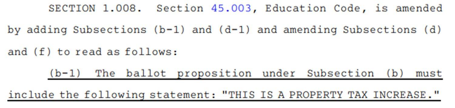 However, in 2019, House Bill 3 was adopted, which requires the below ballot language for all school bond elections, regardless of the actual impact on the district’s tax rate.