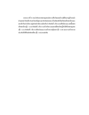 จากตารางที่ 30 พบวาศัก ยภาพของชุมชนตอการเปน โฮมสเตย กรณีศึกษาหมูบานเหลา ตําบลเหลาโพนคอ อําเภอโคกศรีสุพรรณ จังหวัดสกลนคร ดานอัธยาศัยไมตรีของเจาของบานและ สมาชิกในครัวเรือน กลุมตัวอยางมีความคิดเห็นวา อันดับที่ 1 คือ ความเปนมิตรและรอยยิ้มของ เจาของบาน( = 4.14) อันดับที่ 2 คือ การสรางกิจกรรมแลกเปลี่ยนเรียนรูในวิถีชีวิตของชุมชน ( = 4.13) อันดับที่ 3 คือ การตอนรับและการสรางความคุนเคย ( = 4.10) และการสรางความ ประทับใจใหกับนักทองเที่ยว ( = 4.02) ตามลําดับ