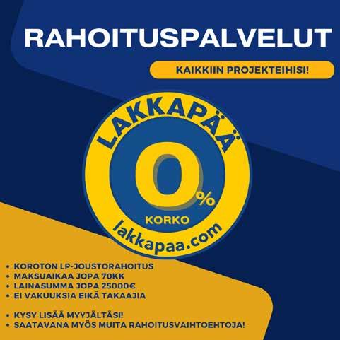 Soita ja kysy lisää Markku Korri 040 5294 570 TAI 4900€ käsirahaa ja loput 430€/kk (60kk) TAI 104€/ kk (60kk) TAI 111€/ kk (60kk) TAI 123€/ kk (60kk) TAI 126€/ kk (60kk) www.lakkapaa.com 24/7 24 Hinnat euroissa. Pidätämme oikeuden muutoksiin mahdollisissa virheissä. Tarjoukset voimassa 10.5.–30.6.2023 – tai niin kauan kuin tavaraa riittää! • KULJETUSPALVELUT • RAHOITUS korko 0% • VERKKOKAUPPA 24/7 lakkapaa.com
