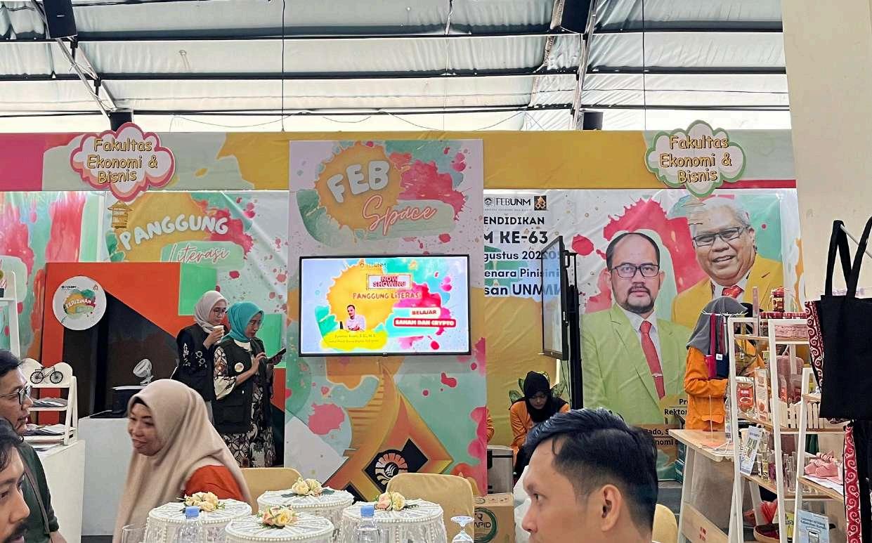 masing-masing prodi, kemudian ada buku-buku dari dosen FEB, kami juga menyediakan layanan perizinan usaha, kemudian terdapat panggung literasi di mana secara berkala dan terjadwal ada beberapa hal yang kami share tentang ekonomi dan bisnis literasi, ada canva model, editing video, saham dan kripto. Setelah itu, ada sudut wirausaha terdapat produk-produk dari mahasiswa FEB yang terdiri dari beberapa kategori seperti teknologi yang menjual produk di aplikasi,” jelasnya.