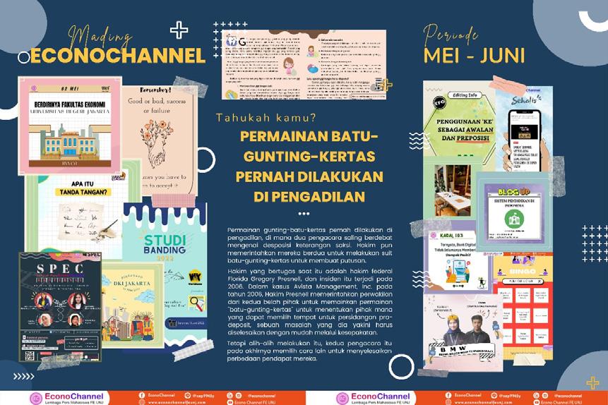 Nah, di sini tempatnya beragam karya anak EC dipajang apalagi kalau bukan mading. Mading atau majalah dinding merupakan salah satu program kerja Biro Kestari yang bersifat internal yang berisi output atau hasil karya dari EconoChannel. Mading sebagai sarana informasi tentang hasil karya yang sudah dikeluarkan oleh seluruh anggota EconoChannel setiap dua bulan sekali.