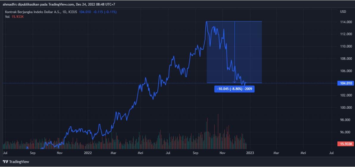 Hal ini ditandai dengan melemahnya kontrak berjangka Dollar Index sebesar 8,8 % ke level 104,01 dari titik tertingginya di level 114,045. Dalam pandangan kami, hal ini disebabkan oleh dedolarisasi yang dilakukan oleh development market seperti India yang membeli minyak dari Rusia menggunakan mata uang lain, seperti Yuan yang dipicu oleh reopening ekonomi China, pasca kebijakan zero Covid oleh presiden Xi Jinping.