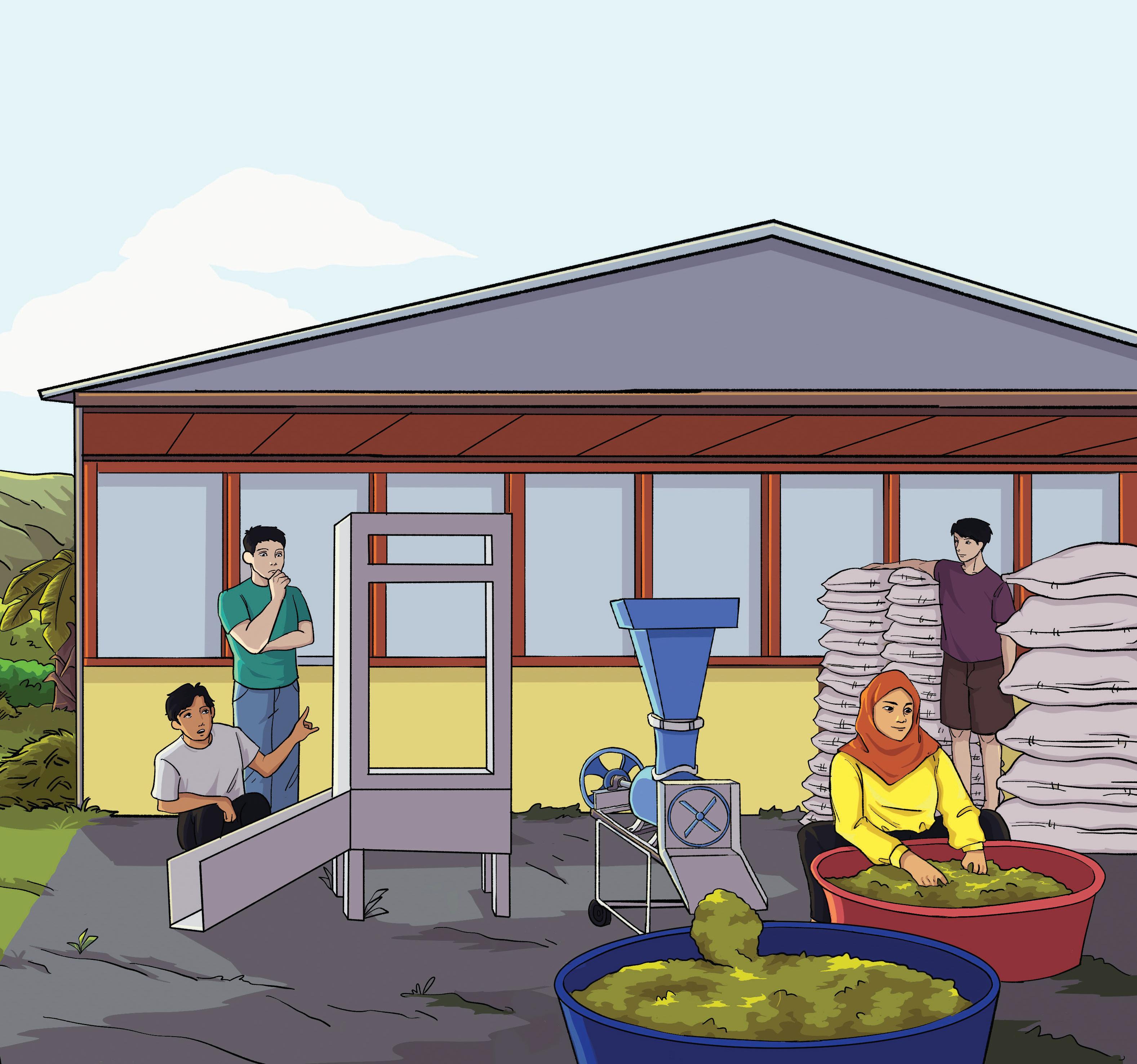 Mekanisme pembuatan pelet protein, Instar 5-6 larva dimasukkan ke penggilingan pelet manual dan dapat dicampurkan dengan klengisan/belondo hasil penggorengan minyak kelapa. Setelah proses penggilingan, hasil pelet dapat dipisahkan dan dikering jemur untuk memperpanjang umur simpan pelet. Proses budi daya dikenalkan dengan fase-fase perkembangan lalat dan cara handling tiap fase. 218 / Teknologi Pelestari