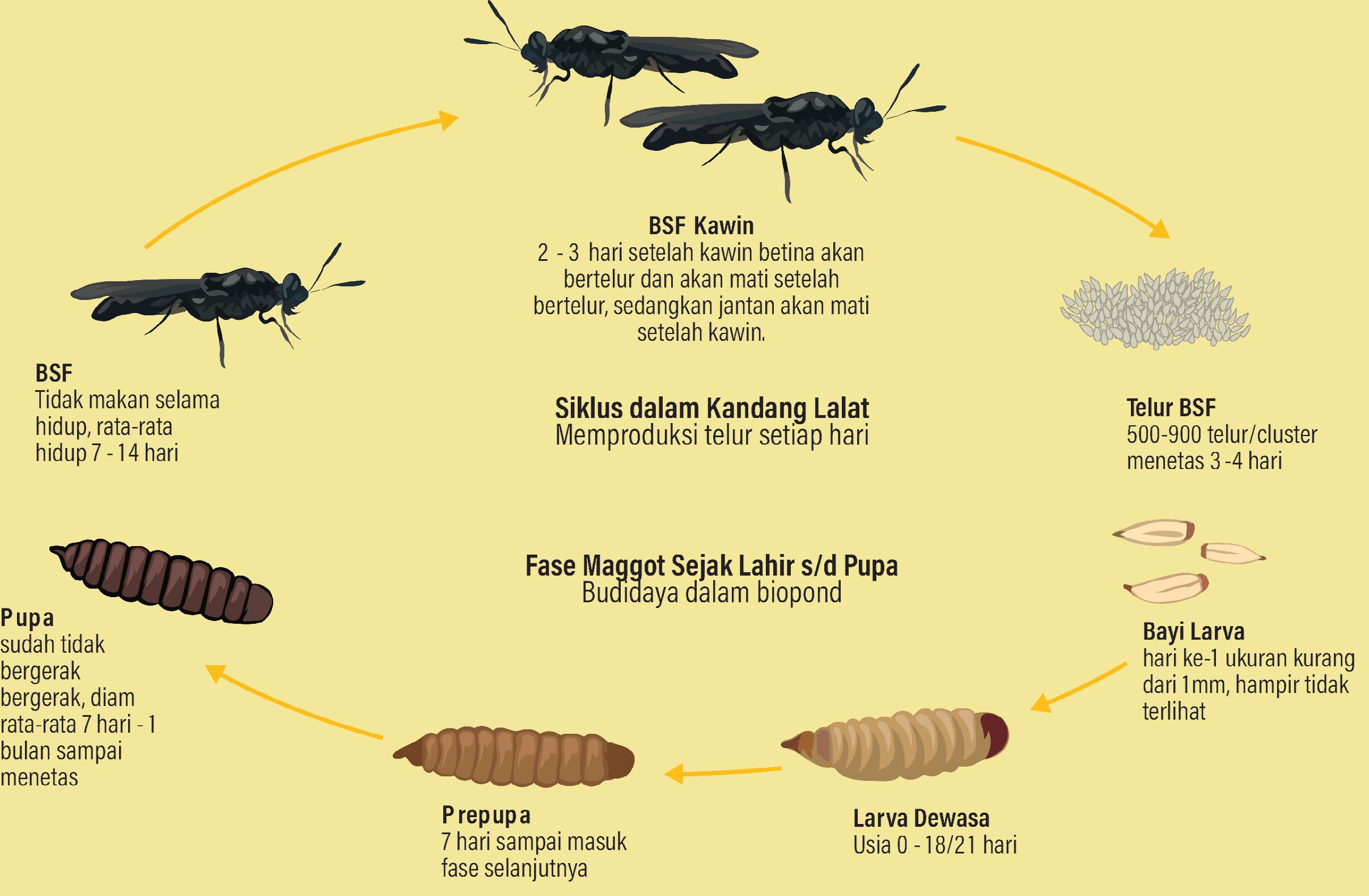 Alat yang dibutuhkan dalam proses ini adalah mesin pelet manual, baki plastik berlubang, love cage atau kandang lalat portabel. Sementara, untuk bahan membutuhkan telur BSF larva Instar 5-6 ambas sisa perasan santan. Mekanisme budi daya BSF adalah sebagai berikut, pertama-tama BSF dengan berbagai fase dimasukkan pada kandang yang sesuai.