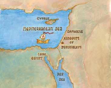 Your eyes are red and itchy! It is difficult to see through the cloud of dust that has been kicked up by the many horses galloping across the dry desert land. Your mouth is parched and dry. Two years have passed since you left your father’s country home and the beautiful rolling hills of your homeland. In that time you have been traveling across land and sea. You have experienced incredibly hot and cold climates. You have recovered from disease—you are one of the lucky ones for sure. You wear a red cross on your shirt of armor, and you carry a flag that bears the same emblem. Some of the men you travel with fought alongside King John’s brother, Richard the Lion-Hearted. Like all Christian crusaders, it is your intention to help recapture the city of Jerusalem in the Holy Land. Crusaders traveled to the Middle East and North Africa.
