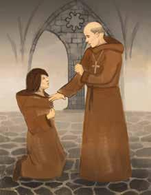Life within a monastery certainly is hard. However, you are assured of a place to sleep, clothing, food, medical care, and an education. Your training will take many years. When you start your training, you are called a novice, another word for beginner. You begin by learning to read and write. You study texts from the Bible, pray, and learn to farm or to acquire a certain skill. If, at the end of your training, you are certain you want to join the Church, you take part in a special ceremony. In this ceremony, you vow, or promise, to dedicate your life to God. You also vow not to marry, and to live a humble and obedient life. Then, the top of your head is shaved, identifying you as a monk.