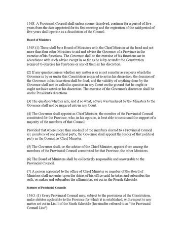 154F.(1) There shall be a Board of Ministers with the Chief Minister at the head and not more than four other Ministers to aid and advise the Governor of a Province in the exercise of his functions. The Governor shall in the exercise of his functions act in accordance with such advice except in so far as he is by or under the Constitution required to exercise his functions or any of them in his discretion. (2) If any question arises whether any matter is or is not a matter as respects which the Governor is by or under this Constitution required to act in his discretion, the decision of the Governor in his discretion shall be final, and the validity of anything done by the Governor shall not be called in question in any Court on the ground that he ought or ought not have acted on his discretion. The exercise of the Governor's discretion shall be on the President's directions. (3) The question whether any, and if so what, advice was tendered by the Ministers to the Governor shall not be inquired into in any Court. (4) The Governor shall appoint as Chief Minister, the member of the Provincial Council constituted for the Province, who, in his opinion, is best able to command the support of a majority of the members of that Council: Provided that where more than one-half of the members elected to a Provincial Council are members of one political party, the Governor shall appoint the leader of that political party in the Council as Chief Minister. (5) The Governor shall, on the advice of the Chief Minister, appoint from among the members of the Provincial Council constituted for that Province, the other Ministers. (6) The Board of Ministers shall be collectively responsible and answerable to the Provincial Council. (7) A person appointed to the office of Chief Minister or member of the Board of Ministers shall not enter upon the duties of his office until he takes and subscribes the oath, or makes and subscribes the affirmation, set out in the Fourth Schedule. Statutes of Provincial Councils