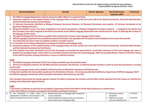 3. The Official Language Department conducts classes for public officers on a payment basis. 4. Awareness programs on the Implementation of the Language Policy are been carried out to the staff of the District Secretariats, Provincial Administration and the Divisional Secretariats by the Ministry. 5. 72 Divisional Secretariats identified as Bilingual Divisional Secretariat Divisions. 41 Divisional Secretariats were gazette, 31 Divisions Secretariats to be gazetted as Bilingual Divisions. 6. Bilingual Facilitation Centers have been established in the District Secretariats. A National Integration Promotion Assistant is assigned to the district and two translators have been assigned to the District Secretariat by the Official Language Department who would assist the citizen in obtaining the services of the language of their choice. 7. Through the Bilingual Cells the citizens would be able to obtain their services in the language of their choice. 8. Official Languages Department has established a panel of translators and uploaded with the details of the translators in the service they provide. 9. The initial steps have been taken to establish an Online Translation Service. 10. A Translation Unit is being established by recruiting of Graduates with language skills. 11. Awareness programs on the Implementation of the Language Policy are been carried out to the staff of the District Secretariats, Provincial Administration and the Divisional Secretariats by the Ministry. 12. Police Stations have been instructed to ensure that the people are provided the opportunity to record their statement in their own language and same is posted in the Complaint Book. Police officers are provided extensive training in the second language. NILET has provided Master Trainers to Provide Training to the staff of the Police training institutions to ensure an effective training. 9.248 1. The Official Languages Commission (OLC), Act is being amended as per the directions given. 2. The OLC has delegated authority for the NIPA Assistants presently in the Districts, to attend to specific functions in order to assist the Commission in carrying out the work. 3. Provincial Languages Centers to be establish in three Provinces in Kilinochchi, Ratnapura and Polonnaruwa. 4. Kilinochchi would be the Centre which would cater for the Northern Province. All services provided by the Ministry, Department of Official Languages, NILET and Official Languages Commission will be provided at this Centre will function by July 2013. (The Canadian Government has already agreed to donate 25 million to purchase the furniture and 24 million will be obtained from the treasury to refurbish the building of the Kilinochchi regional Centre). 9.250 1. Discussion is underway to look into the possibility to appointing retired Tamil officers to the Police Stations on a contract basis. 2. New Tamil Officers recruited are assigned to the Northern and Eastern Provinces. 5.
