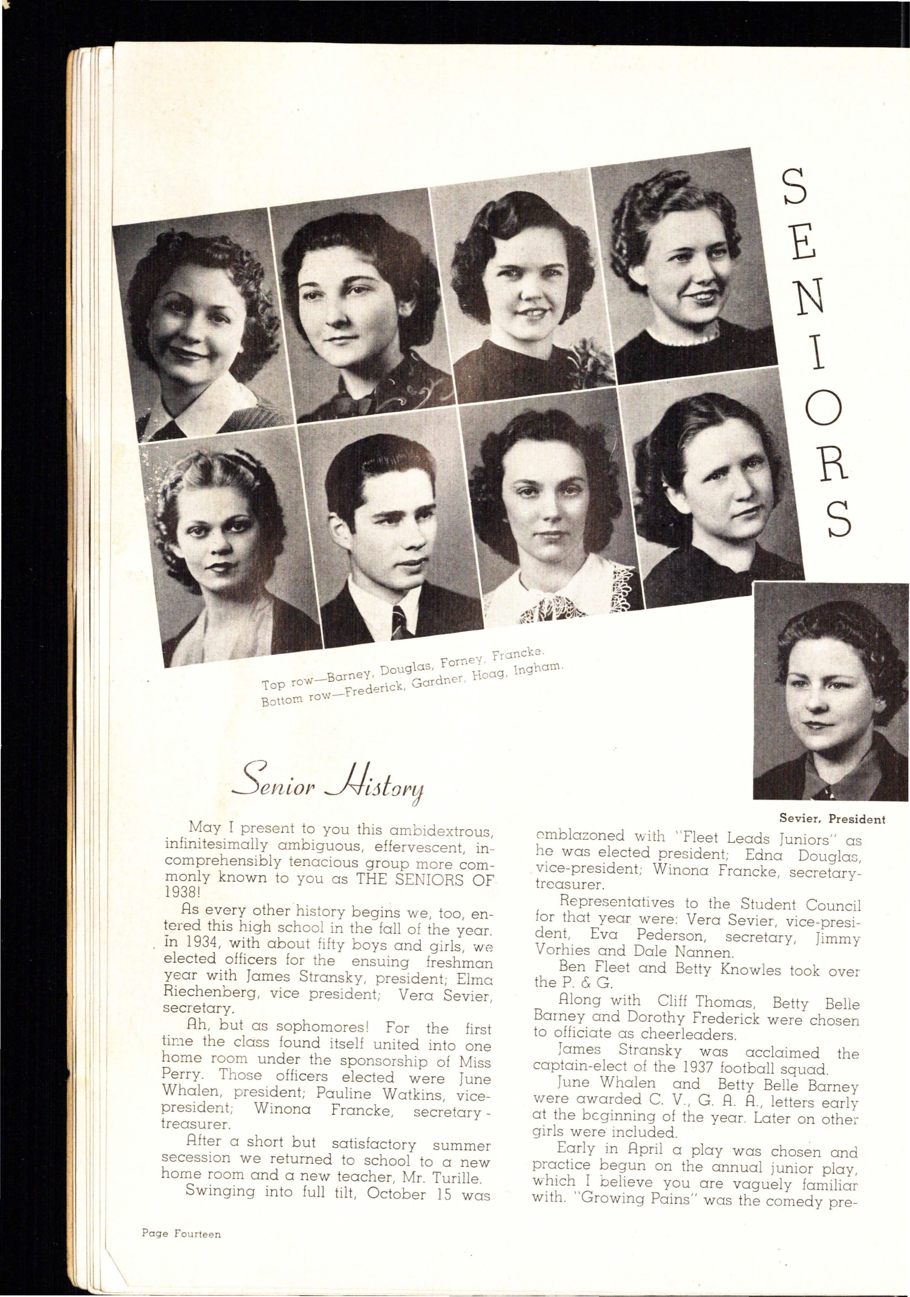 The 193 8 Viewpo int is the twelft h annual produced by C. V seniors. It follows t h e magaz ine precedent s e t b y the class o f ' 35 Howeve r , there ar e m ore pictures, more c a ndid shots tha n ever issued in a V iewpo int . Th e Bu s iness Men 's Section is an entire ly n e w s lant on advertising and by its intro d u ction into the 1938 annual we hope t o support our local business men in a novel and interesting way, and p e rh aps to create a new attitude toward fu ture advertising.