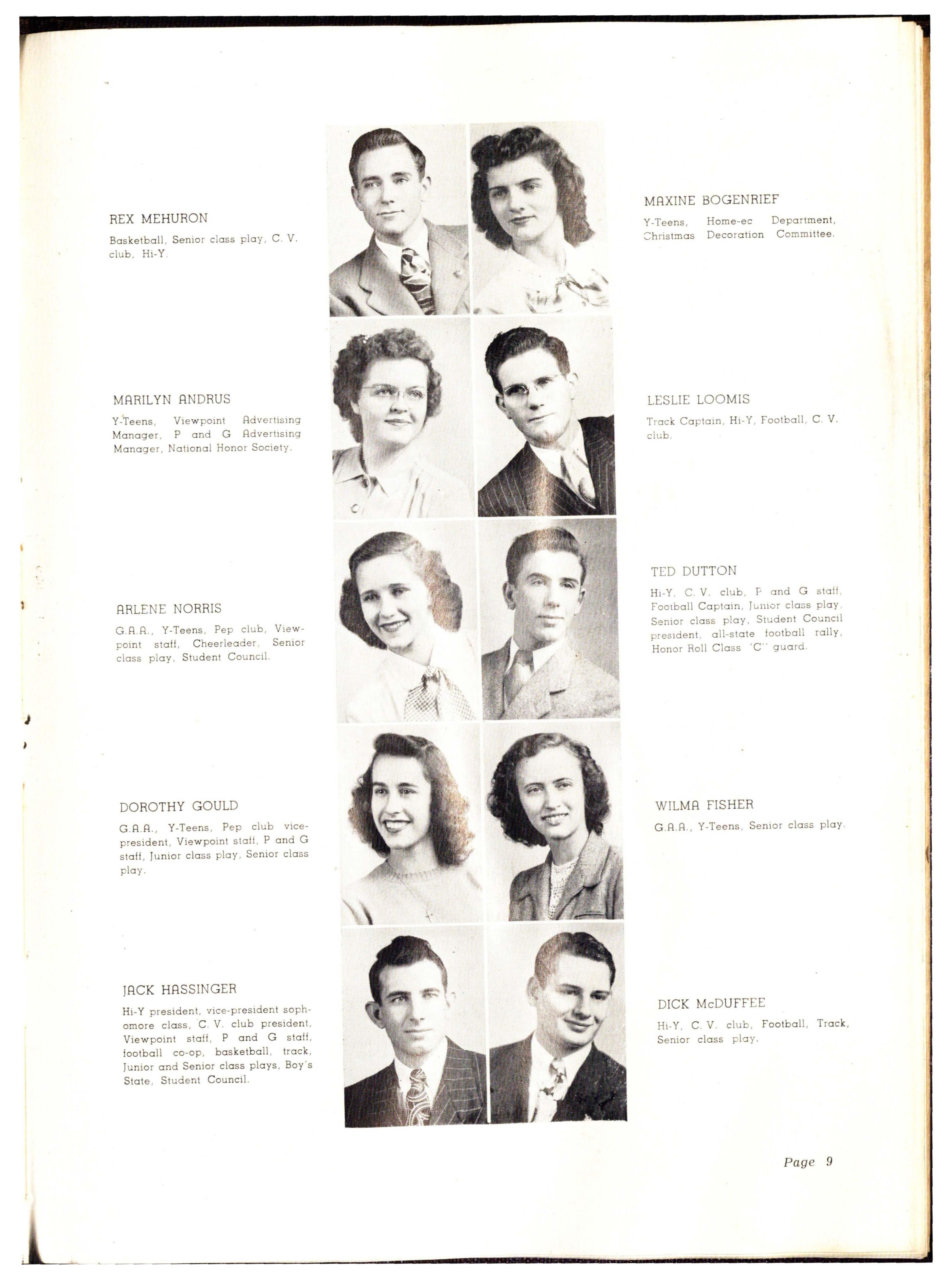 NINT H-On the morning of Sept. 6 , 1944 , forty-fi ,•r of u s returne d as Fr eshme n and trompe d up the stair. to find Mi ss Scott as home room teacher and M rs Brant as spo nsor. Beverly Bauman was elected Pr e s ident , Jayne Vorhies, Vice-Pre siden t and Ted Dutto r secretary-treasurer. Thi s was the y ear we boys we r. · all out for sports, almost all representing us in ever : sport. At the end of the year, because we knew W E. would no longer be in junior high , we gave a bi g dinner for all teachers and our par ents. We enjoye d our last year in junior high and w e lo oked forward to the big moment of enter ing senior hi gh.