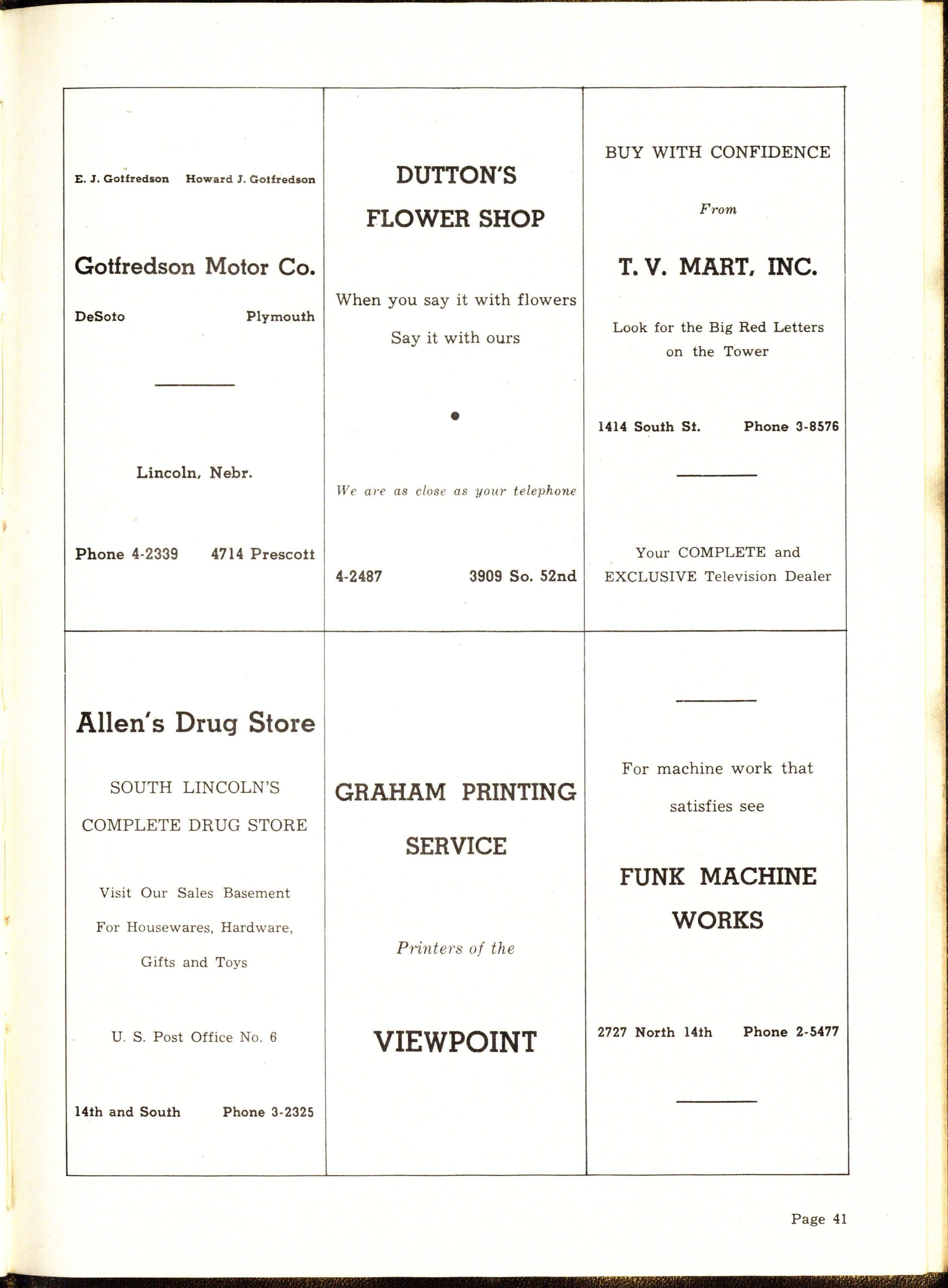 E. J. Gotfredson Howard J. GoUredson G otfreds on Motor Co. DeSoto Plymouth Lincoln, Nebr. Phone 4-2339 4714 Prescott Allen's Drug Store SOUTH LINCOLN 'S COMP LETE DRUG STORE Visit Ou r Sa les Basement For Housewares , Hardware , Gifts and To ys U. S. Post Offi ce No. 6 14th and South Phone 3-2325 DUTTON'S FLOWER SHOP When you say it with flowers Say it with ours • We are as clos e as your telephone BUY WITH CONFIDENCE From T. V. MART, INC. Look for the Big Red Letters on the Tower 1414 South St. Phone 3-8576 Your COMPLETE and 4-2487 3909 So. 52nd EXCLUSIVE Television Dealer GRAHAM PRINTING SERVICE P rinters of the VIEWPOINT For machine work that satisfies see FUNK MACHINE WORKS 2727 North 14th Phone 2-5477 Page 41