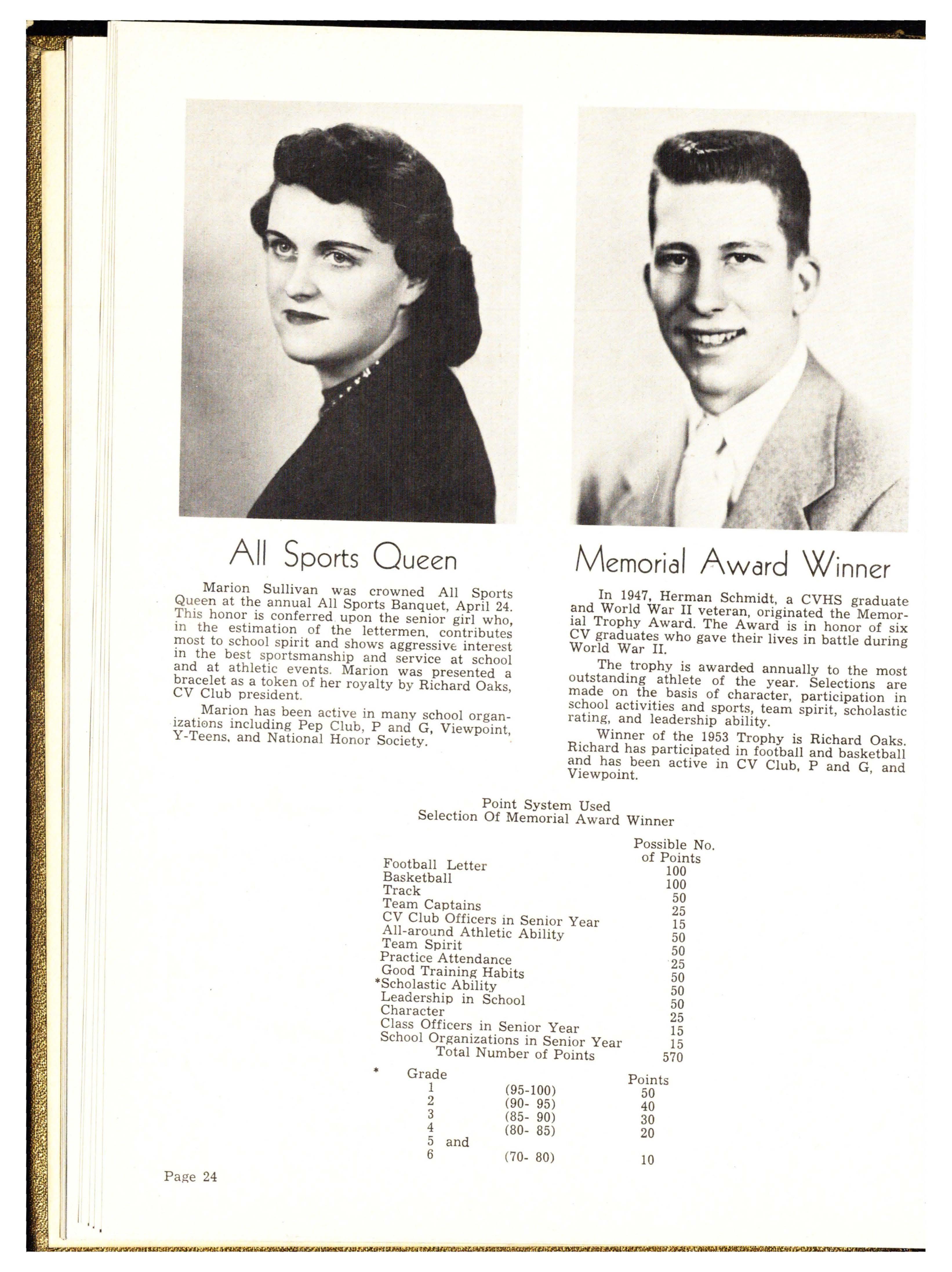Marion Sullivan was crowned Health Queen , and Louis Meinecke was crowned Health King of 1953. The senior girl and boy whose health records were the best throughout their high school days reigned over the health day ceremonies.