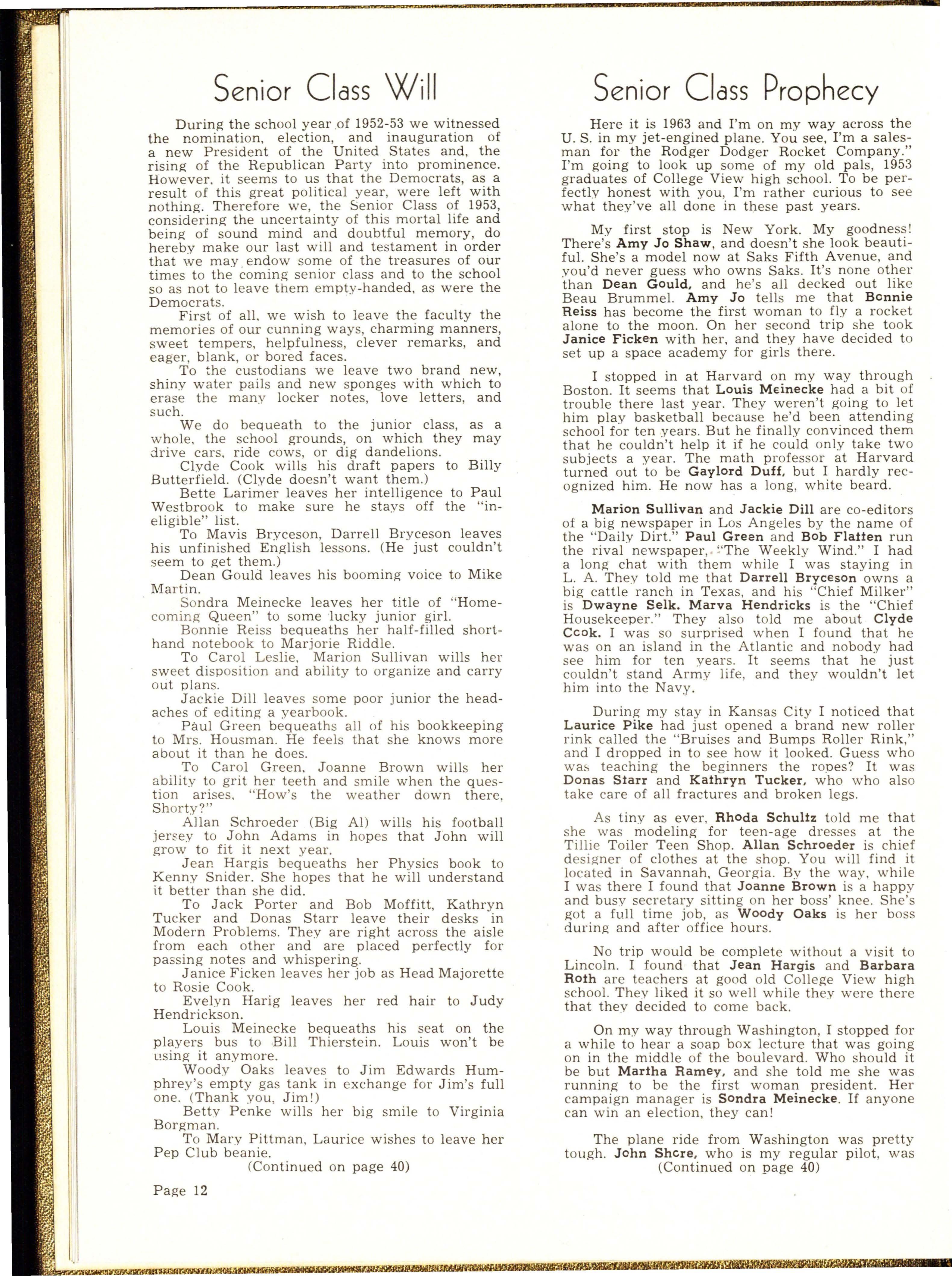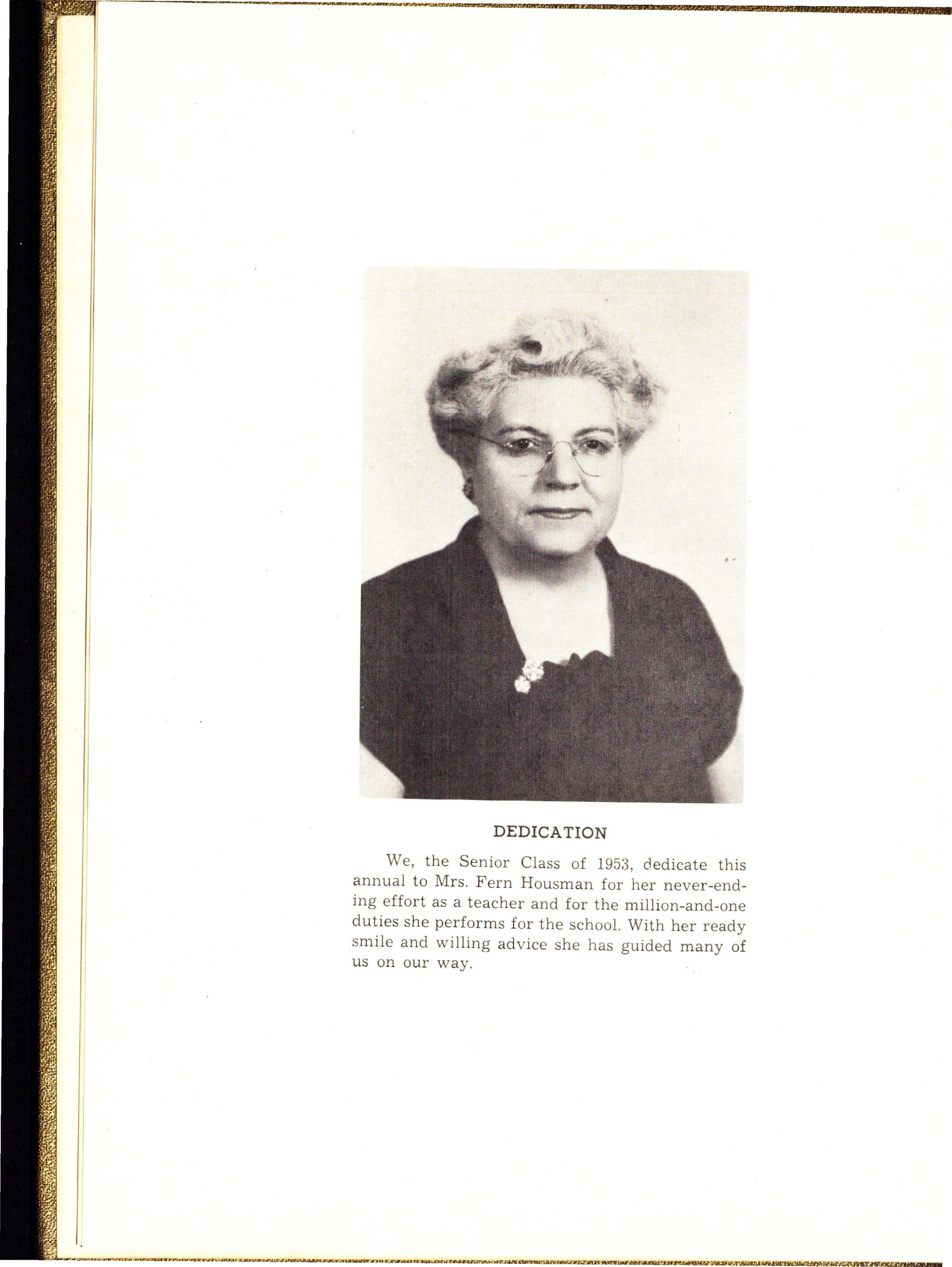 We, the Senior Class of 1953, dedicate this annual to Mrs. Fern Housman for her never-ending effort as a teacher and for the million-and-one duties she performs for the school. With her ready smile and willing advice she has guided many of us on our way.
