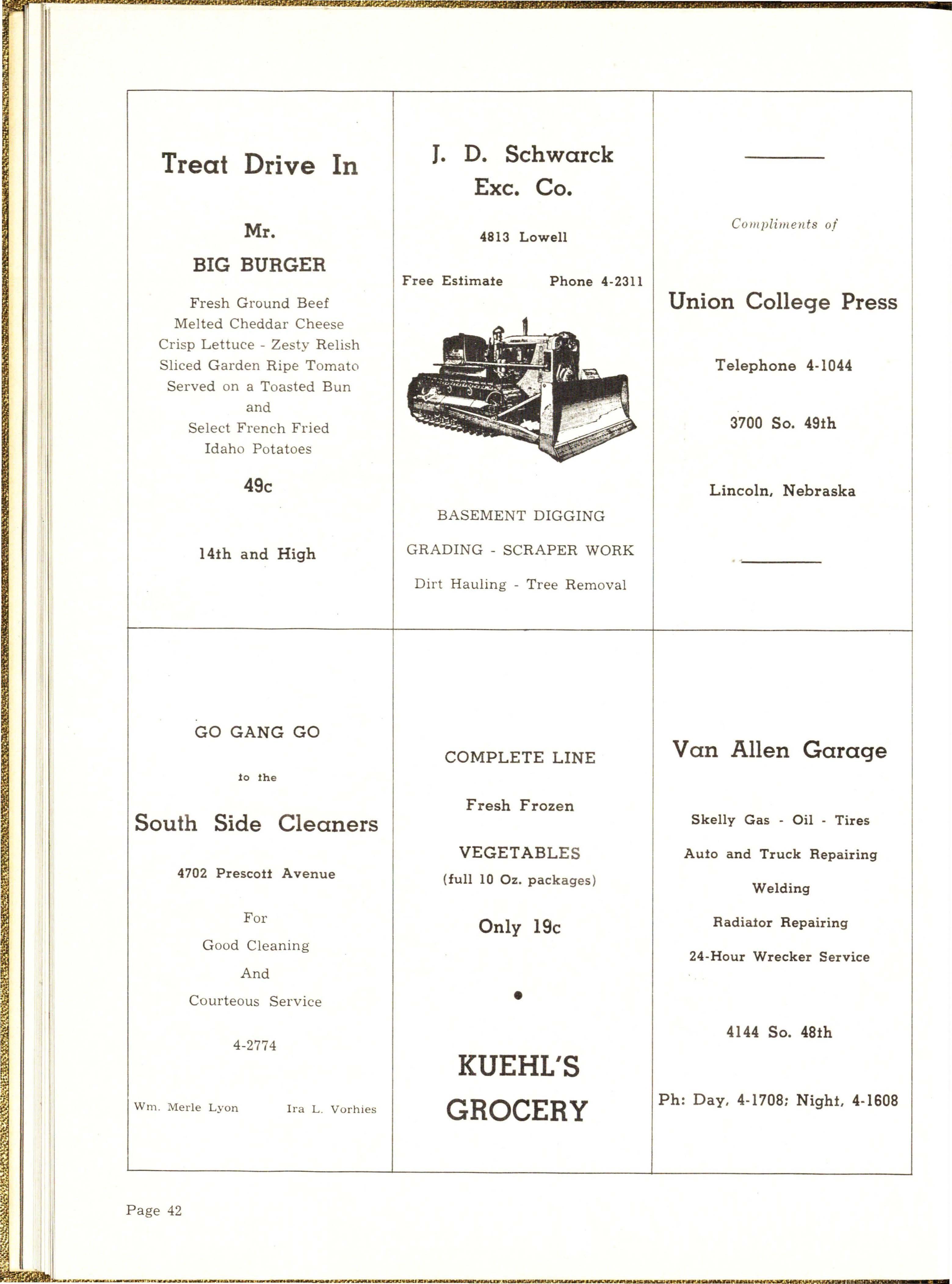 Mr. BIG BURGER F resh Ground Beef Melted Cheddar Cheese Crisp Lettuce - Zesty Relish Sliced Garden Ripe Tomato Served on a Toasted Bun and Select French Fried Idaho Potatoes 49c 14th and High GO GANG GO to th e Sou th Side Cleaners 4702 Prescott Av en ue For G ood Cleaning And Courteous Service 4 - 2774 Wm. Merle Lyon Ira L. Vorhies Pa ge 42 J. D. Schwarck Exe. Co. 4813 Lowell F r ee Estimate Phone 4-2311 BASEMENT DIG G IN G GRADING - S C R A P E R W ORK Dirt H auli n g - Tree R emoval COMPLETE LINE Fresh Frozen VEGETAB LES (full 10 Oz. pa ckages) Only 19c • KUEHL'S GROCERY ~rr P"a Ft fli ~asCompliments of Union College Press Telephone 4-1044 3700 So. 49th Lincoln, Nebraska Van Allen Garage Skelly Gas - Oil - Tires Auto and Truck Repairing Welding Radia t or Repairing 24-Hour Wrecker Service 41 44 So. 48th Ph : D ay , 4- 1708 ; Night, 4-1608 .lliff:'l~~