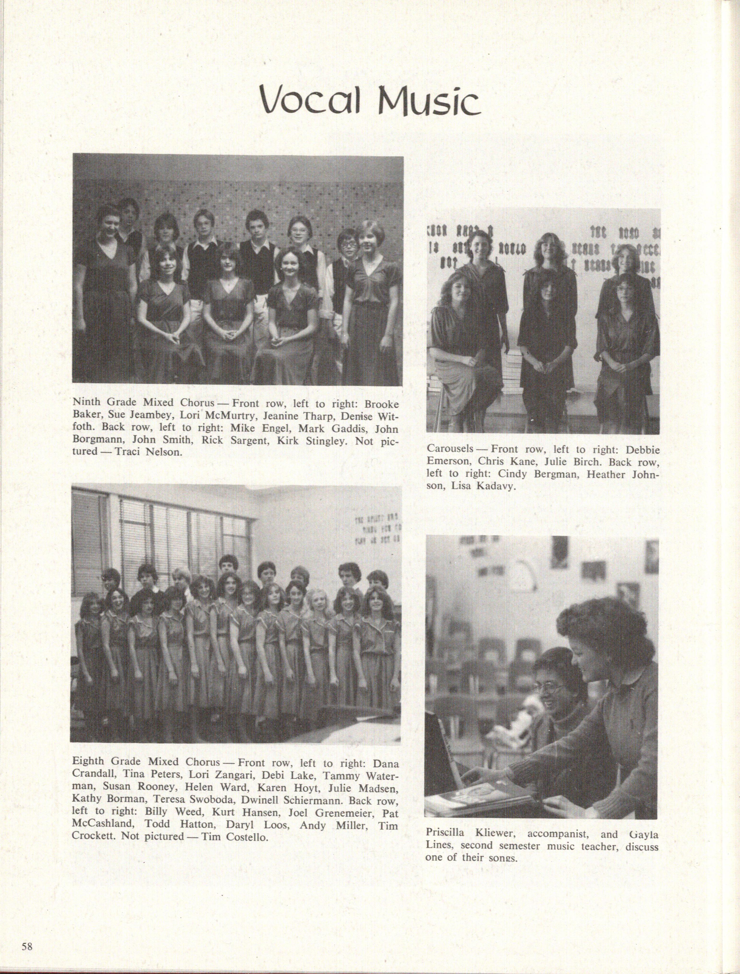Eighth Grade Mixed Chorus - Front row, left to right: Dana Crandall, Tina Peters, Lori Zangari, Debi Lake, Tammy Waterman, Susan Rooney , Helen Ward, Karen Hoyt, Julie Madsen, Kathy Borman, Teresa Swoboda, Dwinell Schiermann. Back row, left to right: Billy Weed, Kurt Hansen, Joel Grenemeier, Pat McCashland, Todd Hatton, Daryl Loos, Andy Miller, Tim Crockett. Not pictured-Tim Costello.