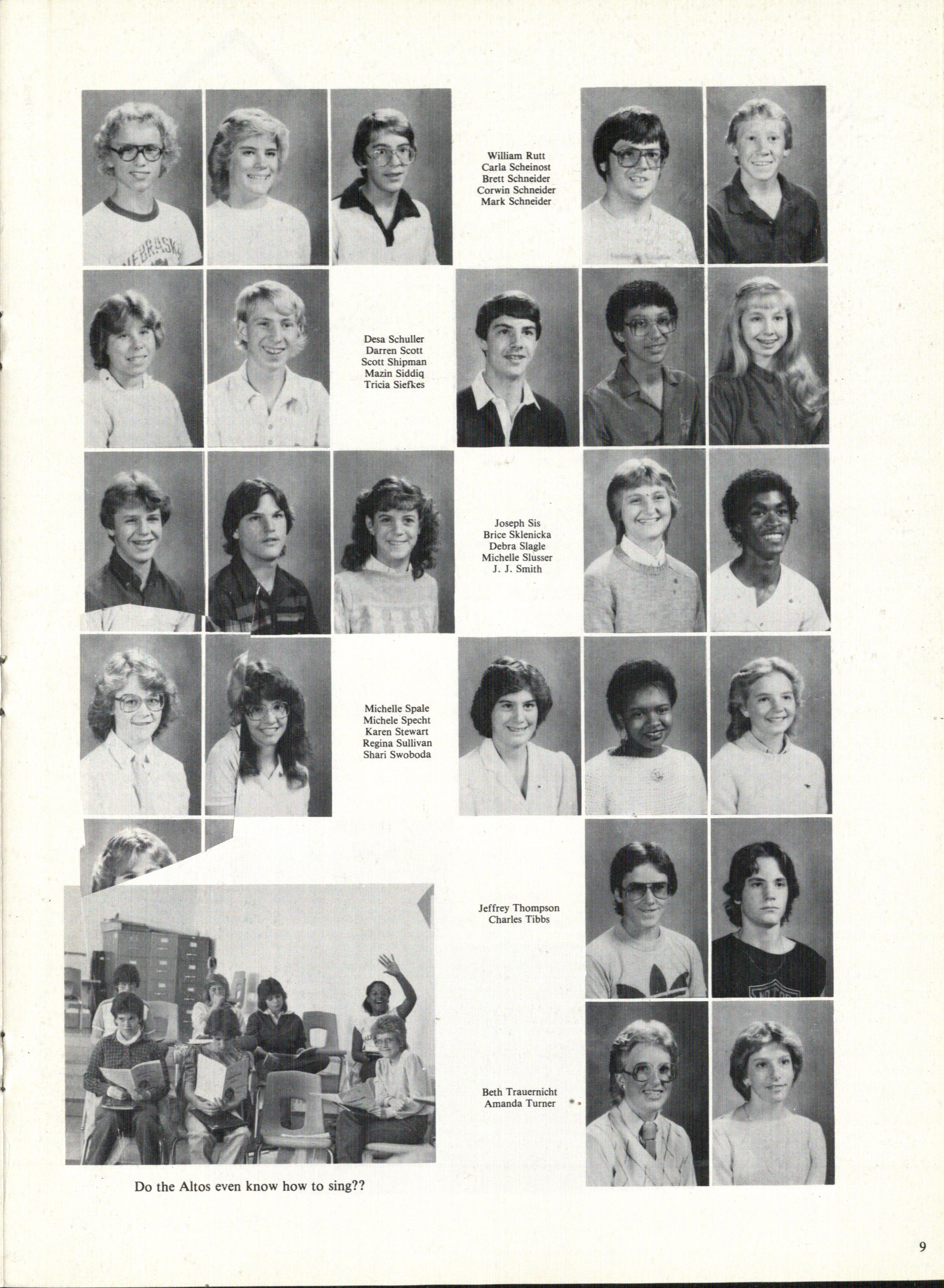 Show Choir-Front row , left to right : Diane Frohn , Eric Mason. Second row : Jackie Woolhiser, Debbie Witfoth. Th i rd row : Gary Osborne , Beth Lechtenberger , Mark Schneider , Kelly Will , Di rk Baker. Fourth row : Scott Davis , Carla Scheinost , Ken Pittman, Michelle Spa l e , M ike Oehm