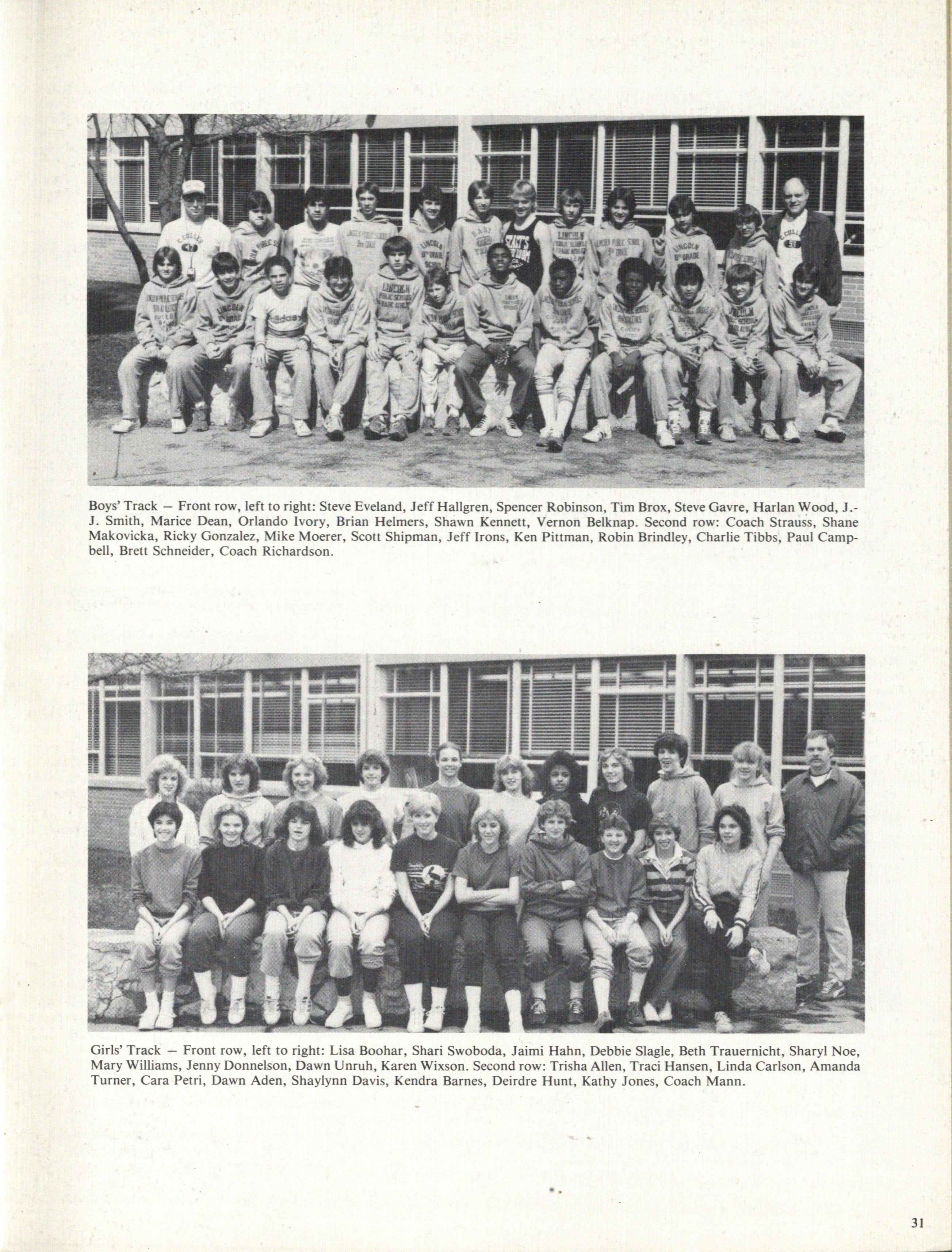 Boys' Track - Front row, left to right: Steve Eveland, Jeff Hallgren, Spencer Robinson, Tim Brox, Steve Gavre, Harlan Wood, J .J. Smith, Marice Dean, Orlando Ivory, Brian Helmers, Shawn Kennett, Vernon Belknap. Second row: Coach Strauss, Shane Makovicka, Ricky Gonzalez, Mike Moerer, Scott Shipman, Jeff Irons, Ken Pittman, Robin Brindley, Charlie Tibbs, Paul Campbell, Brett Schneider, Coach Richardson.
