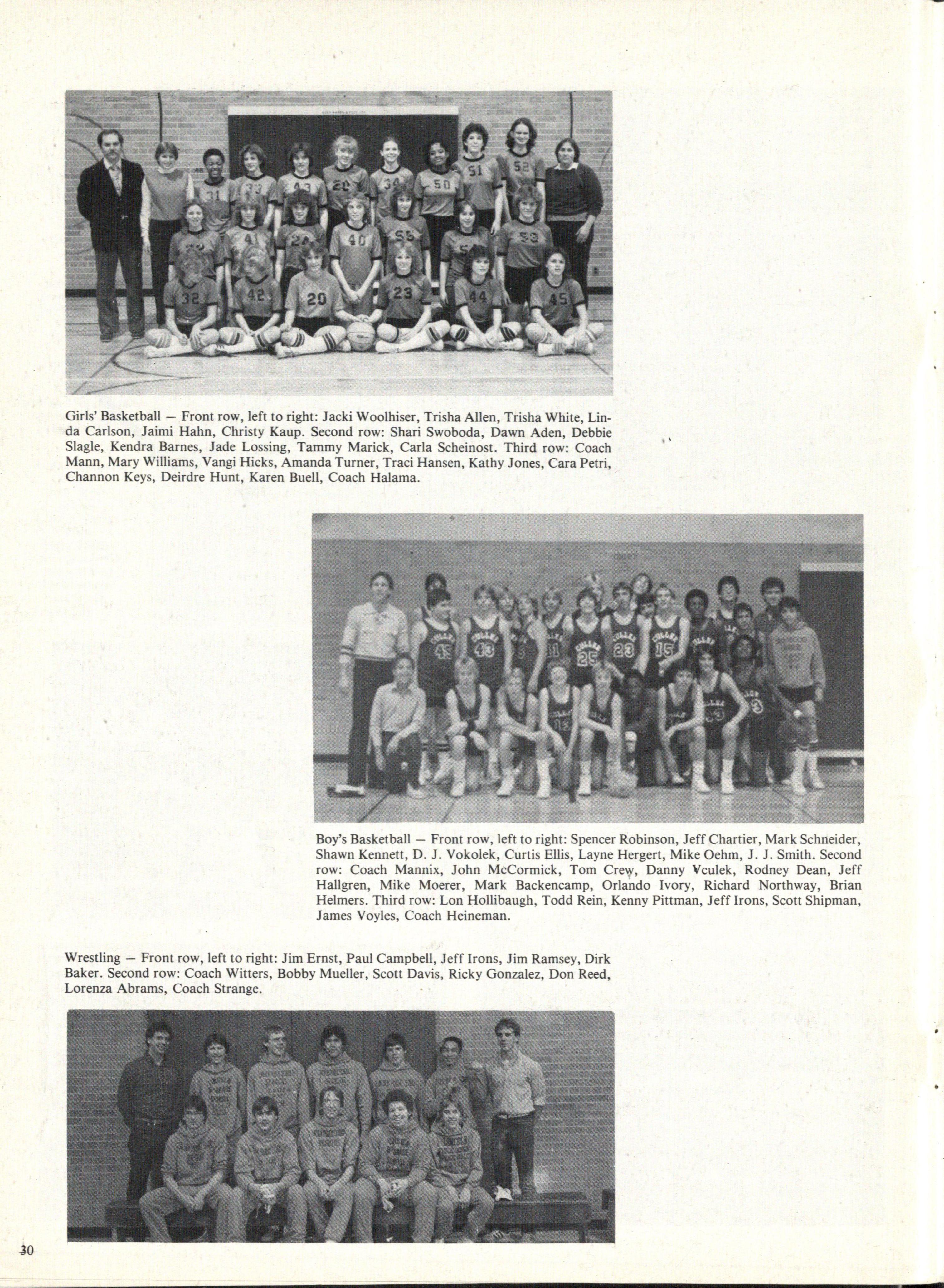 Boy's Basketball - Front row, left to right: Spencer Robinson, Jeff Chartier, Mark Schneider, Shawn Kennett, D. J. Vokolek, Curtis Ellis, Layne Hergert, Mike Oehm, J. J. Smith Second row: Coach Mannix, John McCormick, Tom Cre\)', Danny Vculek, Rodney Dean, Jeff Hallgren, Mike Moerer, Mark Backencamp, Orlando Ivory, Richard Northway, Brian Helmers. Third row: Lon Hollibaugh, Todd Rein, Kenny Pittman, Jeff Irons, Scott Shipman, James Voyles, Coach Heineman.