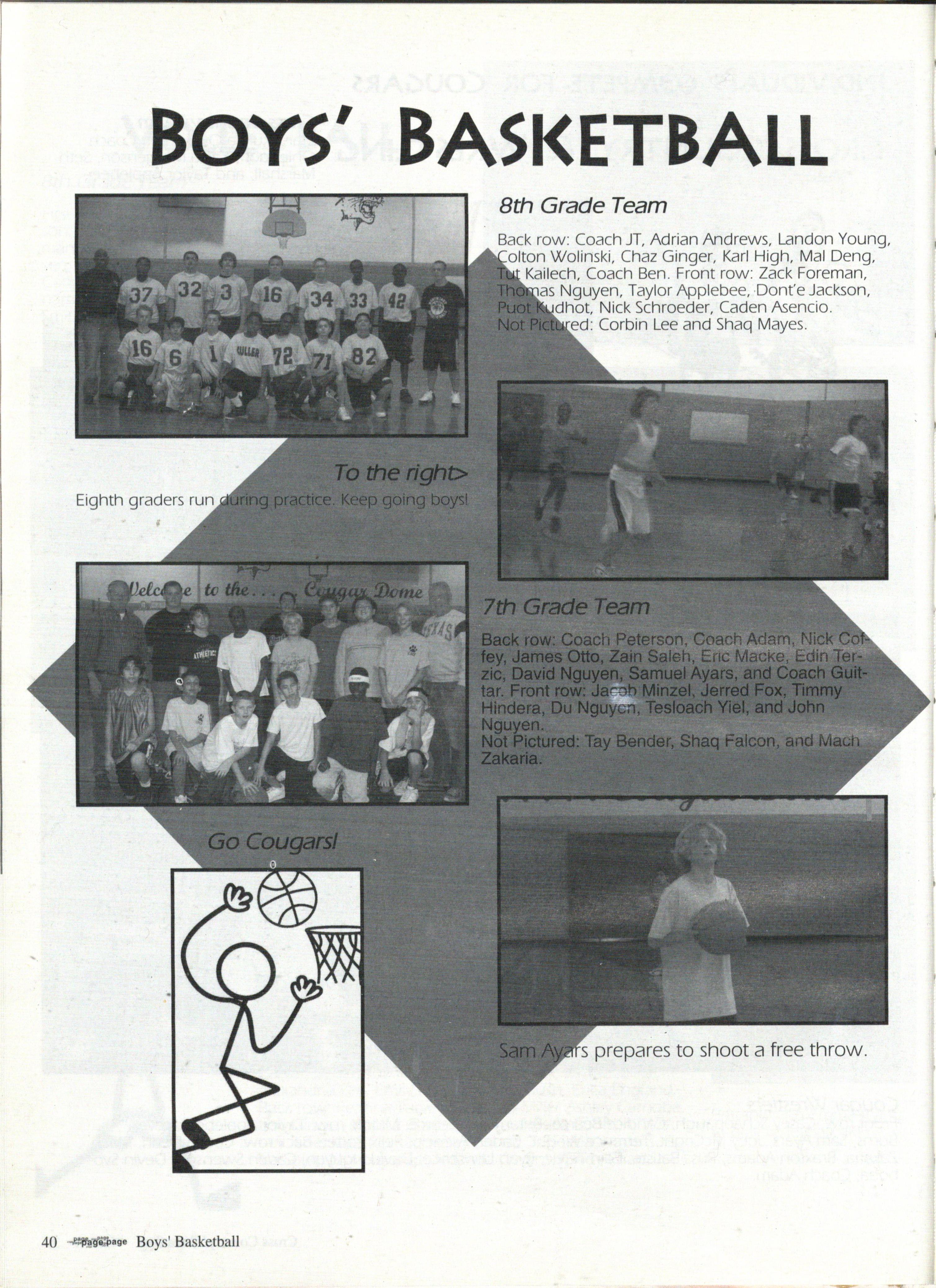 BOYS'BASKETBALL 8th Grade Team Back row : Coach JT, Adrian Andrews, Landon Young, olton Wolinski, Chaz Ginger, Karl High, Mal Deng, Kailech, Coach Ben Front row : Zack Foreman, as Nguyen, Taylor Applebee, .Oont' e Jackson, dhot, Nick Schroeder, Caden Asencio. ed: Corbin Lee and Shaq Mayes .