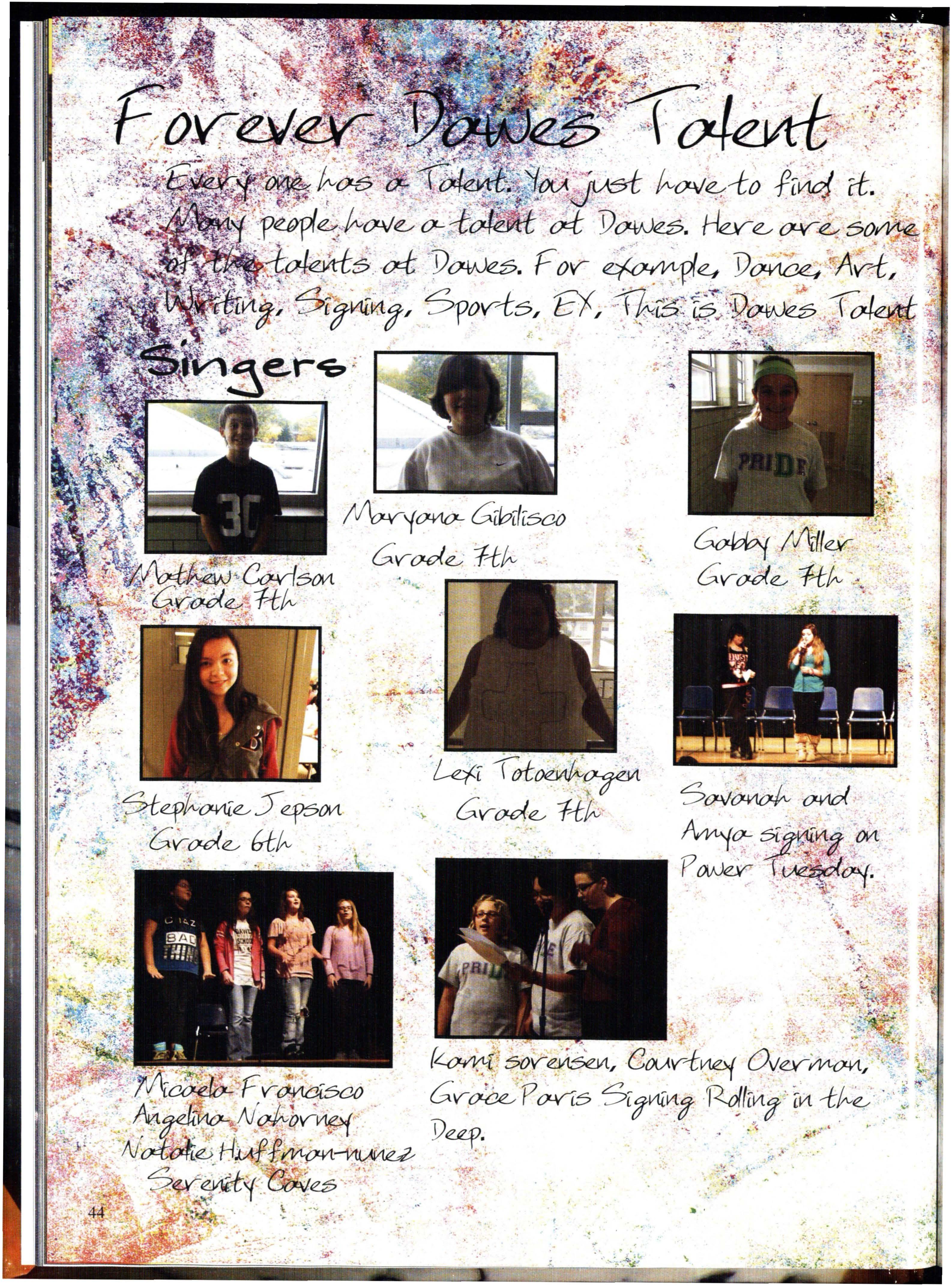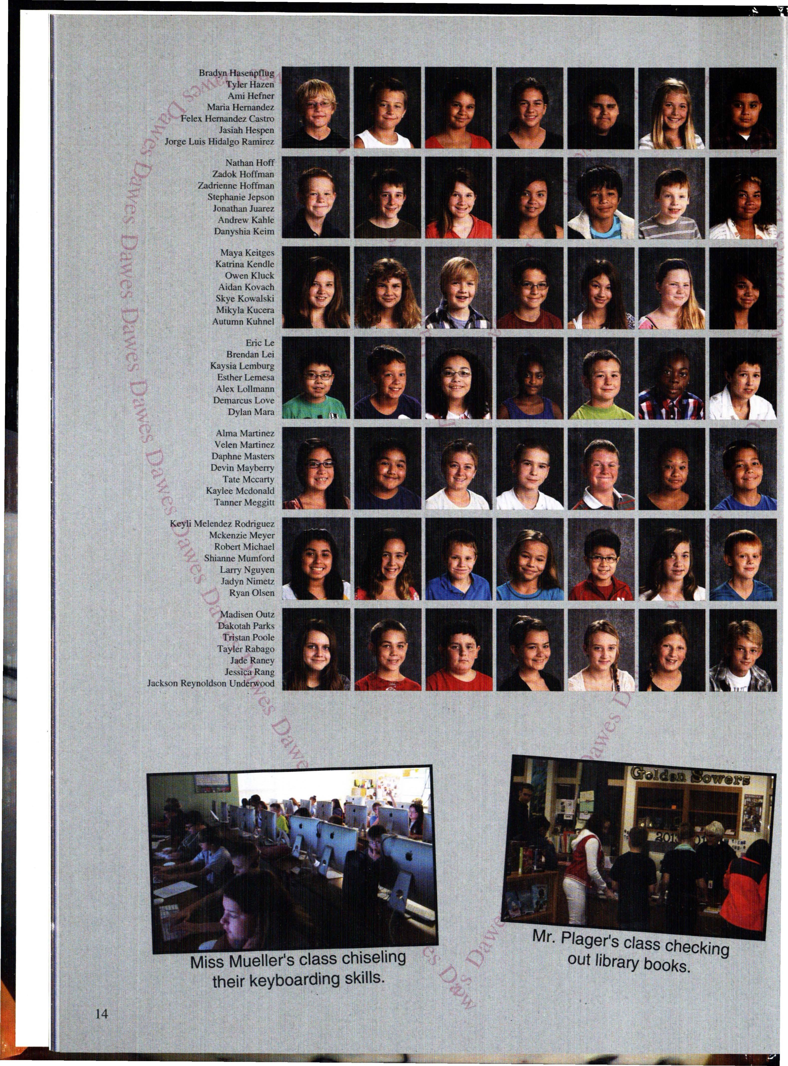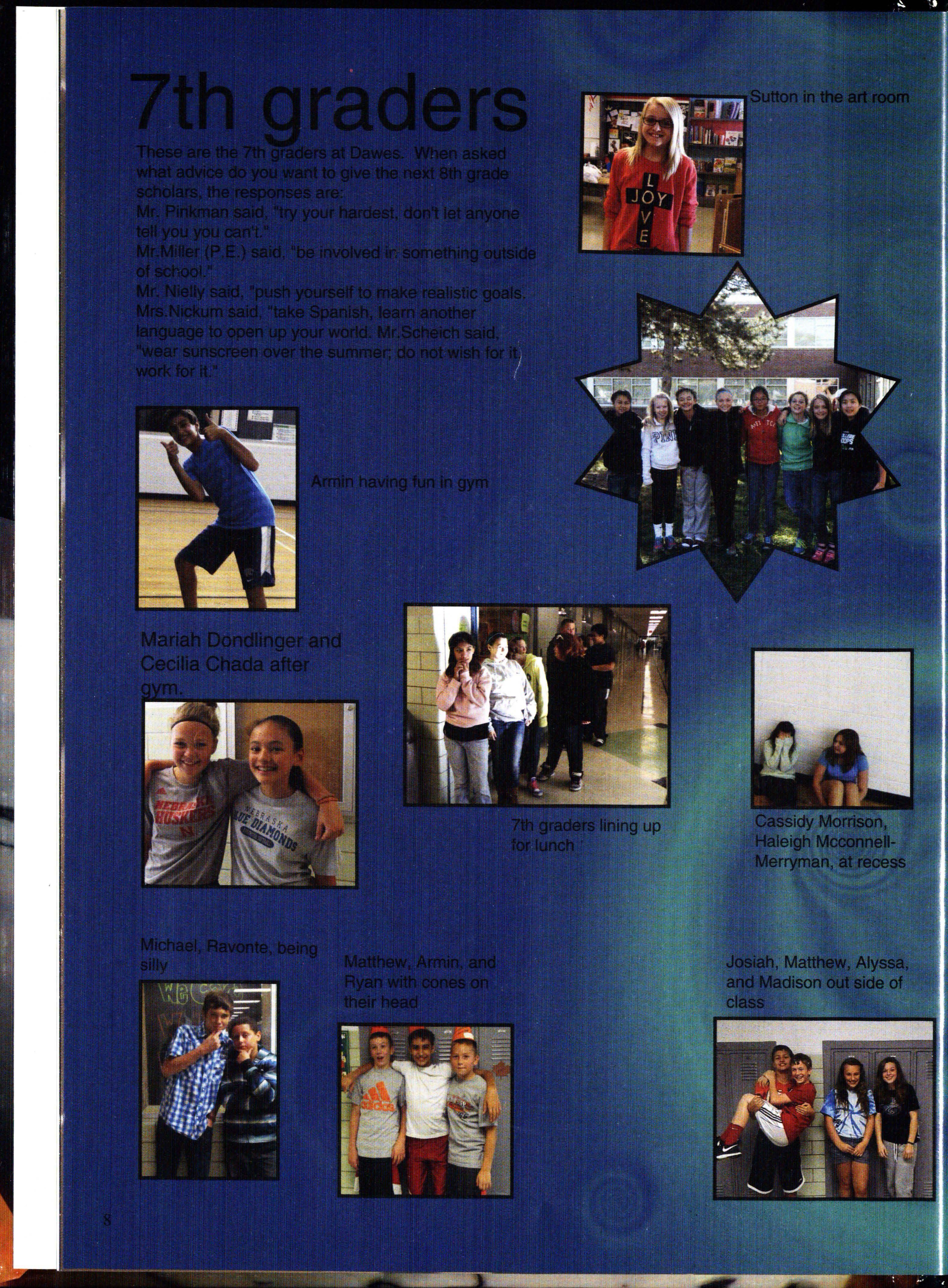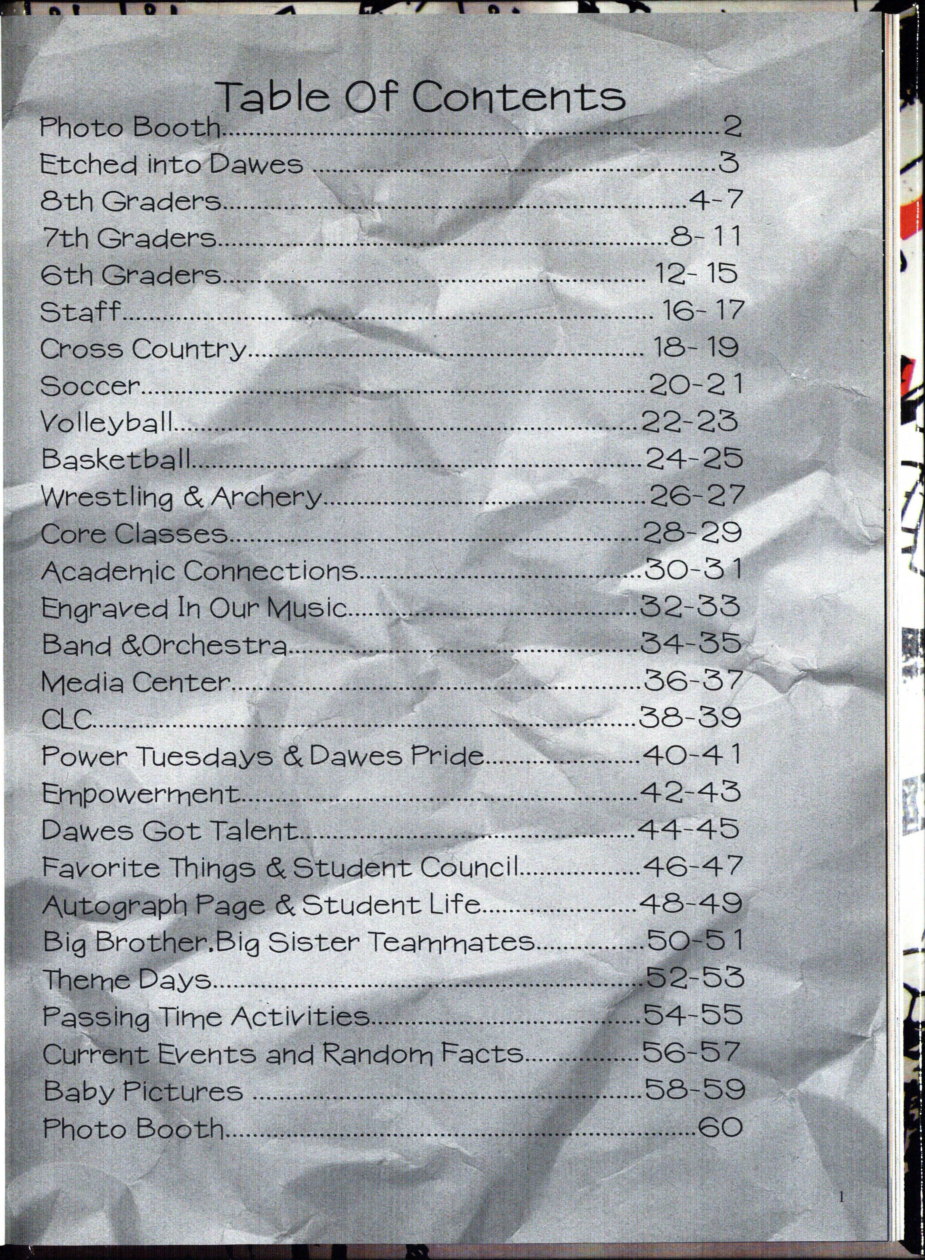 hoto ooth ..................................... . E.tchect into Dawes ...............................,. ........ .. ..................... 3 8th Gr acters .....................................................................4- 7 ·7th Gracters ..................... t ••••••••••••••••••..•••• •••••••••••.•••••••• 8- 11 6th Gracters .......... :...... ............................................. 12- 15 Staff .................. .......... :.:................................................ 16- 17 Cross CountrY· :··························~·······························18- 19 Soccer ........................................................................... 20- 2 1 Vo Ileyba II. ..................................·.·~··~····························· 2 2- 23 Basketba II. ....................... ..... .......... :.···························24-25 Wrestling & Archery ............. .' ...................................26-27 Cor~ Classes ................................................... .......... 28- 29 Acacteh1 ic Connections ..................·........................ 30-3 1 E.ngravect In Our Music ................................. ........... 32-33 Banet &Orchestra .................................................... 34-3 5 · Mectia Center ................................ ........... .. .. .............. 36-3 7 CLc·............... .............................. ..................... ......--!"!;'•••••• 3 8- 3 ·9 , Power Tuesctays & Dawes Pricte ....................... 40-4 1 I E.rt,powerrtient .. .-···..................................................... 4 2-43 Dawes Got Talent .............. ............................. ..... 44-45 Pavorite Things & Student Council. ................. 46-4 7 Allto!araph Page & Student Life ....... _ ................ 48-49 Big Brother.Big Sister Teartirtiates ................ 50-5 1 Thertie Days................................................................ 2-53 Passing Tirtie Activiti~s ...................................1. •••• 54-55 Cwrrent Events and R.anctoh1 Pacts ......... .,h••···56~ 5 7 Baby Pictures ........................................... ••u•o• ••••••• 58-59 Photo Bqoth ................................................. ,.................... 60 .