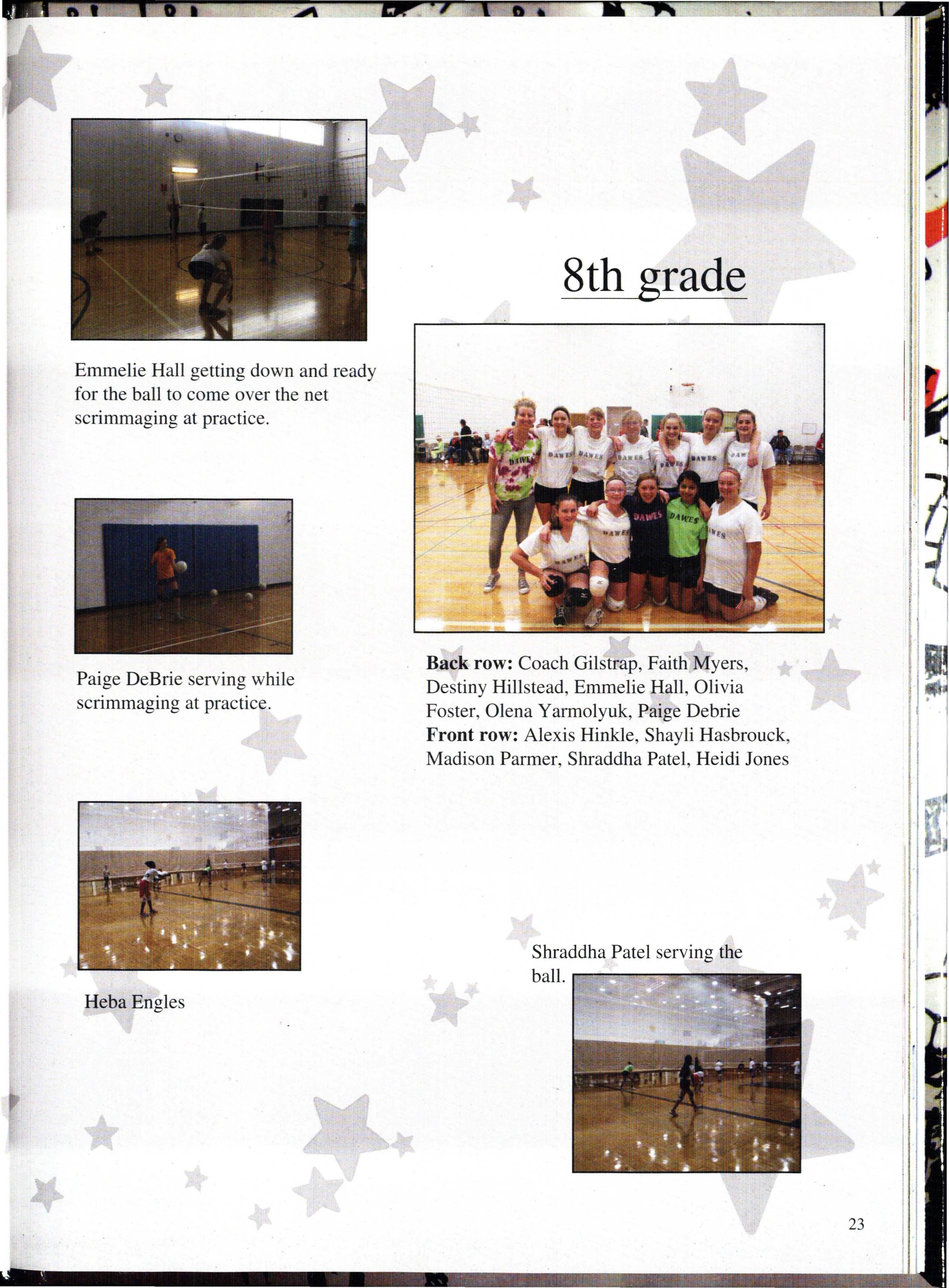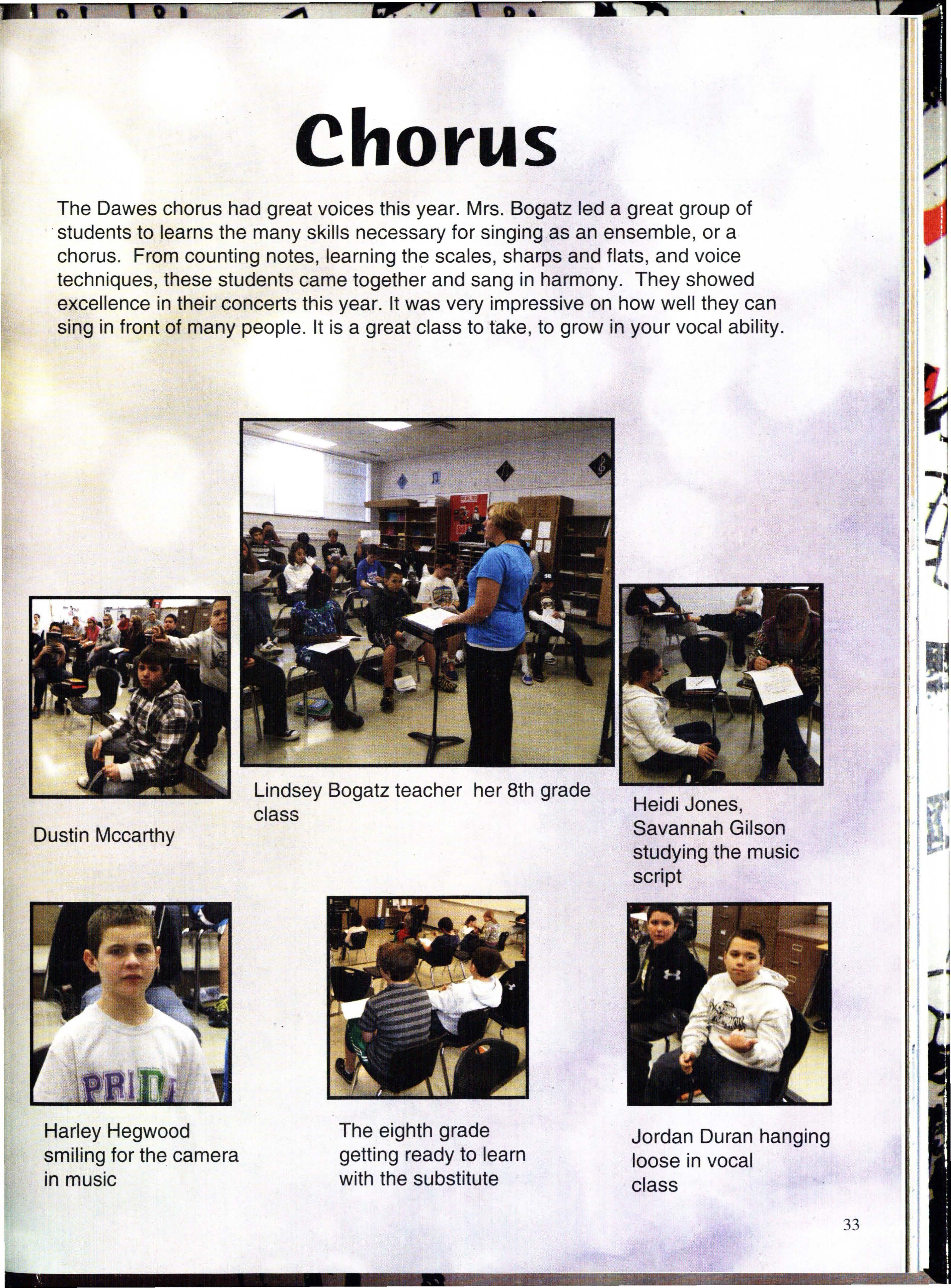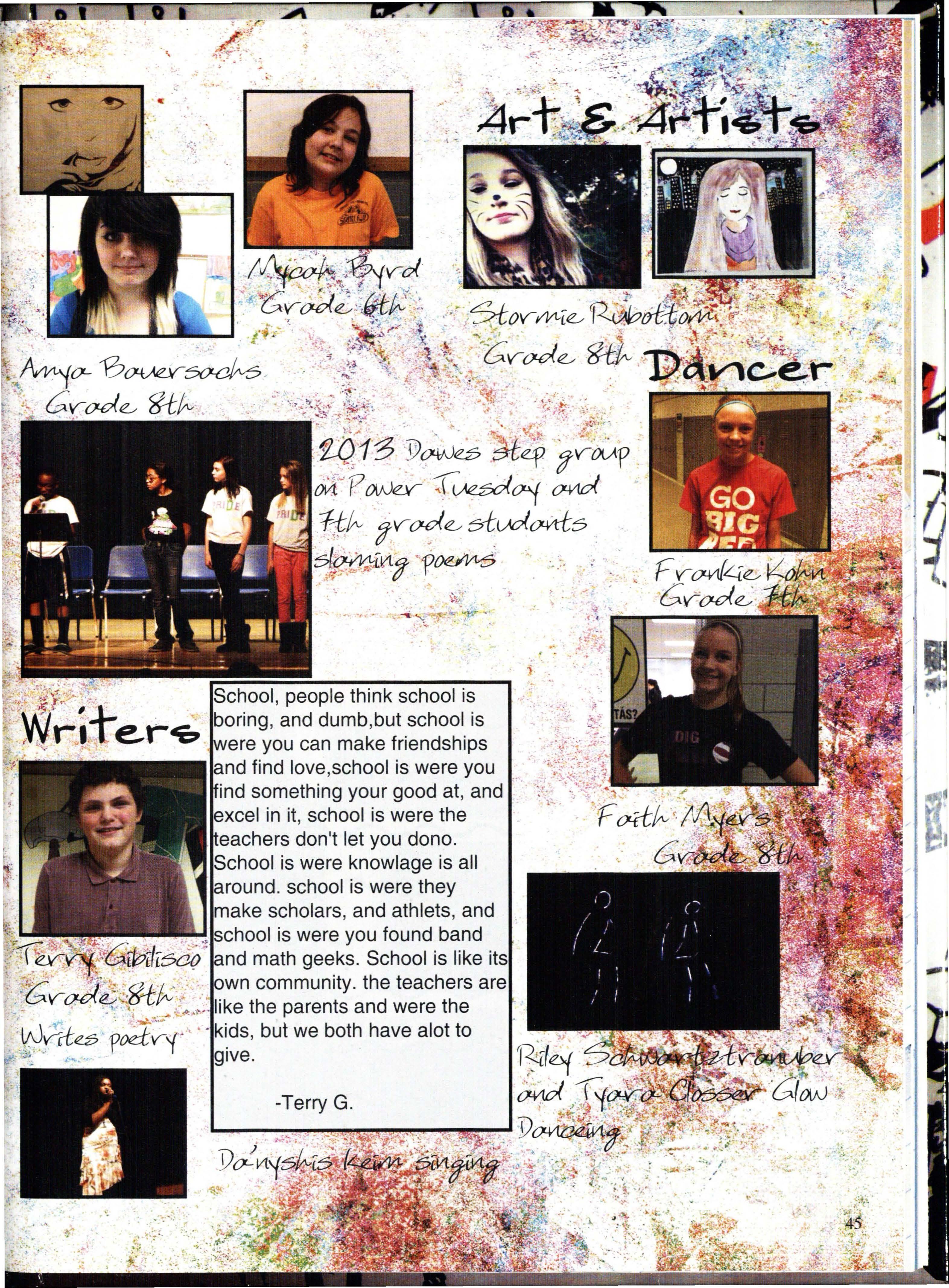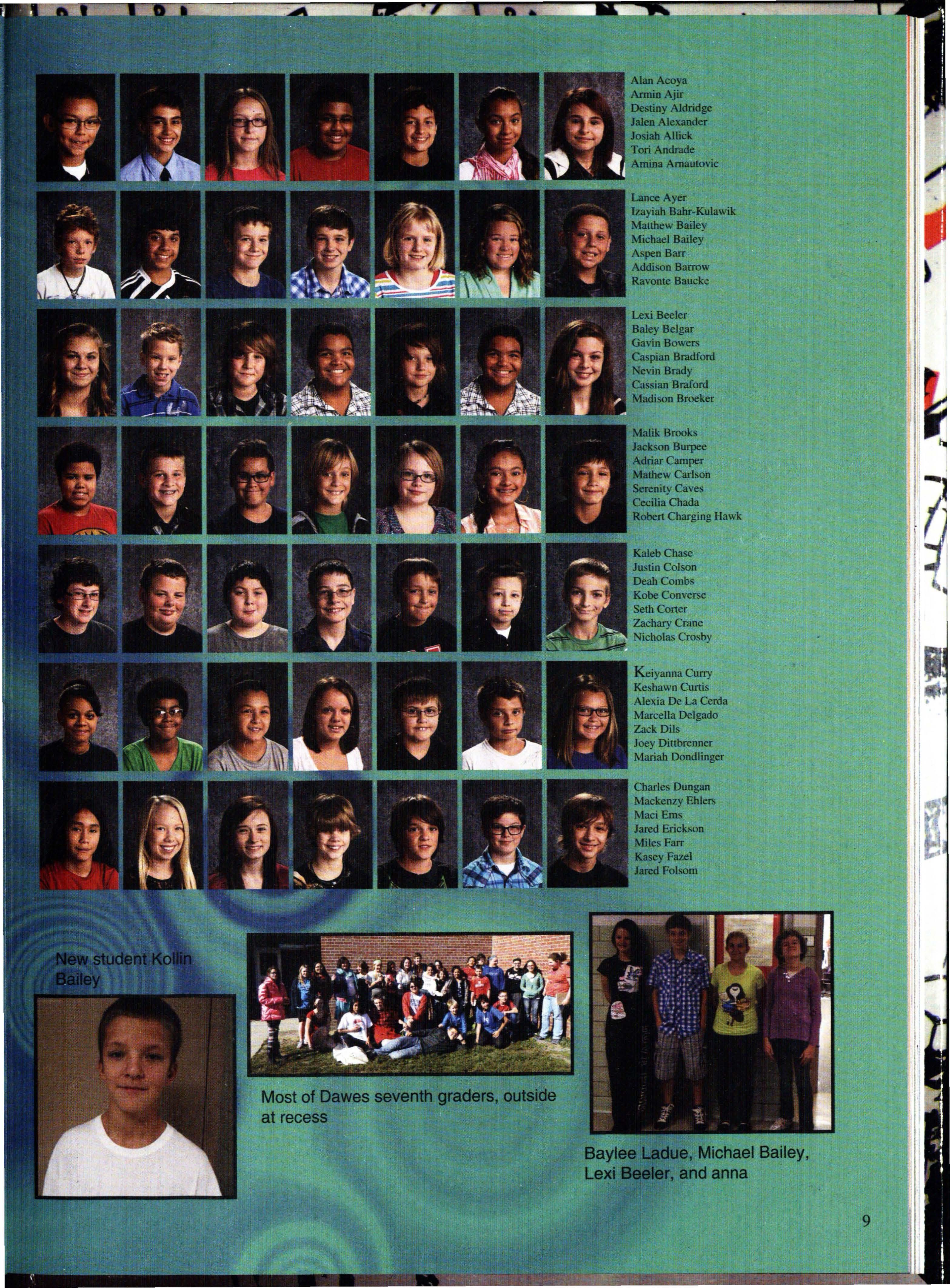 hoto ooth ..................................... . E.tchect into Dawes ...............................,. ........ .. ..................... 3 8th Gr acters .....................................................................4- 7 ·7th Gracters ..................... t ••••••••••••••••••..•••• •••••••••••.•••••••• 8- 11 6th Gracters .......... :...... ............................................. 12- 15 Staff .................. .......... :.:................................................ 16- 17 Cross CountrY· :··························~·······························18- 19 Soccer ........................................................................... 20- 2 1 Vo Ileyba II. ..................................·.·~··~····························· 2 2- 23 Basketba II. ....................... ..... .......... :.···························24-25 Wrestling & Archery ............. .' ...................................26-27 Cor~ Classes ................................................... .......... 28- 29 Acacteh1 ic Connections ..................·........................ 30-3 1 E.ngravect In Our Music ................................. ........... 32-33 Banet &Orchestra .................................................... 34-3 5 · Mectia Center ................................ ........... .. .. .............. 36-3 7 CLc·............... .............................. ..................... ......--!"!;'•••••• 3 8- 3 ·9 , Power Tuesctays & Dawes Pricte ....................... 40-4 1 I E.rt,powerrtient .. .-···..................................................... 4 2-43 Dawes Got Talent .............. ............................. ..... 44-45 Pavorite Things & Student Council. ................. 46-4 7 Allto!araph Page & Student Life ....... _ ................ 48-49 Big Brother.Big Sister Teartirtiates ................ 50-5 1 Thertie Days................................................................ 2-53 Passing Tirtie Activiti~s ...................................1. •••• 54-55 Cwrrent Events and R.anctoh1 Pacts ......... .,h••···56~ 5 7 Baby Pictures ........................................... ••u•o• ••••••• 58-59 Photo Bqoth ................................................. ,.................... 60 .