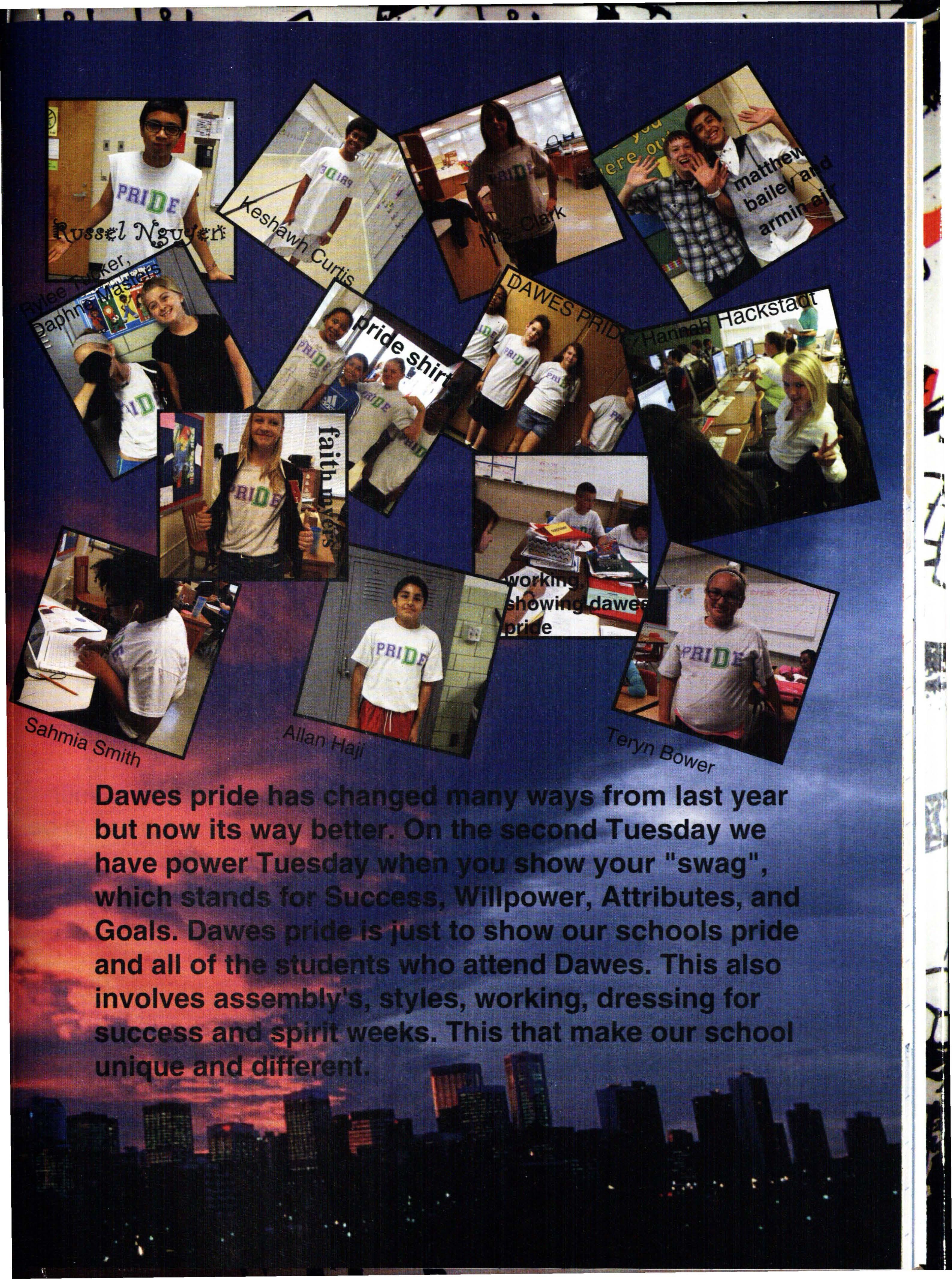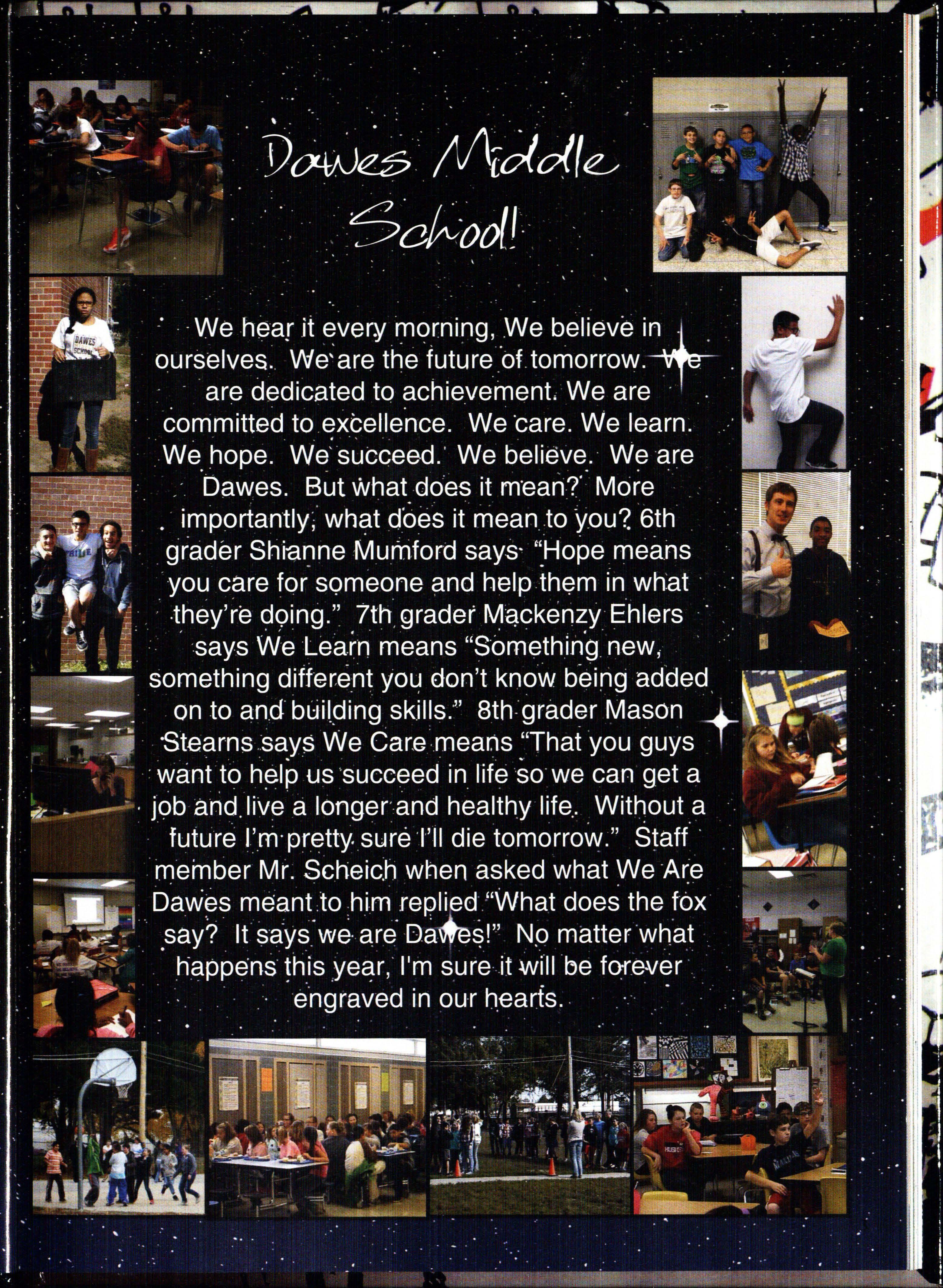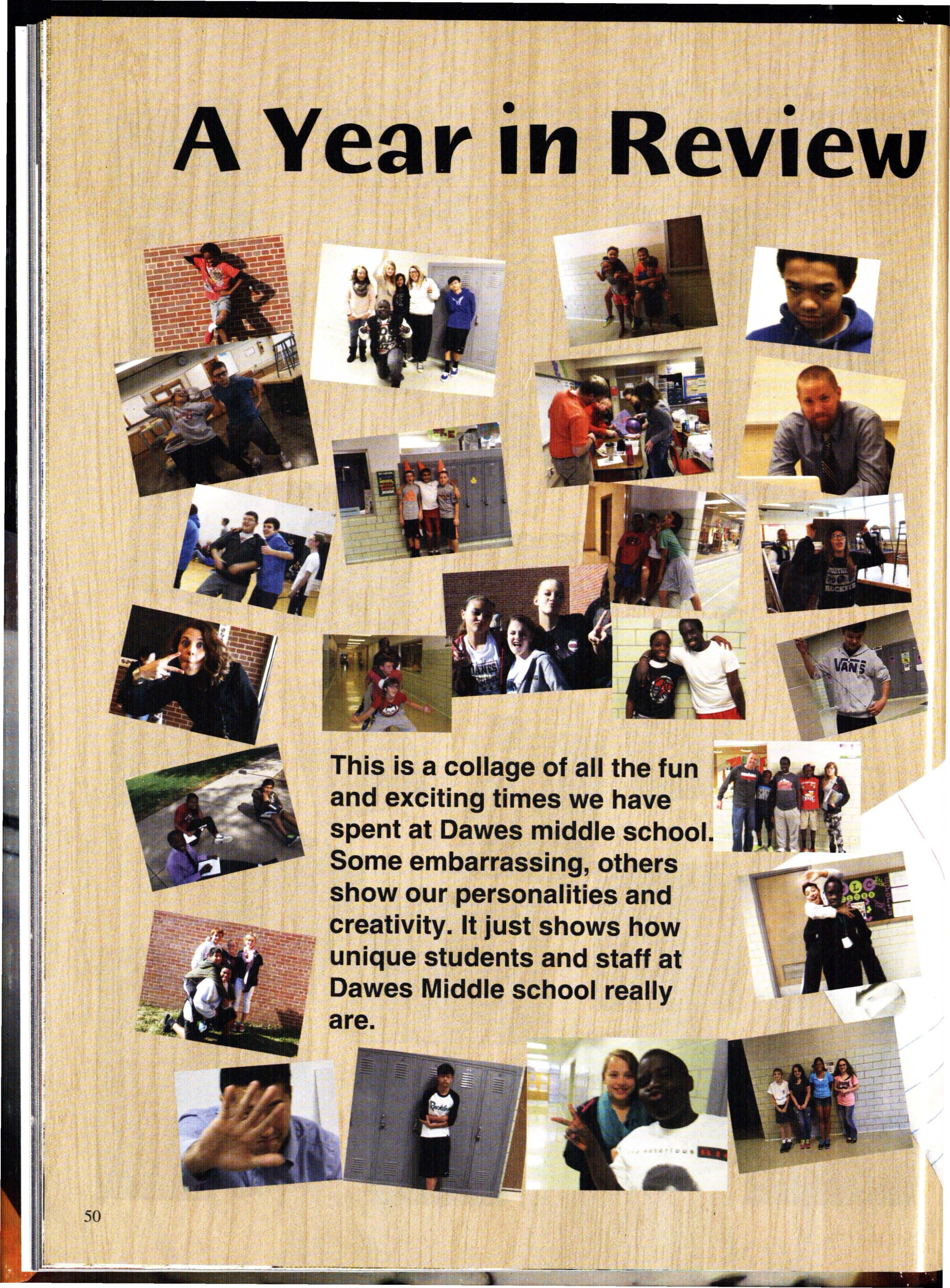 This is a collage of all the fun and exciting times we have spent at Dawes middle school. Some embarrassing, others show our personalities and t~~]t1;r;r~ 1 ~~~~~ creativity. It just shows how :~ :? unique students and staff at.. Dawes Middle school really