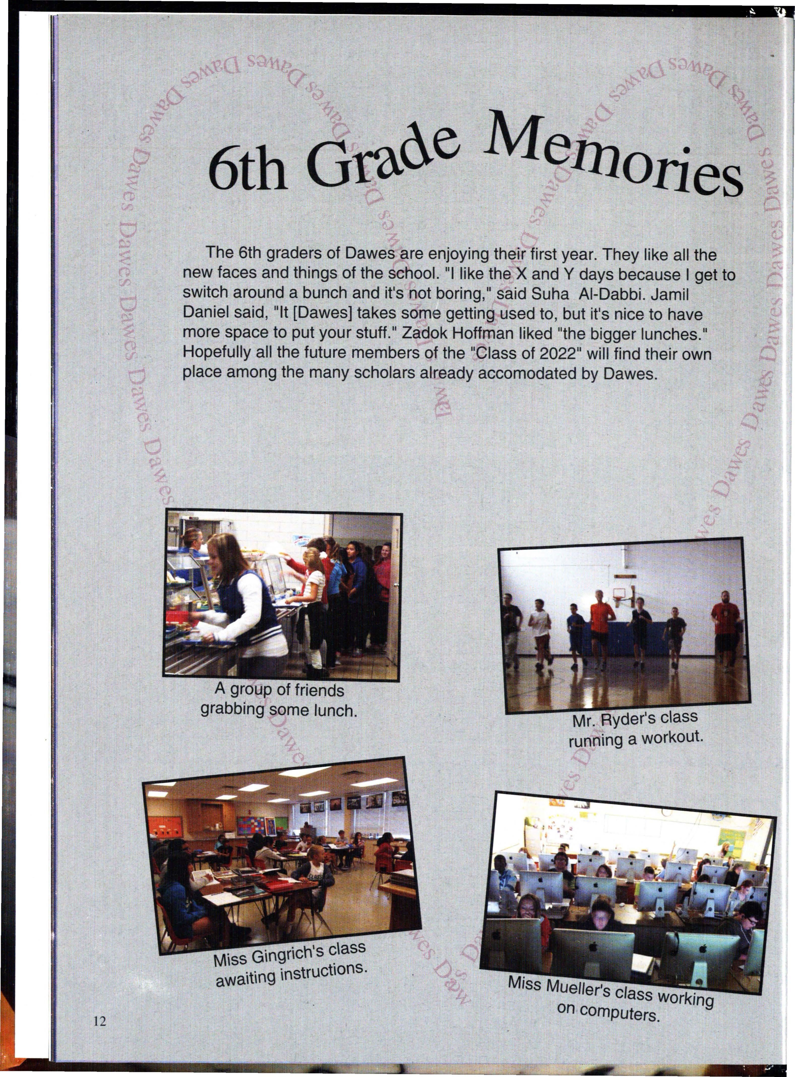 The 6th graders of Dawes are enjoying their first year. They like all the new faces and things of the school. "I like the X and Y days because I get to switch around a bunch and it's not boring," said Suha AI-Dabbi. Jamil Daniel said, "It [Dawes] takes some getting used to, but it's nice to have more space to put your stuff." Zadok Hoffman liked "the bigger lunches." Hopefully all the future members of the "Class of 2022" will find their own d place among the many scholars already accomodated by Dawes.