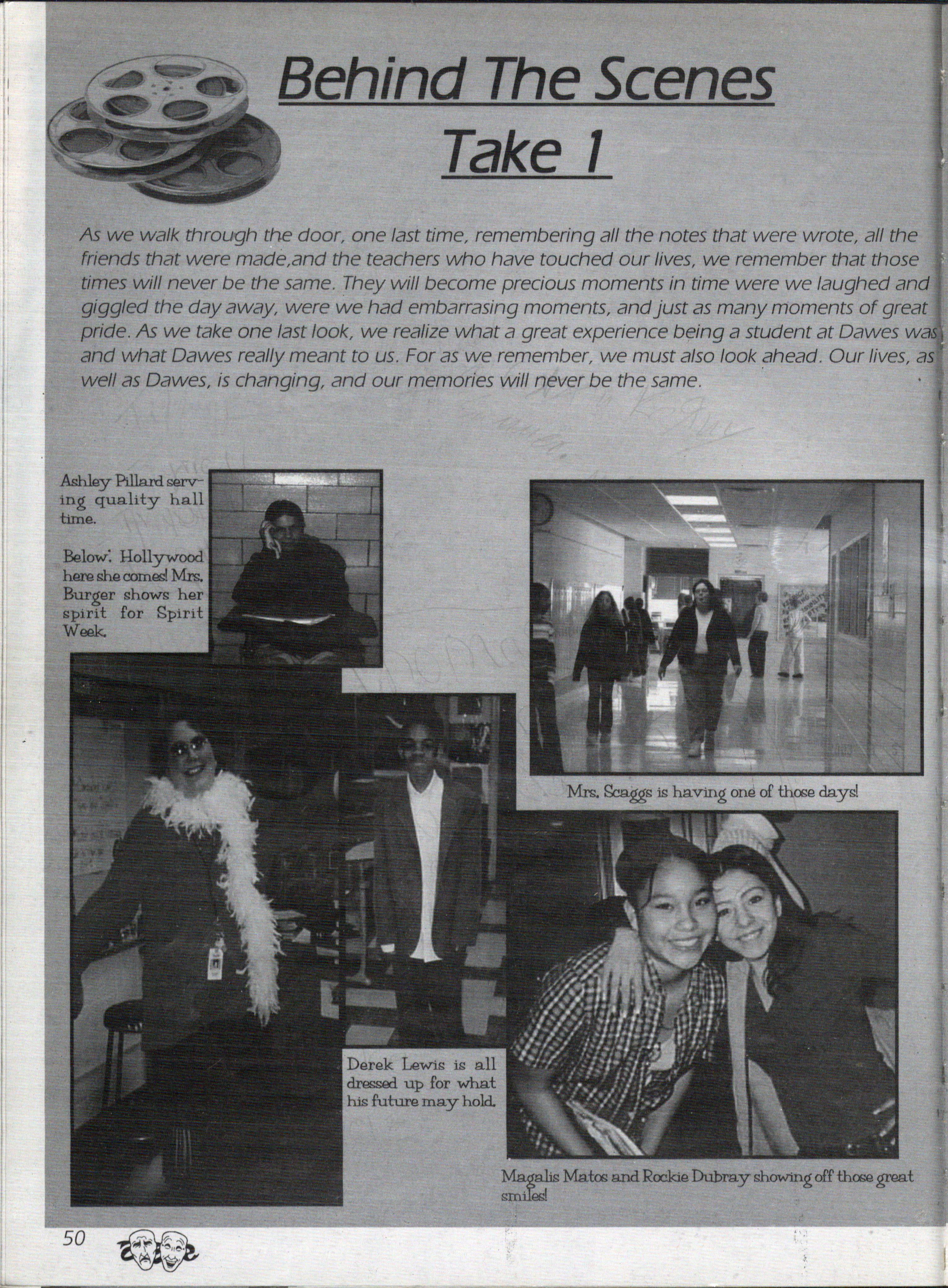 As we walk through the door , one last time, remembering all the notes that were wrote, all the friends that were made,and the teachers who have touched our lives, we remember that those times will never be the same. They will become precious moments in time were we laughed and giggled the day away, were we had embarrasing moments, and just as many moments of great pride. As we take one last look, we realize what a great experience b({=ing a student at Dawes was and what Dawes really meant to us. For as we remember, we must also look ~head Our lives, as well as Dawes, is changing, and our memories will never be the same
