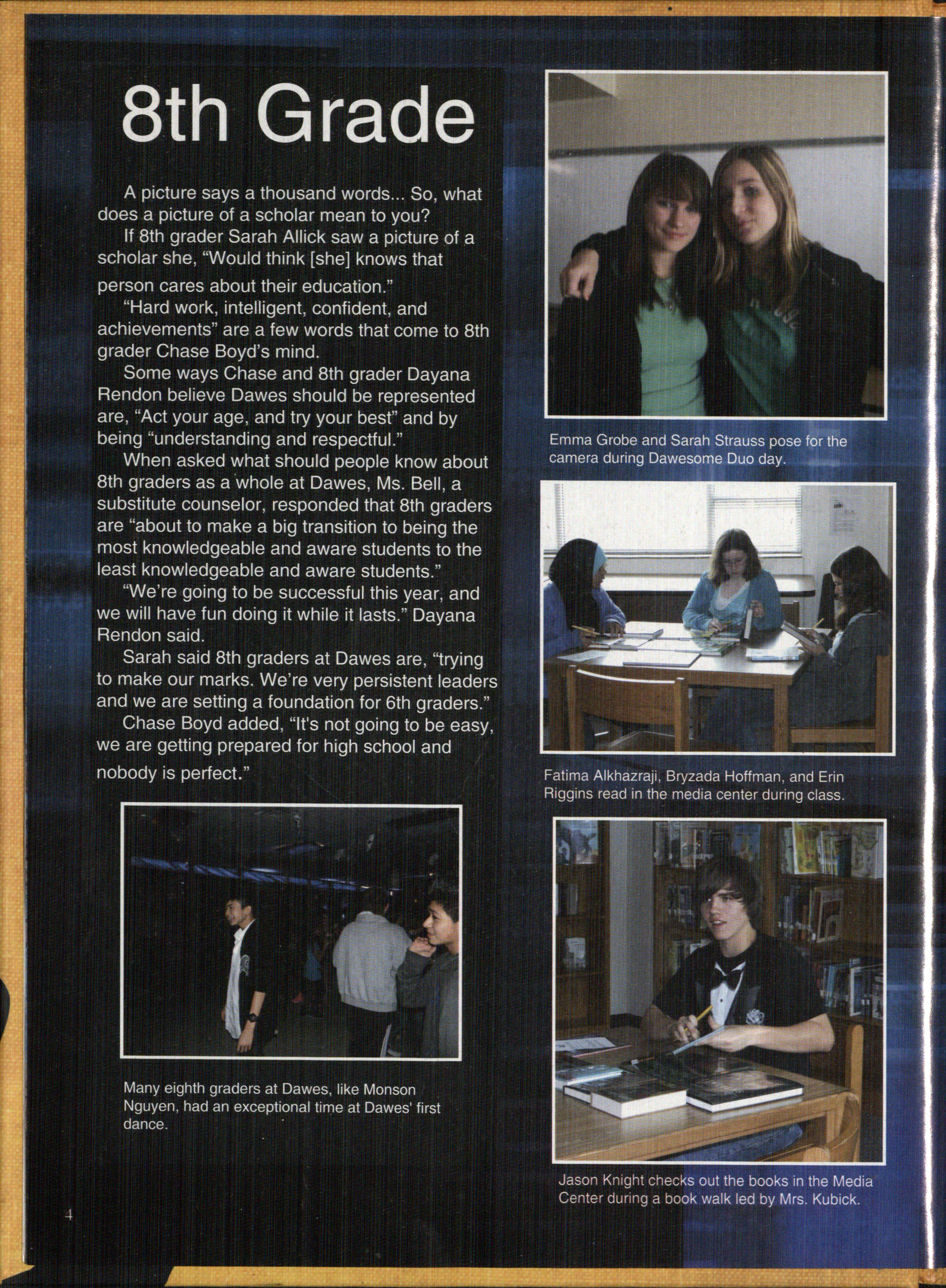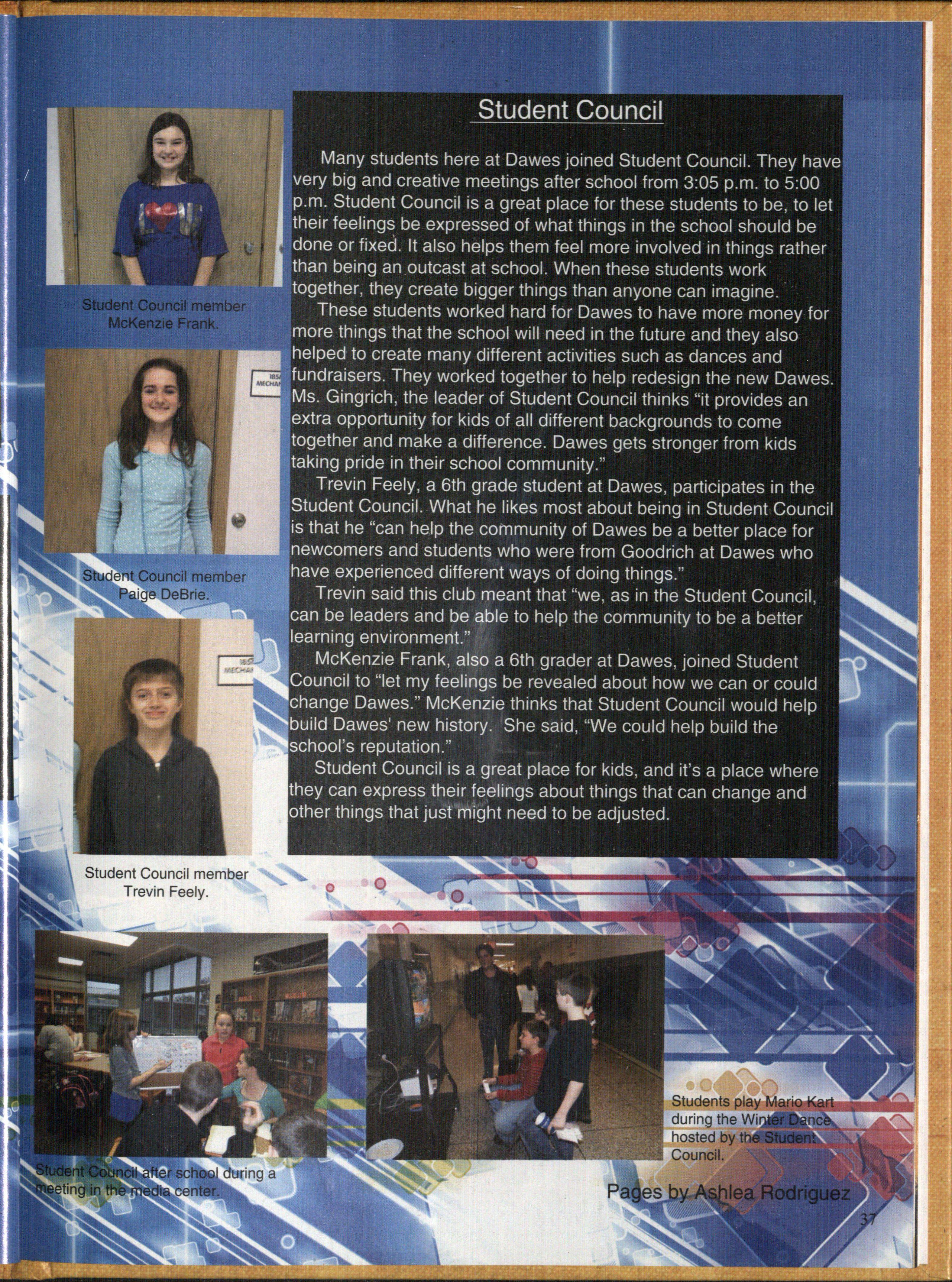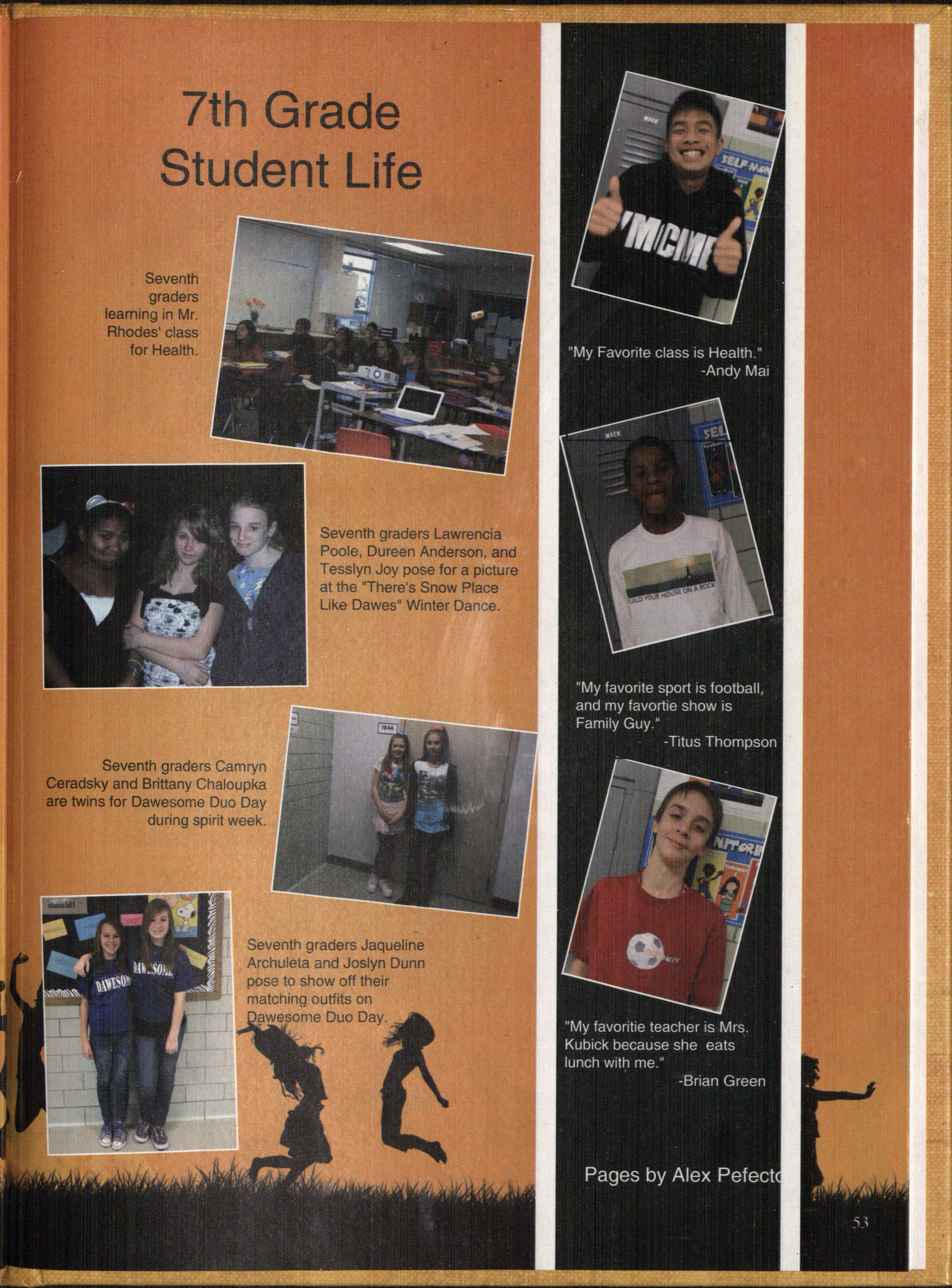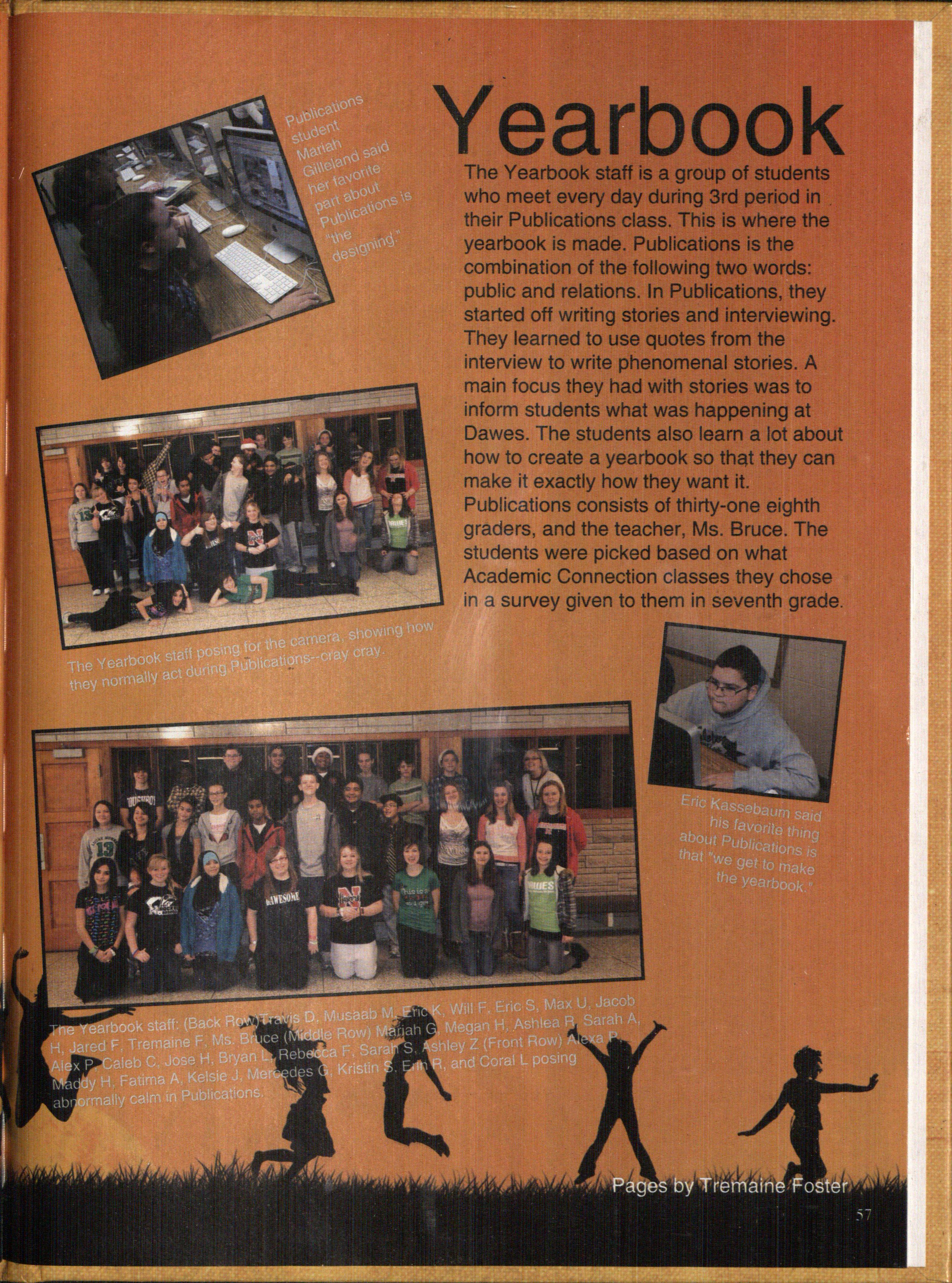 The Yearbook staff is a group of students who meet every day during 3rd period in their Publications class. This is where the yearbook is made. Publications is the combination of the following two words: public and relations. In Publications, they started off writing stories and interviewing. They learned to use quotes from the interview to write phenomenal stories. A main focus they had with stories was to inform students what was happening at Dawes. The students also learn a lot about how to create a yearbook so that they can make it exactly how they want it.