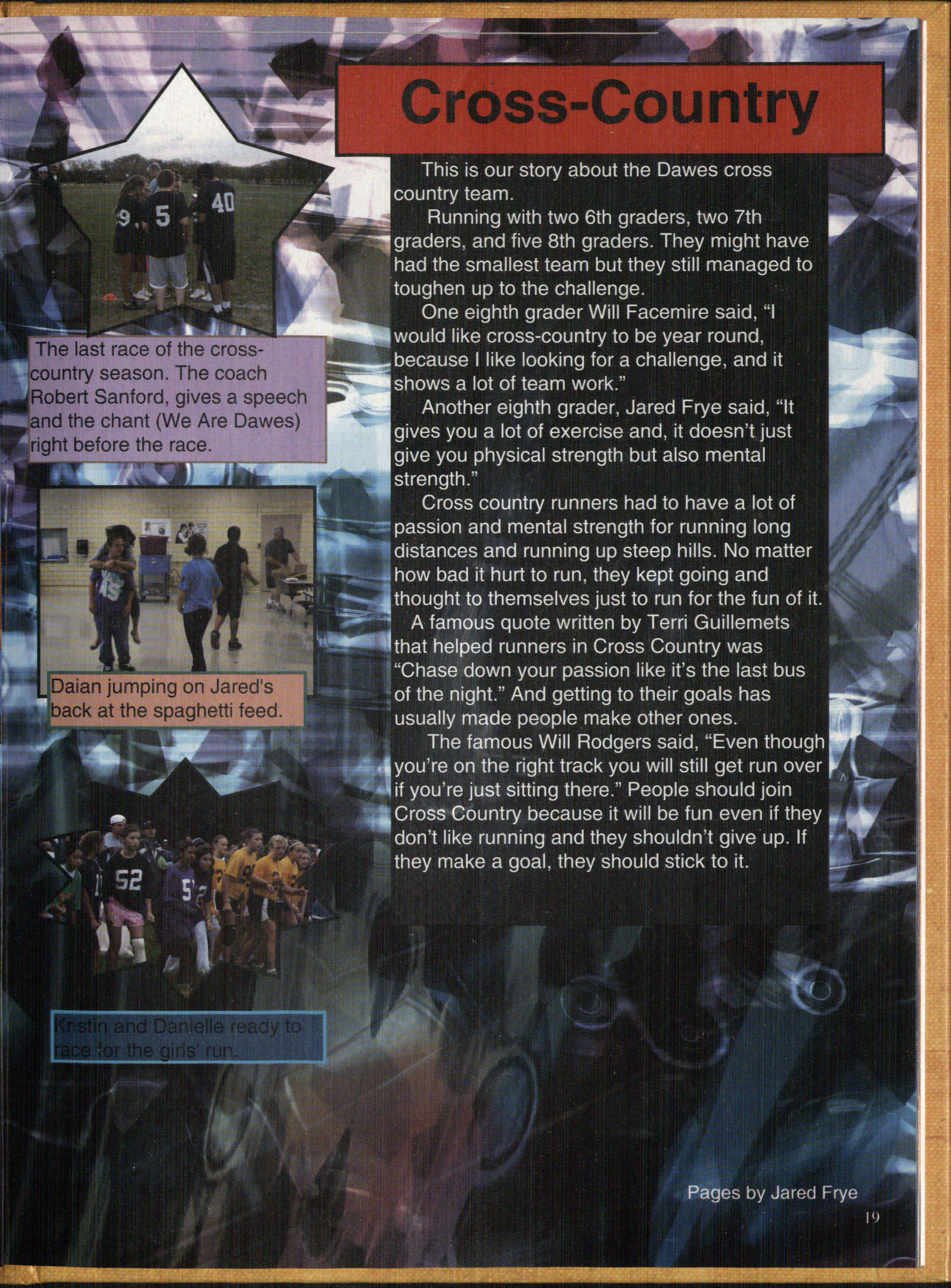 The last race of the crossountry season. The coach Robert Sanford, gives a speech nd the chant (We Are Dawes) right before the race.