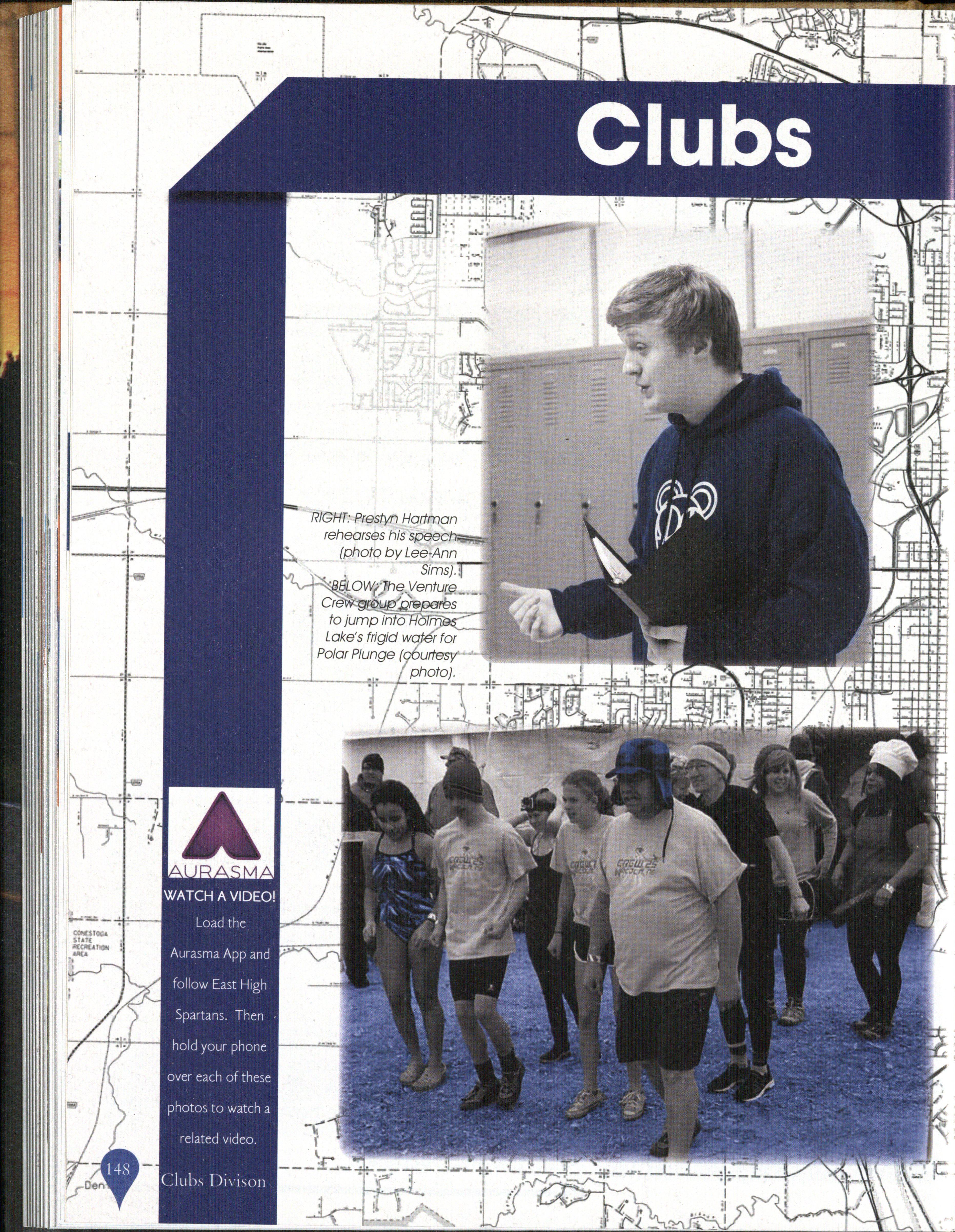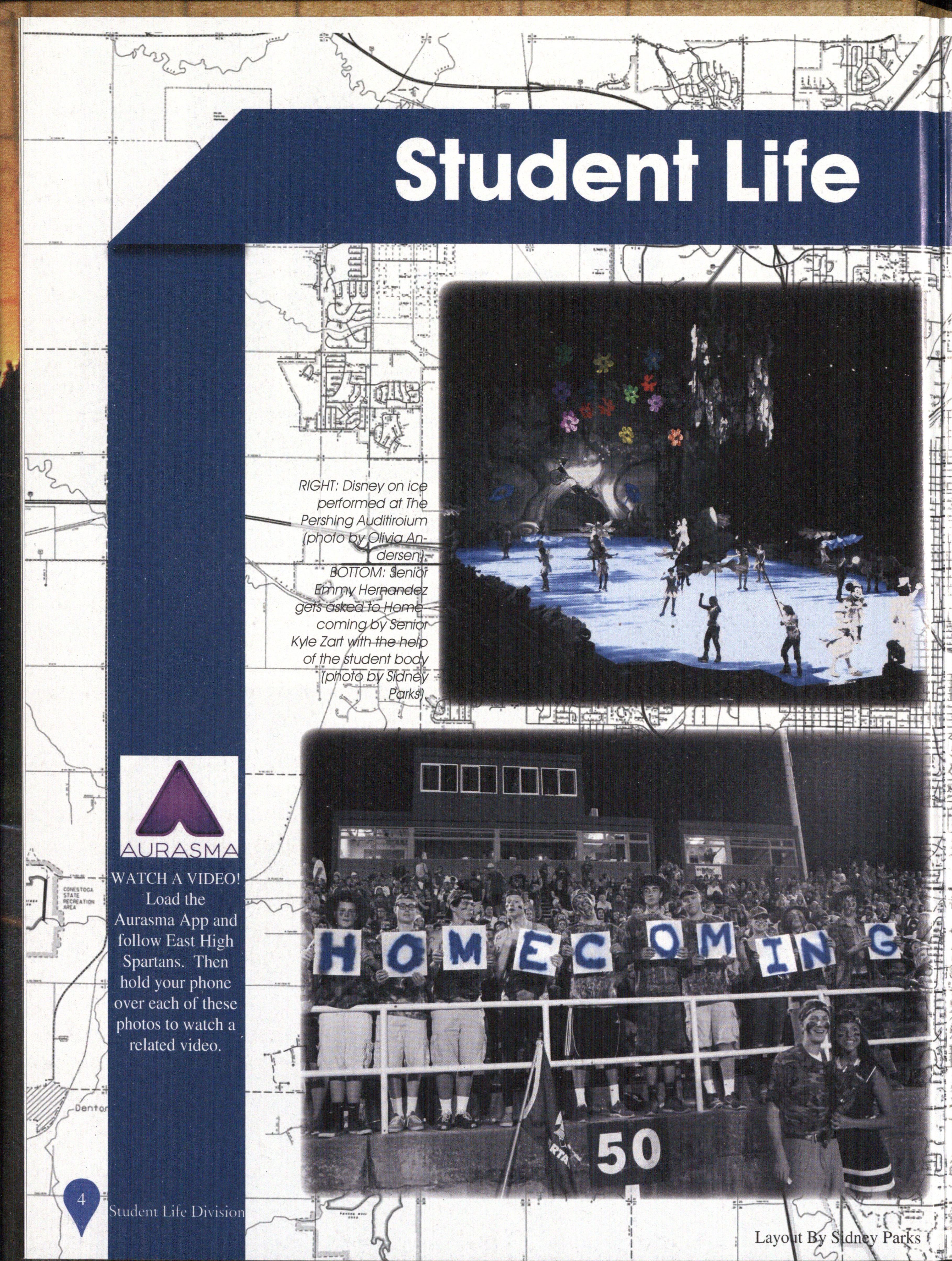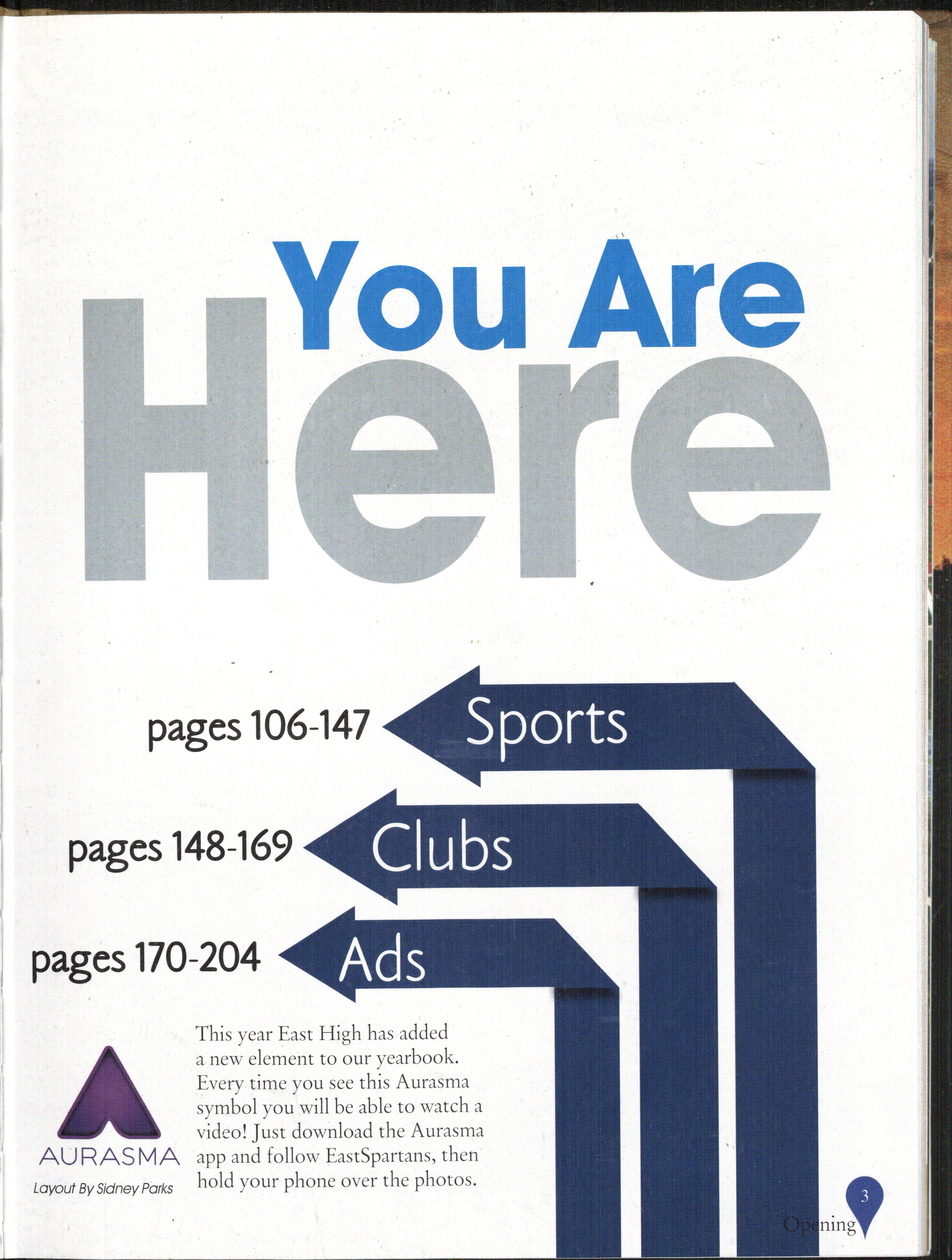 This year East High has added a new ele~ent to our yearbook. Every time you see this Aurasma symbol you will be able to watch a video! Just download the Aurasma AURAS MA app and follow EastSpartans, then