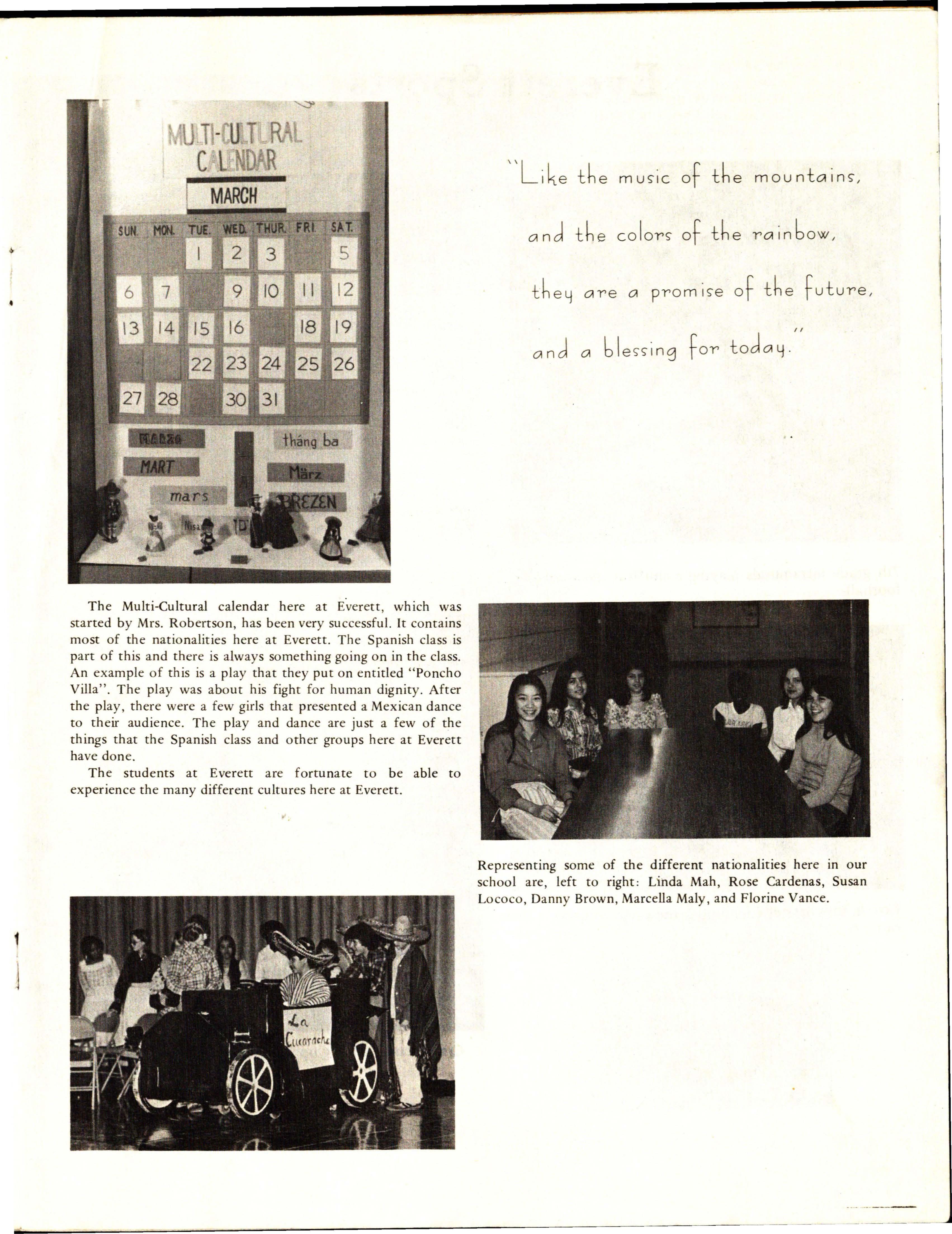 The Multi-Cultural calendar here at Everett , which was started by Mrs. Robertson, has been ver y successful. It contains most of the nationalities here at Everett. The Spanish class is part of this and there is a lw a ys something going on in the class. An example of this is a play that they put on entitled "Poncho Villa". The play was about his fight for human dignity. After the play, there were a few girls that presented a Mexican dance to their audience. The play and dance are just a few of the things that the Spanish class and other groups here at Everett have done .