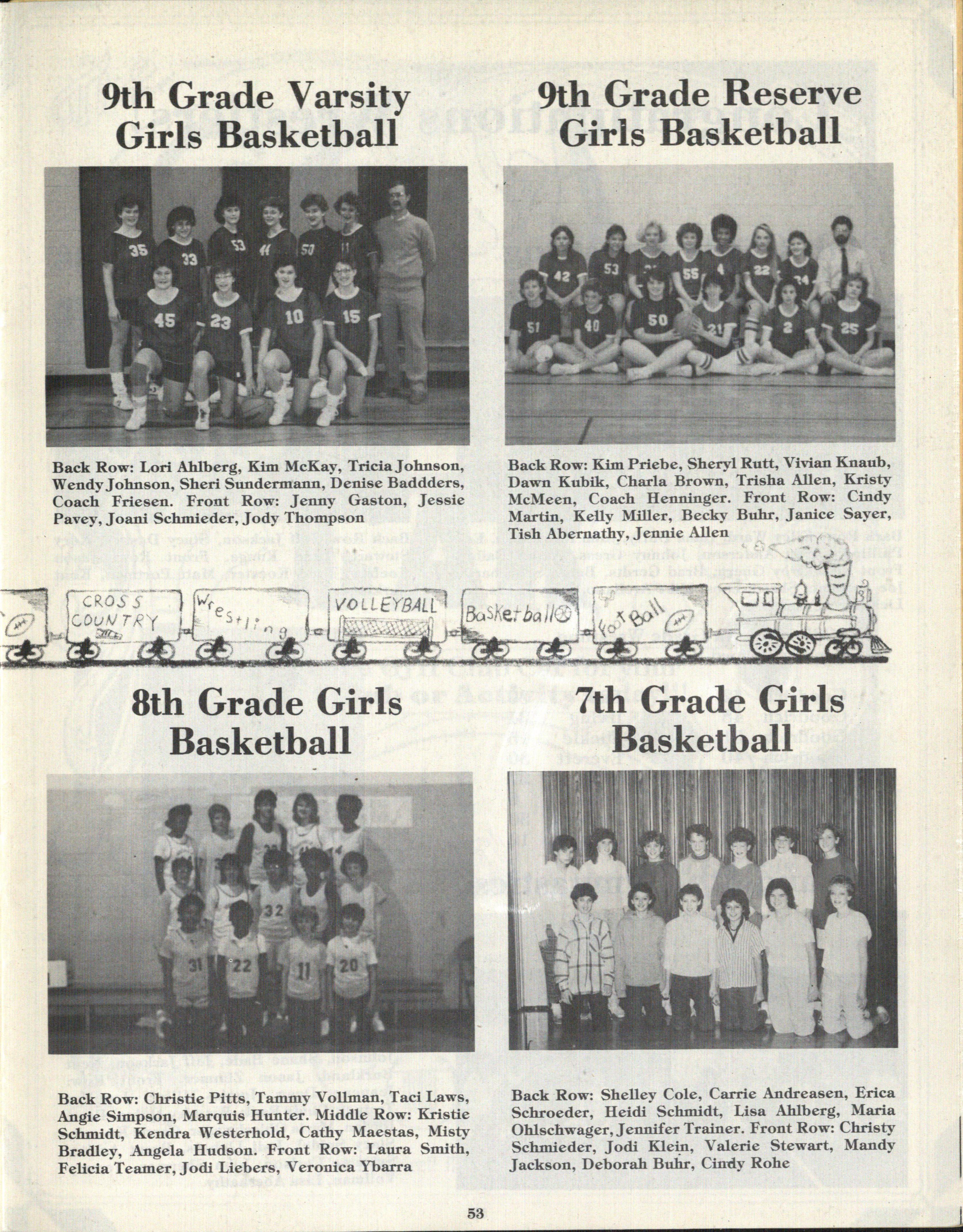 Back Row: Lori Ahlberg, Kim McKay, TriciaJohnson, Wendy Johnson, Sheri Sundermann, Denise Baddders, Coach Friesen. Front Row: Jenny Gaston, Jessie Pavey, J oani Schmieder, Jody Thompson