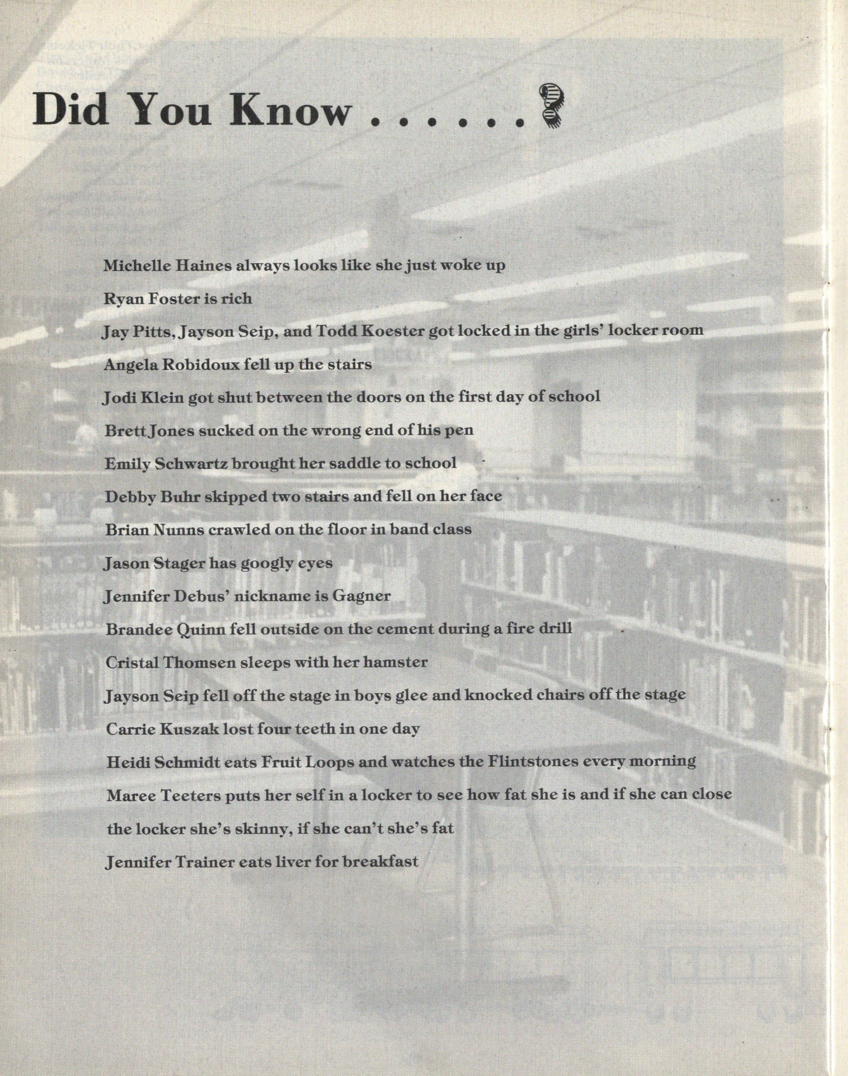 HORN TAWNY HATTE... T KEVIN HAWKINS CHO TDO HAL ,.ES DAW T HELGET TIM HENDRICKS01 T SARAH HE TNINGSE SHAWN HE ... TRY TODD HLTS01,. SHArE HESSELGESSER DWTE HOLDREN EDWARD HOWARD AFGELA HUDso,.T JE. 1 NY HU TT ... IARQUIS HU1 ,.TER ROBL,. ffL' TZEKER JE...,. IFER HUTCHL Tso T ELBERTA JAl ms A ... TD REA JE... TKL Ts SHON JE1 TSE TERRI JOHANS01,. BRADLEY JOH1TSO.T CYN.TA 10 r JONES TODD KAPKE CHAD KE ,..,.,.EDY JA KIE K ,.OCKE LAlTCE KOENIG DANIEL KOPERSKI CAROL KRUMTU:M TL 10THY LACARDII RACHEL LAGE TRACY LAH I IARK LANGSTON .. IICHELLE LANGSTO T DAWN LARABEE COREY LARSEN PAUL LATTUIER TACI LAWS BRET LAYMAN GEOFFREY LEACH ERIC LEE JODI LIEBERS TRACEY LITTLEJOH1 T AICHELLE LO "G ALLEN LOOS KRISTL ,.A LYON CHAD LYO. ,.S CATHY 11AESTAS VICKI MAGNUS01 T A1 TTHO rY .IARTIN EDWARD l\lARTLT DL T1 1 IS 1ICGL TNIS CHRISTL TE 1CGRANE WILLIAM MEDL • . MICHAEL MEYER JAl HE MILLER CYNTHIA MOHR HOLLY .10RENO MICHAEL MORTEi TSEN BRADLEY MURRISH )L.\l THI NGUYEN JERE.IT OHLSCHWAGER BRIA1T OLS01T STACY OSTLT GEOFFREY OWEN MICHELLE PARRIS JERRY PARRO GREGORY PE TITER JASON PIERCE CHRISTOPHER PL TKELtAN CHRISTIE PITTS MIKE POOLE PAL'LA PORTIS STEPHA. TIE POWELL KRISTA PRITCHETT CHRISTOPHER PRUE S01 ,.DRA RAFFERTY APRIL RALSTO TJASON RAMSAY DAVID REISS DL TISE RILJ.IGER DAVID RL KE MICHELLE RODERICK TO ... rYA RODERICK BRAD LEY RC TGE CARLOS SALL "AS MATTHEW SALT. 1. ,.' RHONDA SCHAER CHRISTL 'A SCHIPPERT KRISTIE CHMIDT AARON SCHOLTL TG TAMlff SCHRODER CHRISTOPHER S HUSTER DEBBI SCHWL TDT JA. IES SCOTT ETHAlT SEA. IARK STACY SEEFELD JE,. ,,1 ,.IFER SHARP JEFFREY SHEPARD FRE SHERIDA.1 1 JOHN SHER. IAN RO TALD SHOWEN JASON SHrBERT SHARON SHUTE Al'"GELA SLIPS01 T HOLLY s nTH LAU SMITH ROGER S:\HTH SEA1T S HTH STACY SPIDEL KORY STEWART NEIL STEWART WAi~DA STEWART MONTY STOAKES ."UT THEW TRAYER SHERRY TANNER Dfa TISE TAPPE FELICIA TEAMER MICHAEL T0.1ASEKJL TNIIFER TO. ILL,. BRWT TONTEGODE JILLIAr TUREK SH01.,. YA.1,. mvERL,. JOSEPH VEJRASKA CATHY VISGER TAMMY VOLL wT KA.,n WALBRIDGE RICHARD WARE HEATHER WAR!TER KATHALEL,. WASHINGT01 T LISA WE1 '"ZL TIMOTHY WEST KENDRA WESTERHOLD ... ,.ICOLE WETZEL M.\'f THEW WHITSENHUNT MICHELLE WHISLER RA YM01 TD WHITE :MICHAEL WILES CHERYL WILKL TS DARLE...IB WILLIAMS KELLIE WILSON CHRIS WORDEN CHAD WYATT VERONICA YBARRA NICOLE ZBYTNIUK JASON ZIMMER DEPARTURES: TISH ABER ,.ATHY CHRISTOPHER ABERT LORI AHLBERG LARRY AHLRICHS TAMMY AILES CORI ALFIERI JENNIE ALLEN JERILL T ALLfa T TRISHA ALLEI' MICHELLE Ai,.DREWSJOE ARELLANO ... TORMA..~ ARNETT MO 'TE ATHERTON AlTDY AVILA MARY AZBILL CRISTY BAADE DENISE BADDERS AAR01,. BAILEY CHAD BA EY TROY BAR1 TES RICHARD BA.ru ETT JOLL TE BARTLES JEN1 '"IFER BA TUN EK DARRELL BAU I KIM BELFORD DEBBIE BELL KEITH BIGLEY LISA BITE... 'IEJ.{S CARY BLACK MARK BOGE. T TAM 1 I ' BOGfa,.REIF BRIAN BOHLKE.,. ROX.A.FA BRATT CHARLA BROWN REBECCA BUHR JO '"ATHAN BlJRCHAM SAMANTHA BURGES SHANE BURKEY LES BURKINSHAW DALE BCRNETT MICHELLE CALDWELL DA TA CARDER TRA Y CAR TAHA.i~ SHELTO CHERRY MARK COLE LA1TE COLLIER DONALD COLLIERS MICHAEL CO. IER LISA COOPER DAW1,. CORSI STACEY COVER DOUGLAS CRISLER JULIE CROCKER JASO • DA1 'LEY KELLI DASHER SCOTT DAVIS T0, 1 DAY CORE • DECKER JOEY DECKER LAURA DE NY GRETCHEN DITZLER DAWN D01TAHOO WILLIAM DOUTHIT PATRICK DREWES DAl,.A DUFFY DIRK EDWARD JEFF EDWARDS KEVIN ELDER SUSA1 1 ELIKER LANCE FAHRL '"HOLZ DA.i,IELLE FIDLER STEVE ... ,. FL '"LEY PAIGE FOLEY DI01 TNE FOULKS STEPHA.i~IE FREDEJEN1 1 IFER GASTON AARON GERDES BRAD GERDTS TONY GLEASON JERRY GRA.i,T JOHNNY GRE TA...."\1 tY GROSHANS LAURA GRUi,.TORAD TROY GCER1 T TERRY GCSTAFS01 DAW1 T HAAHR AlTGELA HARRIS ALICEA HATZE BUEHLER MICHELE HAYS SCOTT HEGNER ROBYN HELLER SCOTT HETHERL TGTON MARK HIETBRL K TROY HOPPIN KIMBERLY HO ,.CHIN ALLL HUDSON CL DY HUDSON BON TIE JACKSON DEA.1, JEFFREY BRWT JOHNSON KARI JOHLrso T PEGGY JOHNSON TRICIA JOHNSON WENDY JOHNSO,• MELISSA JORDA.i~ KEVIN JURGENS JODIE KASPAR CHRISTI TE KELLE i LISA KING VIVIAN KNAUB SEA.i~ KNUTSON CHRISTWTE KOESTER DANA KRING DOUGLAS K BERT DAWN KUBIK TERRY LAGE' TONY LAHRS ERLT LANGE ROBERT LAPSLEY ERIC LAYMA1. MARK LEE JOSEPH LIEKHUS DAN3Y LOGAN SHAWN LOOSJE ,. · NIFER LUEDTKE STACEY LUSAlTE RICHARD ~1AHERJEN1 TIFER ~!APES MICHELLE MARS AlTNA MARSH CL TDY MARTIIN SH TE 1\-IARTIN PORSHA MAYERS DORI MCBEE KIM MCKAY KRISTY MCMEL • STACY MIHULKA SUSAr MILCHING DOUGLAS MILLER KELLY MMILLER TODD MILLER TAM}IY MOGLEJOSIAH MOORE LYNETTE MUGGY STEVE IDHLE RACHELLE MU,1GAARD .i: R SHALL MURPHEY MICHELLE NELSON KATHRYN NICHOLAS KRISTOPHER NITZ TROY 1 OTHNAGEL TODD O'BRIEN BRUN OE. T BRL G CAROLL 'E 0'~1ALLEY JEA....,ETIE 0'.1,.EAL TH01\1AS PARKER DAVID PARKS CALVL T PATTERSON CHARSS PATTERSO . ,. JESSICA PAVEY 1\-lARY PEET KERRY PE •1 ,.ER 1•ICK PERRY MICHELLE PETTIFORD DARYL PHILLIPS ERIC PHILLIPS ERIC PLAUTZ KIM PRIEBE KELLEY QUI1 •cy SHAWN QUL ,.,. • MICHAEL RA.i\ISEY JOHN RAWLINso.,. PARTICIA RED wL TE CARLETHA REYNOLDS JEFFREY RICHARDSON IARTY ROBERTS STACY ROWLAND SHERYL RUT TODD SALTZMAN JAlTJCE SAYER JULIE SCHACHT BRYAN SCHERBARTH VICKI SCHERBARTHJOA.1-VI SCHMIEDER DENISE SCHOLLJEFF SCHROEDERJASON SESSLER BENJAMIN SHA...,ER JOHN SHAW JASON SHELDON ALLEN SH LLAW DAVID SHULTZ DEBRA SILVERS WAYNE SIMMONS ' JANELLE SIMPS01r KELLY SMITH LINDY SPARKS COREY STAGER TIM STEL. BACH BRENDA STEINHAUER DIO •NE STERLI1•G HEATHER STEWART LLOYD STOTT RACHELLE STRAAT ... L\F1 • DANIEL STRAWSER MARTIN STRAWSER KEIRA STREET BUDDY STRIDEJERRY STRODTMANJIM SUGGETT JOCELYNN SULLIVM SHERI suNDERMArL • RE TAE TALLl\W JA....VET TAYLOR CRAIG THOMPSON JODY THOMPSON LISA THOMSEN HOLLY TIEUE TS DONALD TINDLE LYLE TRISLER JAY ULMER JAMES VICARS KILEY WARD A....\IY WA.RE MICHAEL WA.RE SHELLY WATSO. r MICHAEL WEAVER KILYN1r WEBERJUSTL • WEBLEMOE K I T T WEIS CHRISTOPHER WHITSO. • PAT WIECHERT JODY WIESE AlTDY WL •KLER GABRIELE WISE MIKE WOOD MICHELLE WRI HT TAMMY WROBLISKI PATRICK YA.EGER TO ... IT YBARRA SCOTT ZIEBARTH