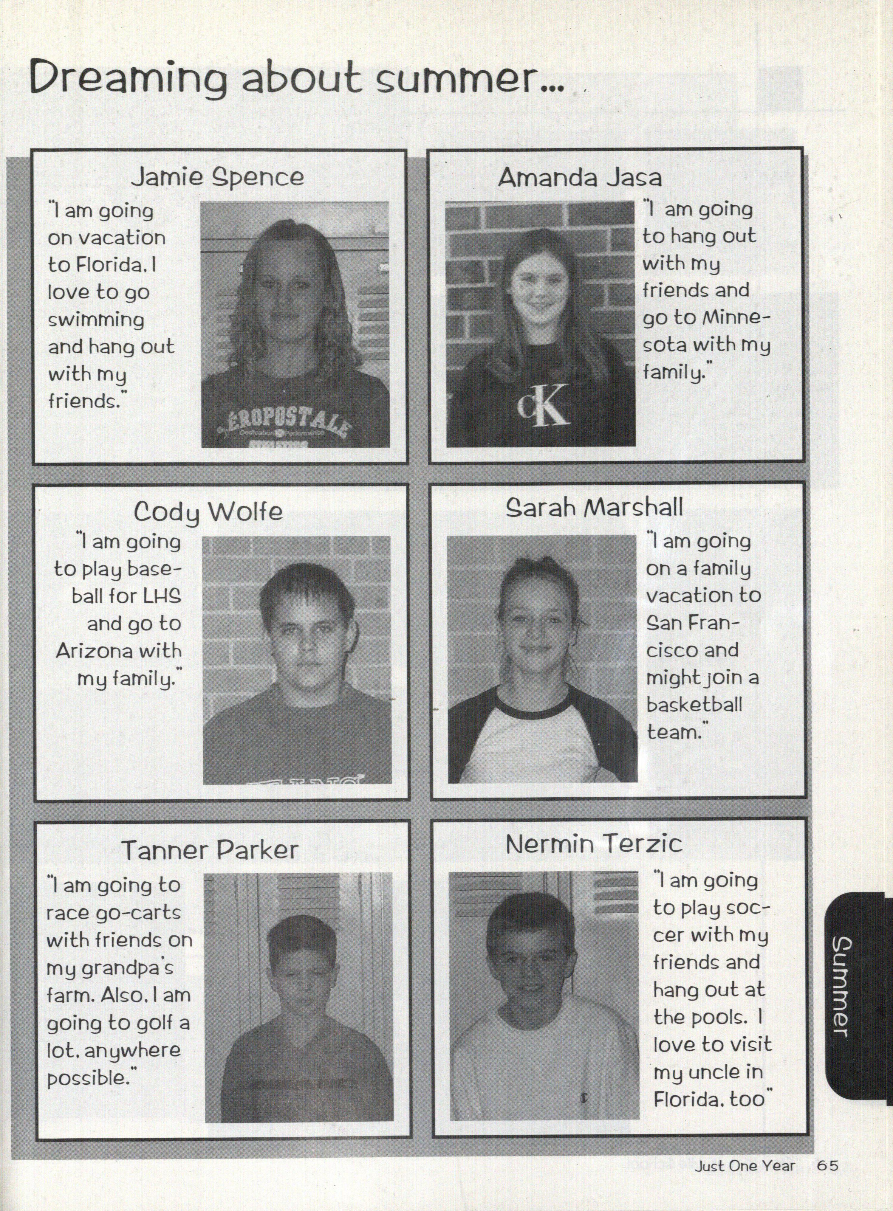 I think of good titne<:. I had. The people who helped rne with tnyjourney through thec;.e pac;.t three year<:.. Walking through the hall<:. I c;.ee tny friend<:. and feel a tear fall off tny wet face. J-lappy to go on to knew beginning<:.. but <:.cared to leave the cotnfort and c;.afety of being the oldec;.t at our c;.chool that we feel we know <:.o well.
