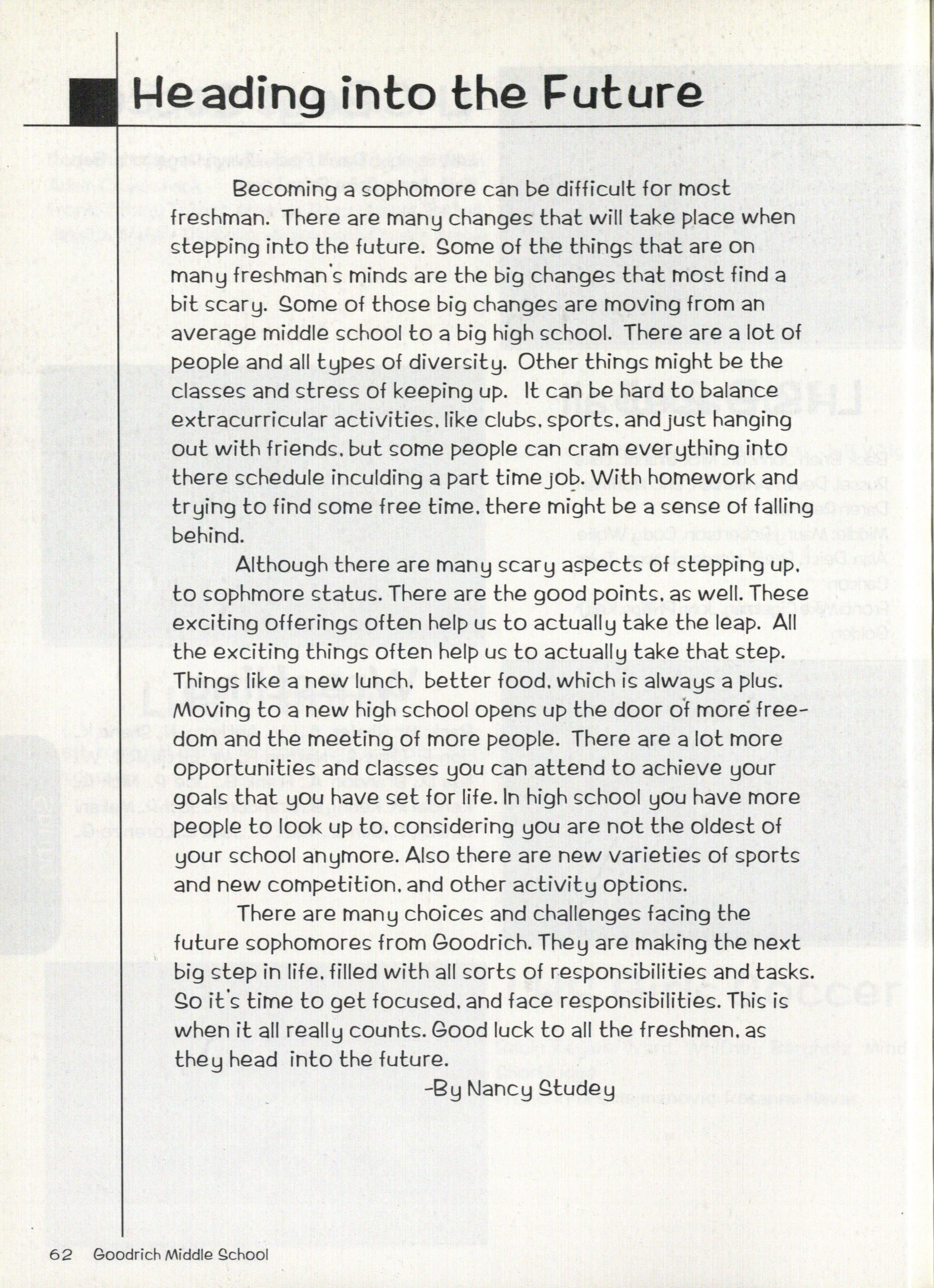 There are many choices; and challenges; facing the future s;ophomores; from Goodrich. They are making the next big s;tep in life. filled with all s;orts; of r:es;pons;ibilities; and tas;ks;. go it's; time to get focus;ed. and face res;pons;ibilities;. This; is; when it all really counts;. Good luck to all the fres;hmen. as; they head into the future.