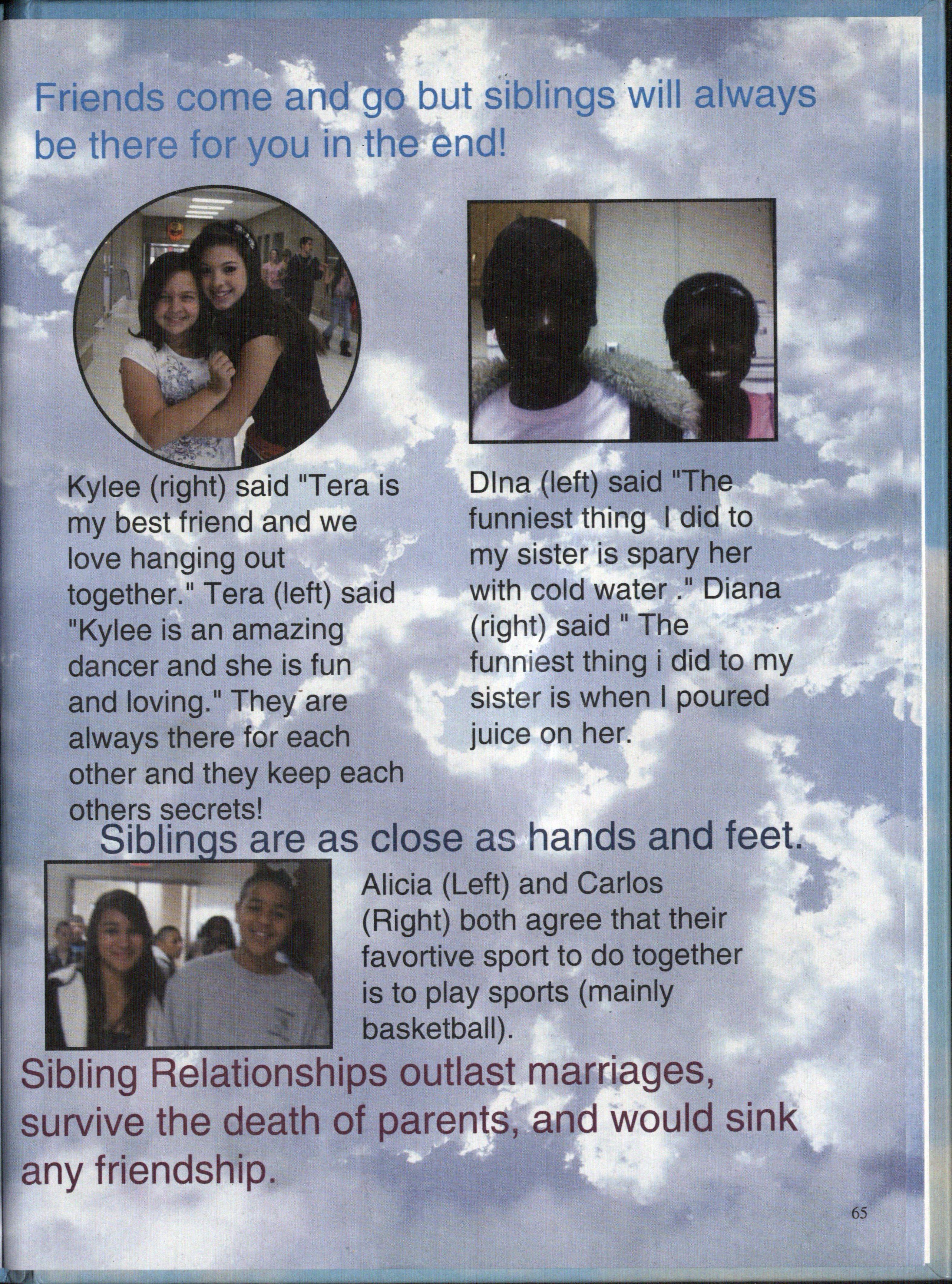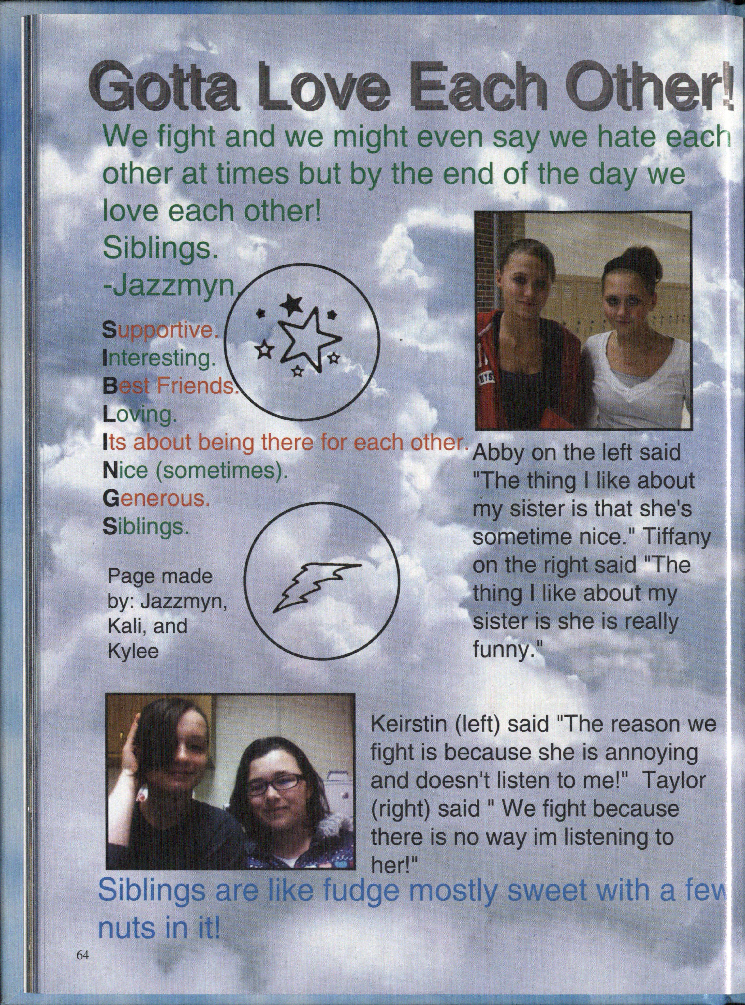 Generous. Siblings. Page made by: Jazzmyn, Kali, and Kylee thing I like about my sister is she is really funny."
