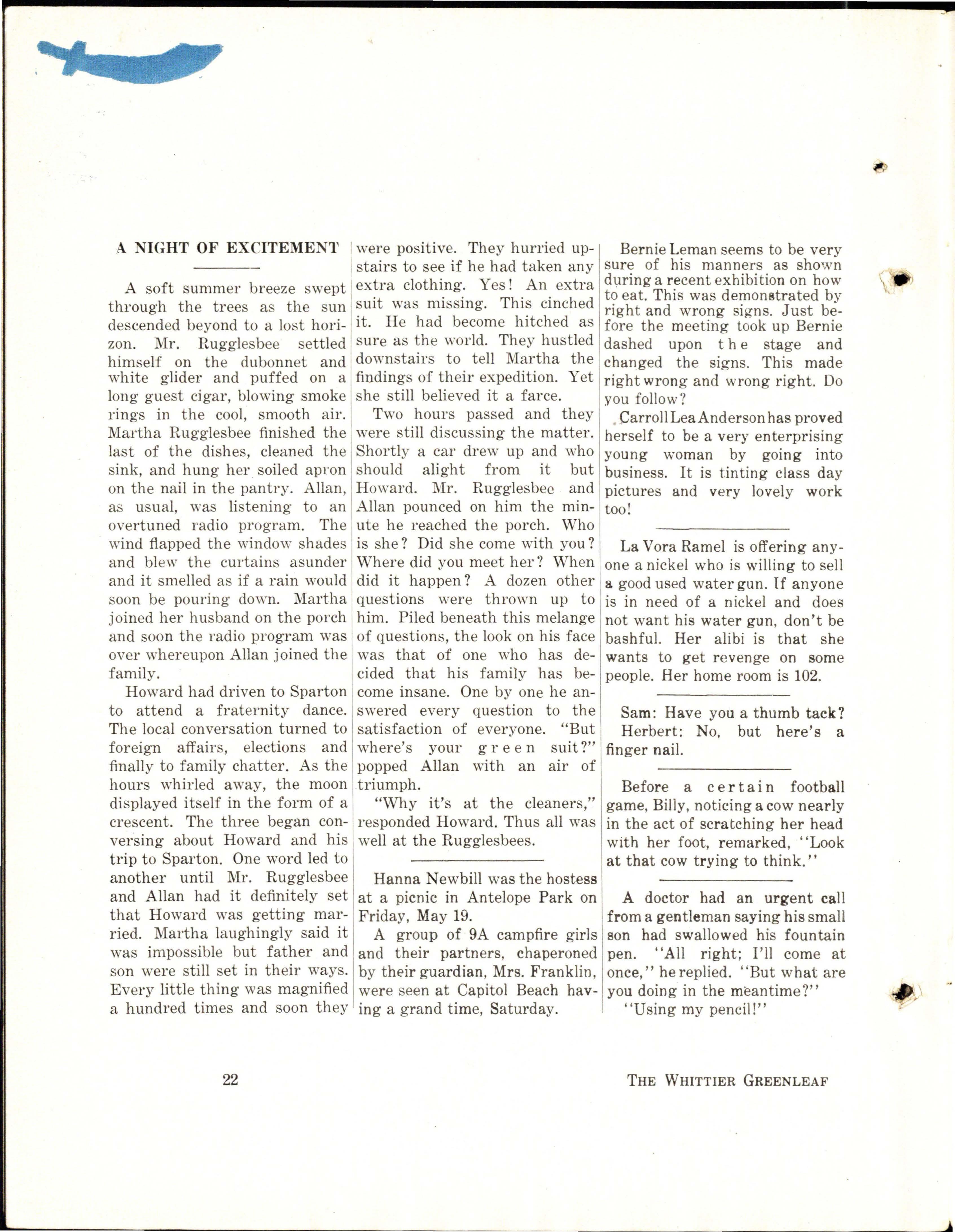 The excited giggle of a group of girls watching an unaware young chap striding down the hall, the rush from class to class, the excitement of watching a game in the large gymnasium or on the spacious playground, or little incidents which fate plays upon us. These will all be remembered by those who have gone through Whittier Junior High under the guidance of the kind and understanding hand of the principal, Mr. Culler, and the faculty.