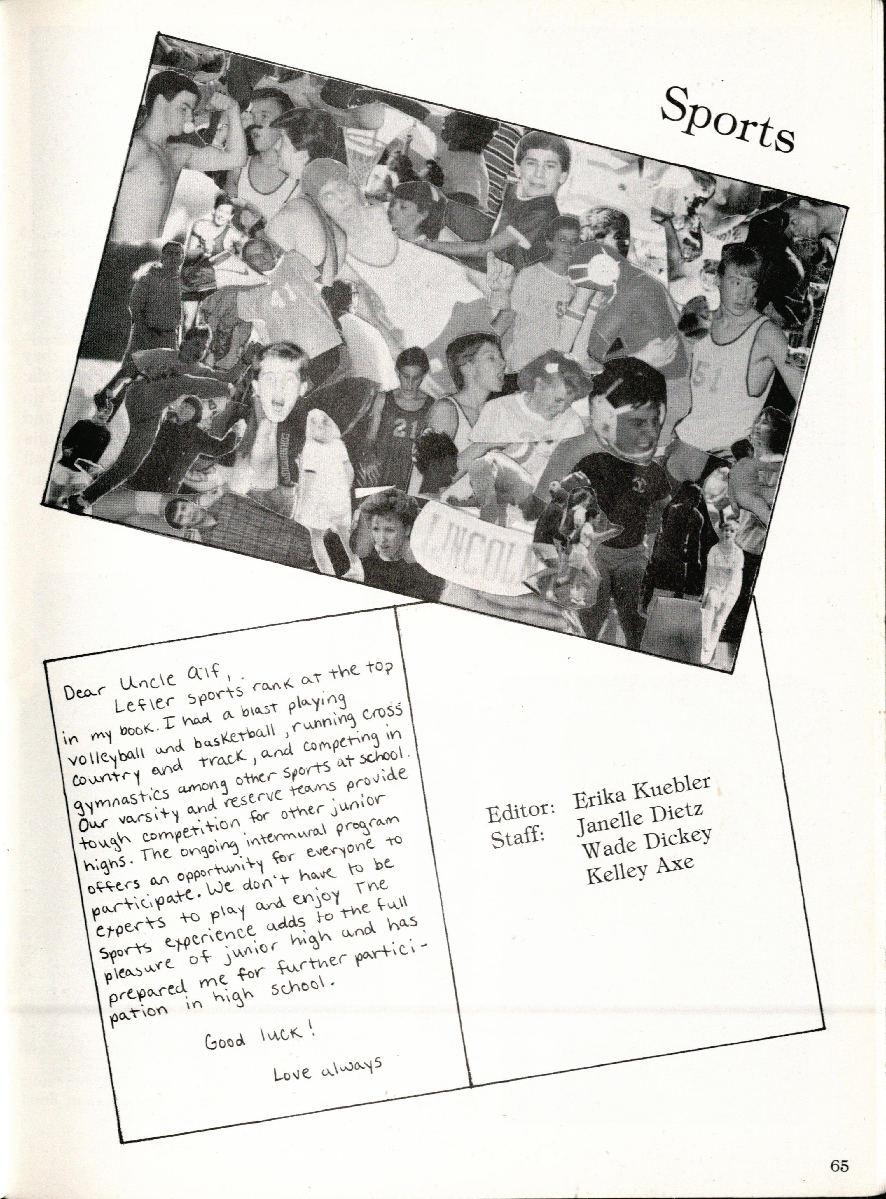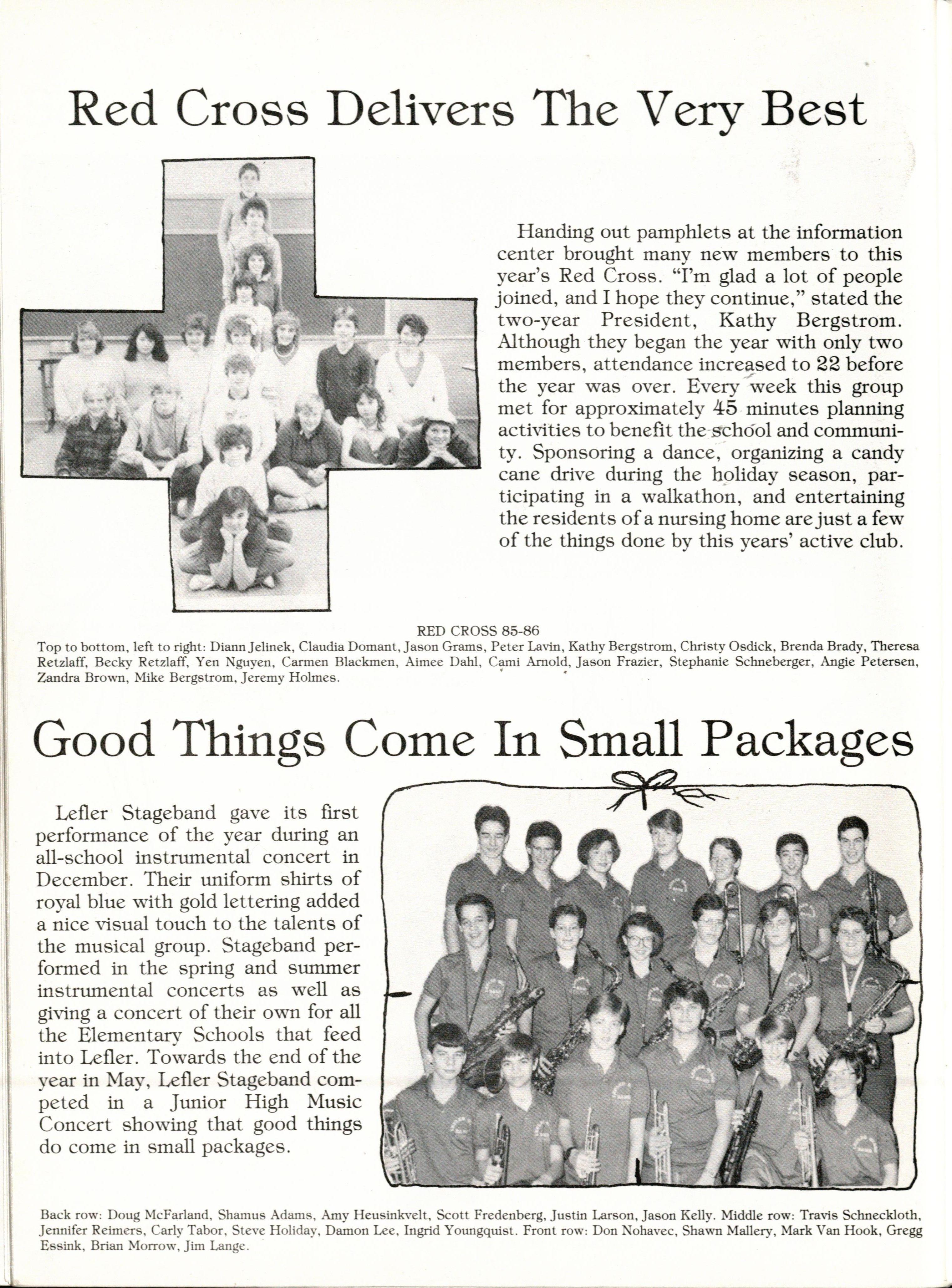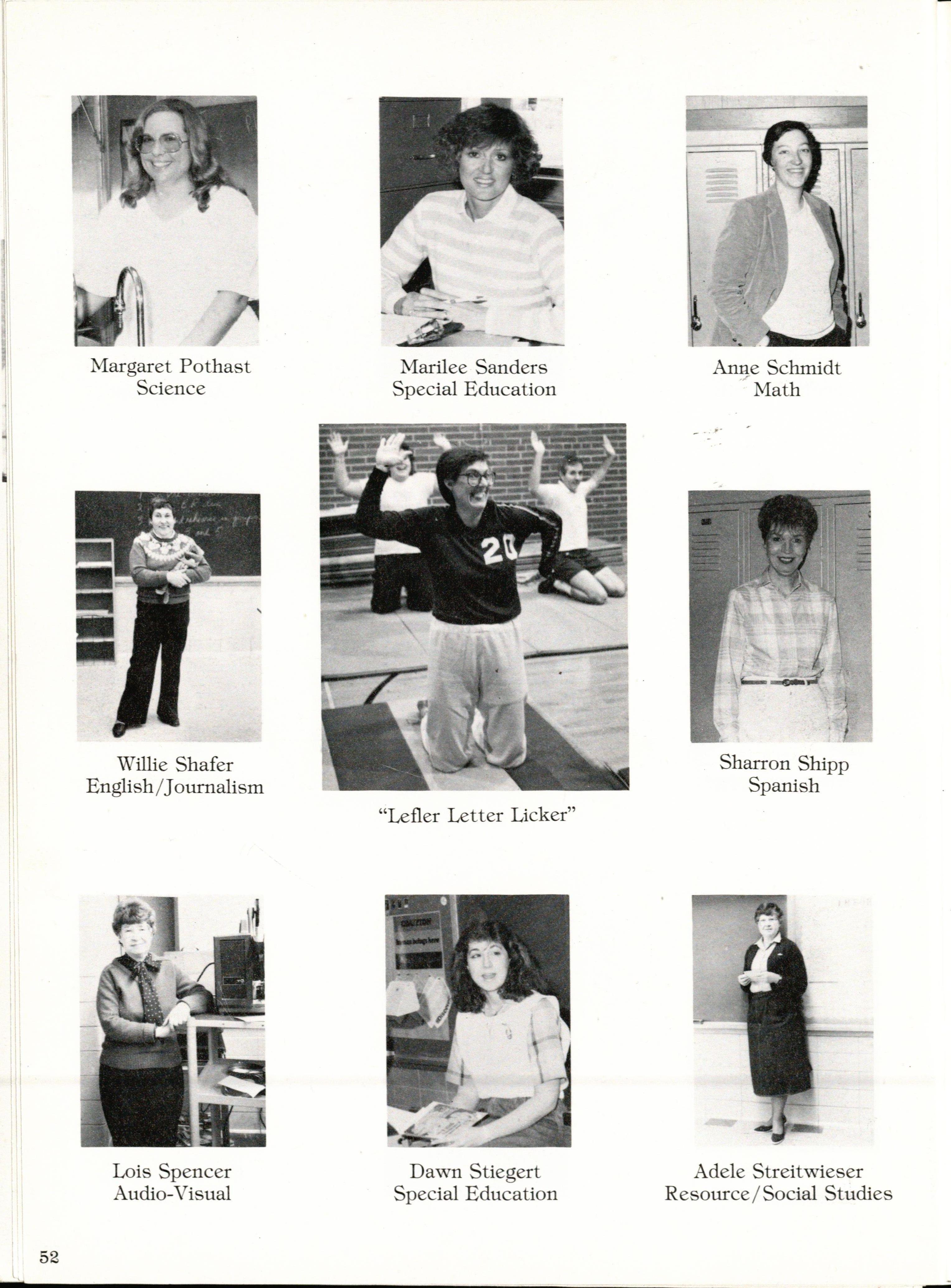 Lefler defmitely experienced an excellent ear. The begin- ning of the year started out a little hectic a u ual, getting all of the new tu dent u ed to their surroundings. Fortunatel thing ettled do n a bit. tudent and facult began to feel the re u1 ts of the lon~ r chool da . School pirit ran high second seme ter a the tudent bod worked together elling magazine in order to earn enough money for a ne fitne trail. However, January 28 marked a da of traged no on1 for Lefler but the whol country. The pac huttle Challenger exploded 72 econd after liftoff. In addition to the ix a tronaut on board, there wa al o a chool teacher from Connecticut. Lefler recognized thi event by rai ing the flag half mast in their memory. As chool pirit dropped toward the end of the ear, tudent Council picked it up during pirit Week. The whole school was involved with Silver creen Day, a -Talent Show, and Field Da . All in all thi a a Red Letter Year.