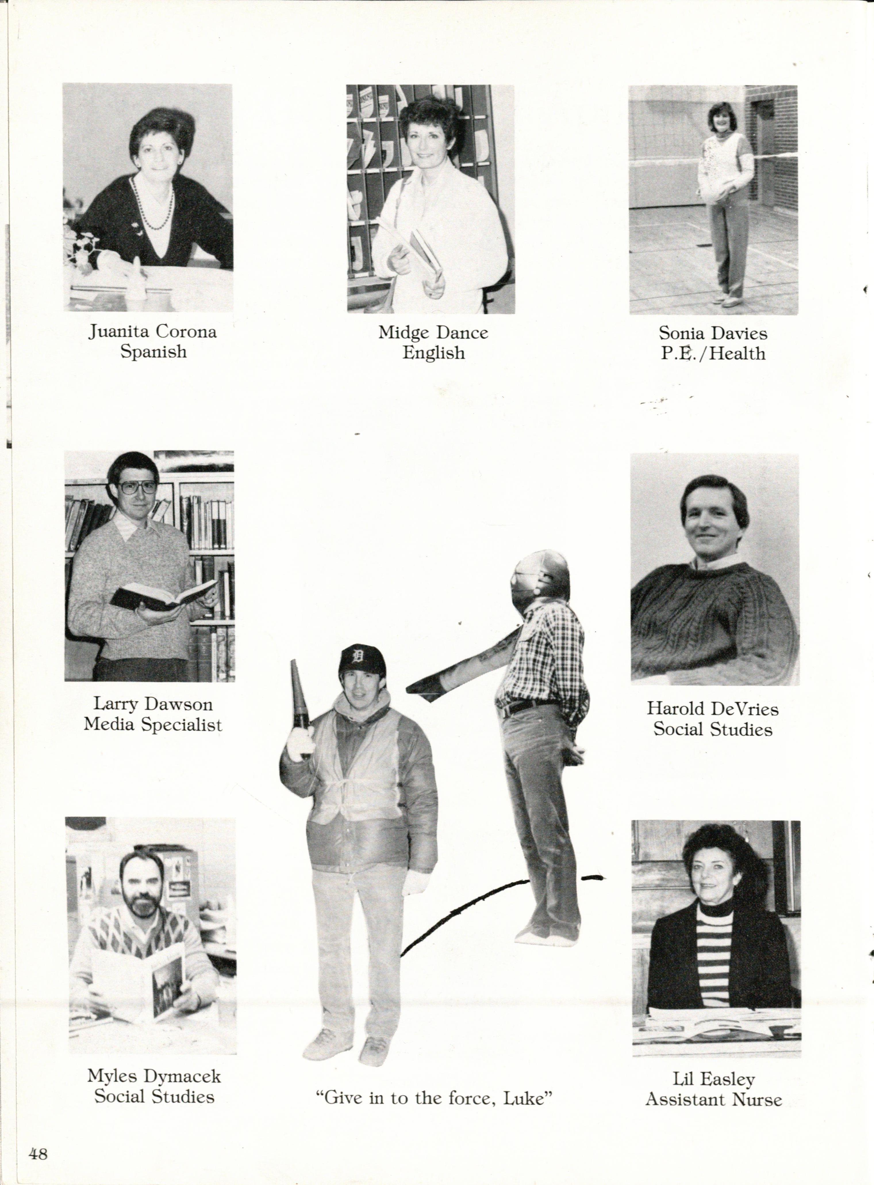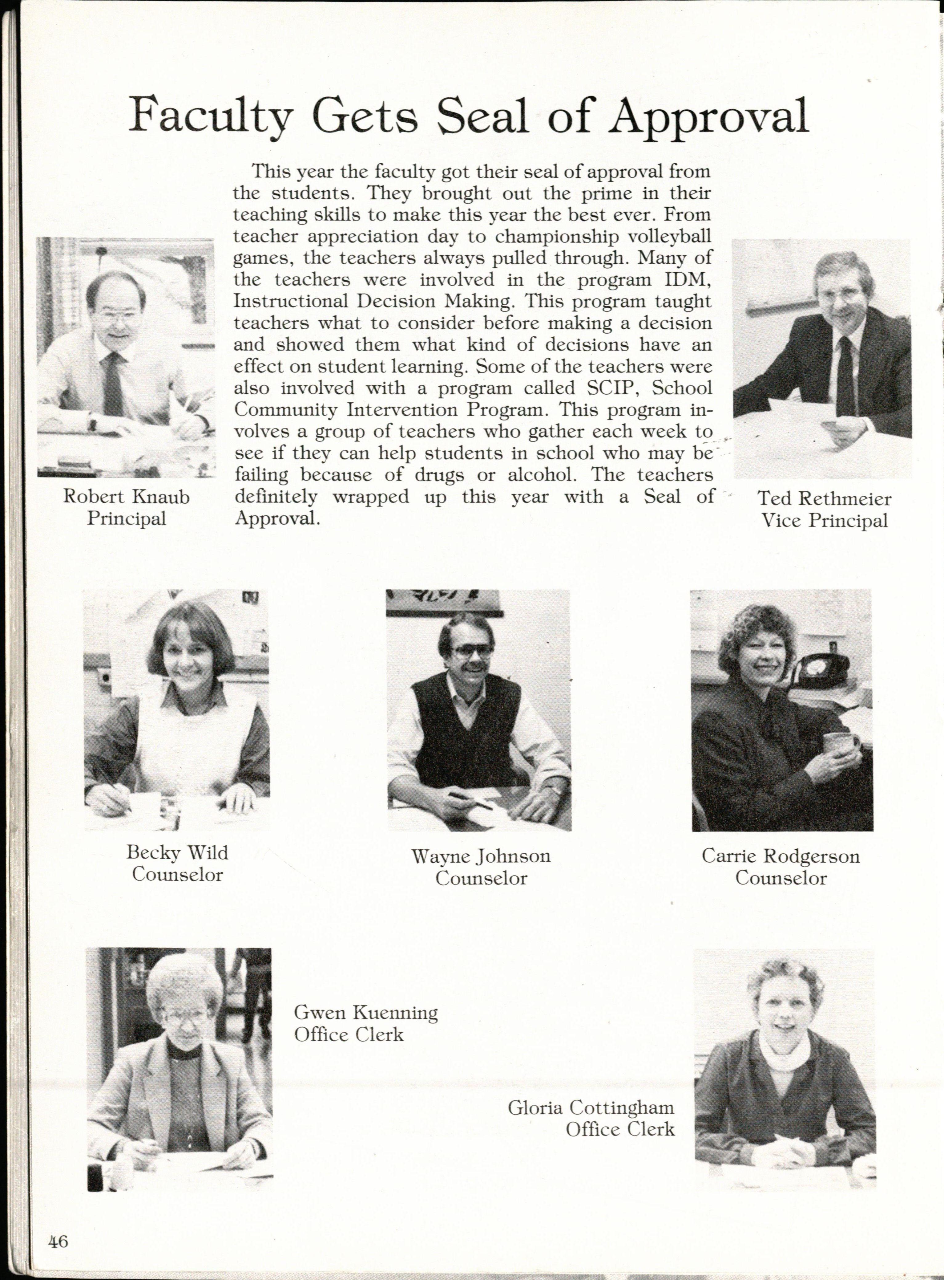 This year the faculty got their seal of approval from the students. They brought out the prime in their teaching skills to make this year the best ever. From teacher appreciation day to championship volleyball games, the teachers always pulled through. Many of the teachers were involved in the program IDM, Instructional Decision Making. This program taught teachers what to consider before making a decision and showed them what kind of decisions have an effect on student learning. Some of the teachers were also involved with a program called SCIP, School Community Intervention Program. This program involves a group of teachers who gather each week to ~_ see if they can help students in school who may be-~ · failing because of drugs or alcohol. The teachers defmitely wrapped up this year with a Seal of Ted Rethmei er Approval. Vice Principal